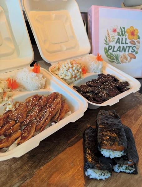 カカアコのヨガ・アンダー・ザ・パームス内にオープンしたヴィーガンカフェ「オールプランツ」。メニューにはスパムむすびやカルビ、プルコギなどがあり、どれもプラントベースで作られている。