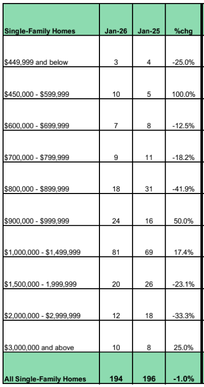 1月に成約した戸建て物件の最多価格帯は、100万ドル〜150万ドル未満の中間価格のレンジで81件となった。また全制約件数の約60%は、80万ドル〜139万9,999ドルの価格帯に集中した。このレンジでは、売り出し価格以上での成約割合も高く、需要の底堅さが顕著である。