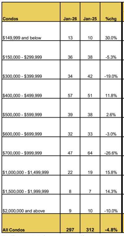 コンドミニアム市場は多くの価格帯で概ね安定しているが、70万ドル〜90万ドル未満の価格帯では成約件数が前年同月比29.8%減の40件と大きく減少した。