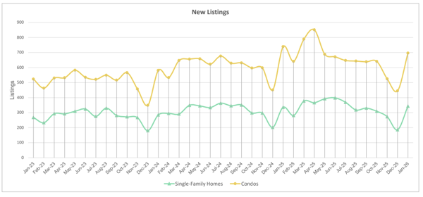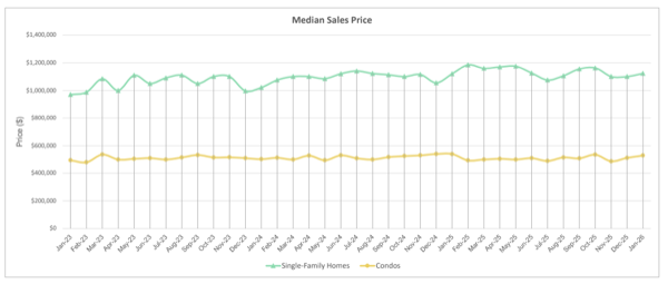 2026年1月の戸建ての中間価格は1,122,500ドルで、前年同月比0.2%の微増にとどまり、価格は安定水準を維持している。平均価格は1,396,618ドルで、前年同月比3.9%上昇、高価格帯物件の動きが平均価格を押し上げている。