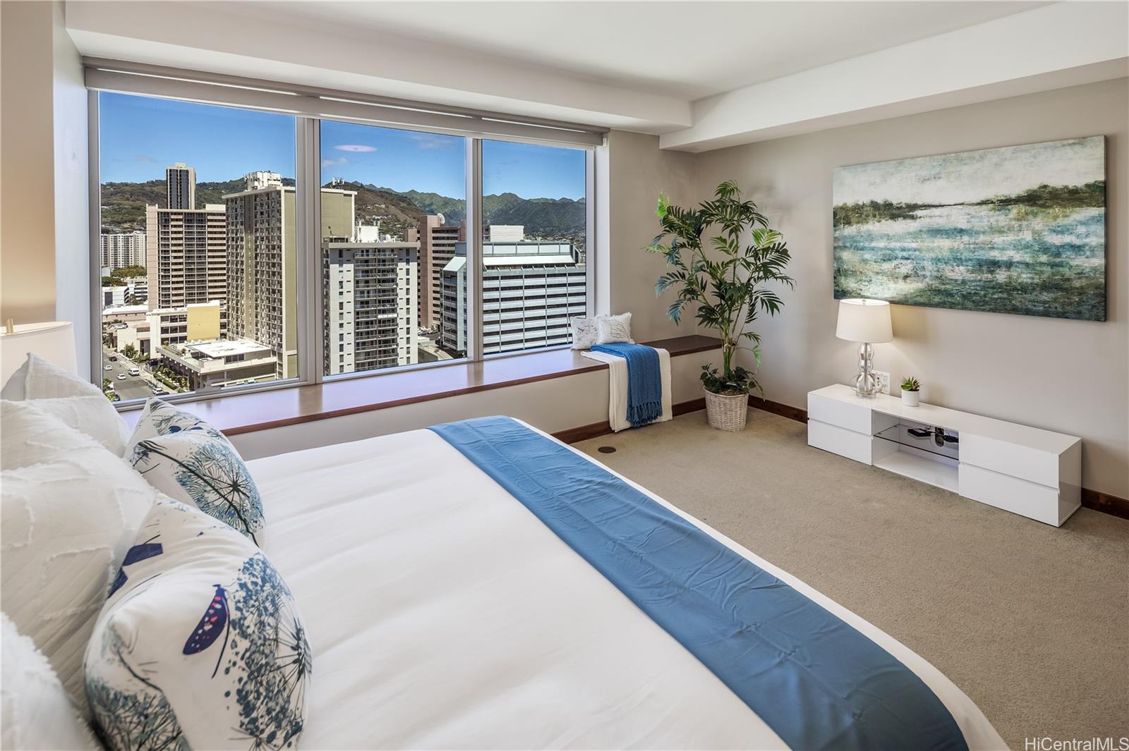 Hardwood floors were refinished just before listing, enjoy cooking with gas, Sub Zero refrigerator and Miele appliances. An open concept design in the kitchen, dining, and living, 2 en-suite bedrooms, guest bedroom, and a guest bathroom. Two side-by-side parking stalls are included, offering direct elevator access to the residence floor without the need to transfer. All furnishings can be included, making the transition effortless for the new owner. The ultimate convenience of daily living with direct access to Ala Moana Center. Shop daily essentials with Foodland Farms, Target, Long’s Drug Store, restaurants from fine dining to food court, and luxury shopping at your finger tips. Resort like amenities include: infinity pool, hot tub, sauna, fitness center, dog park, children’s playground, movie room, private dining, chefs kitchen, guest suites, library, conference room, and more. Secured parking with 24 hour concierge service.
