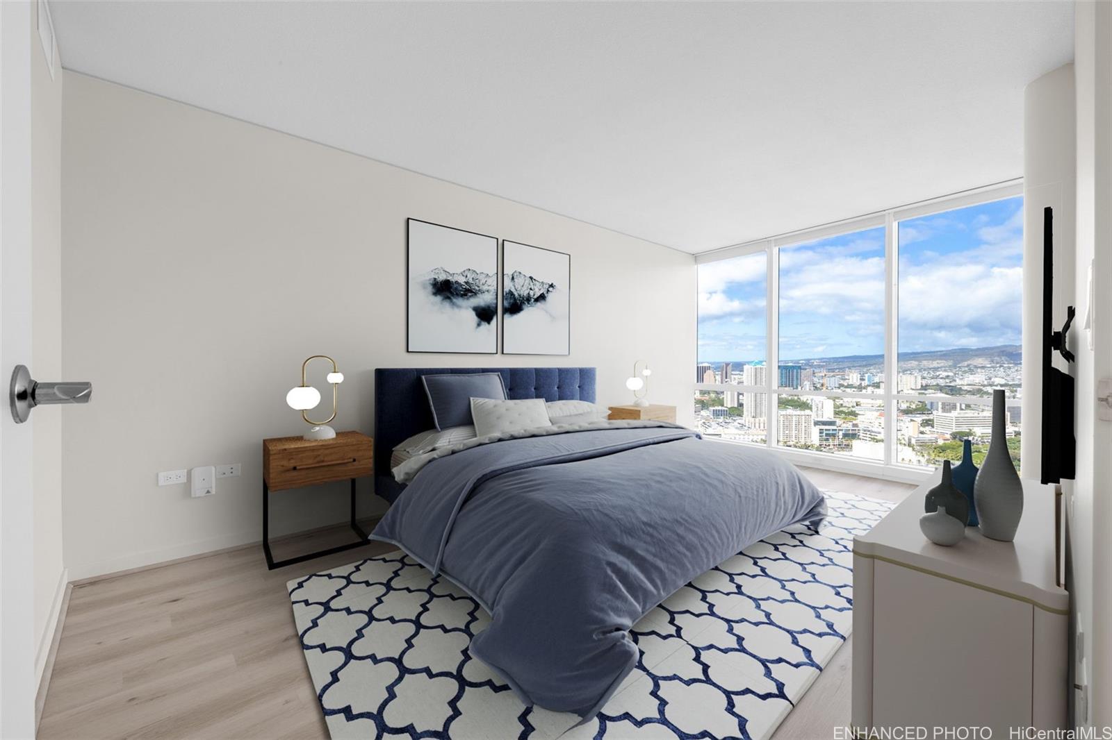 TWO (2) PARKING STALLS near elevator. High 47th Floor Below Penthouse! 2-bedrooms, 2-baths, 2-Parking Stalls on the Desirable Cooler side of the building. NEW Luxury Vinyl Planks Flooring, New Water Heater installed 12/8/22, Refrigerator, Electric Range, Dishwasher installed 3/2/20. Amenities include 24/7 Live Security, 2-Tennis/Pickleball courts, Golf putting green and driving cages,