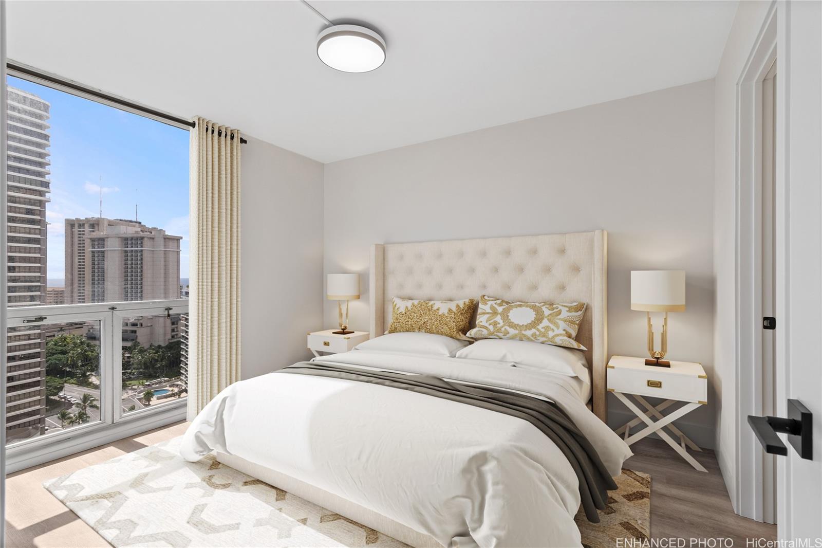 Experience the best of Waikiki living in this fully renovated 2-bed, 2-bath residence in the highly sought-after Waipuna, which showcases ocean and Diamond Head views. No detail was spared in this meticulous, top-to-bottom renovation. The home features split A/C systems in every room. The spacious primary suite impresses with a dual-sink vanity, a large shower with bench seating, an upgraded shower system, and spacious closet with abundant storage.