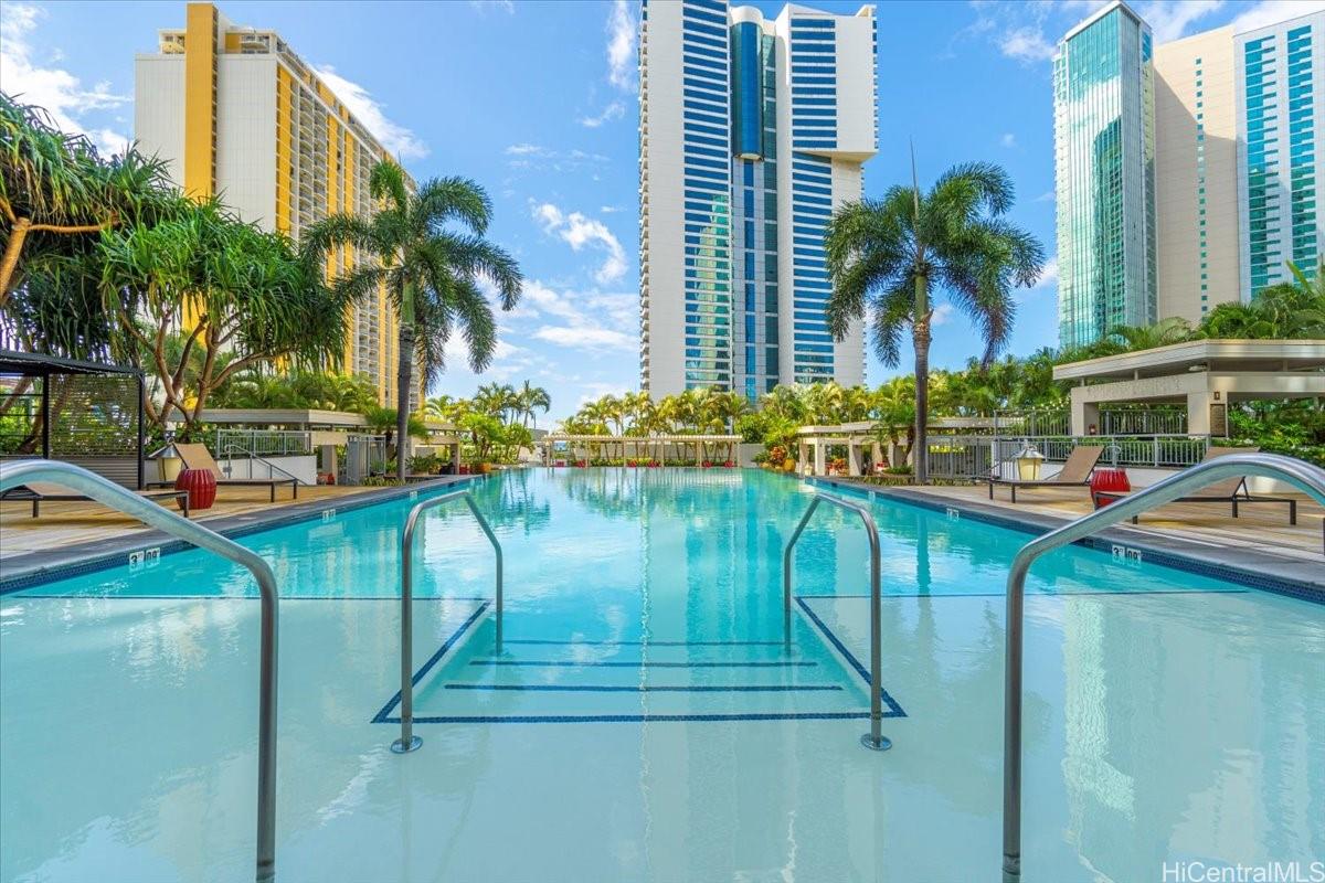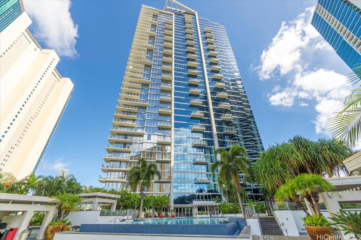 Presenting an exquisite 2-bedroom residence at Waihonua, featuring a custom-designed layout and a 64 sq. ft. balcony that seamlessly connects indoor and outdoor living—creating a spacious ambiance ideal for both relaxation and productivity. This residence offers breathtaking views of Magic Island, Ala Moana Beach Park, and the ocean. Thoughtfully upgraded throughout, it features luxurious Brazilian hardwood flooring, a sophisticated closet system, elegant light fixtures, electric shades, and more—epitomizing modern elegance and meticulous attention to detail. Conveniently located near Ala Moana Shopping Center, Ala Moana Beach Park, and Ward Village, the home provides easy access to premier shopping, dining, and entertainment. Enjoy resort-style amenities, including an infinity pool, hot tub, BBQ pavilions, a party room with a full kitchen, movie theater, fitness center, yoga room, two guest suites, and electric vehicle charging stations.