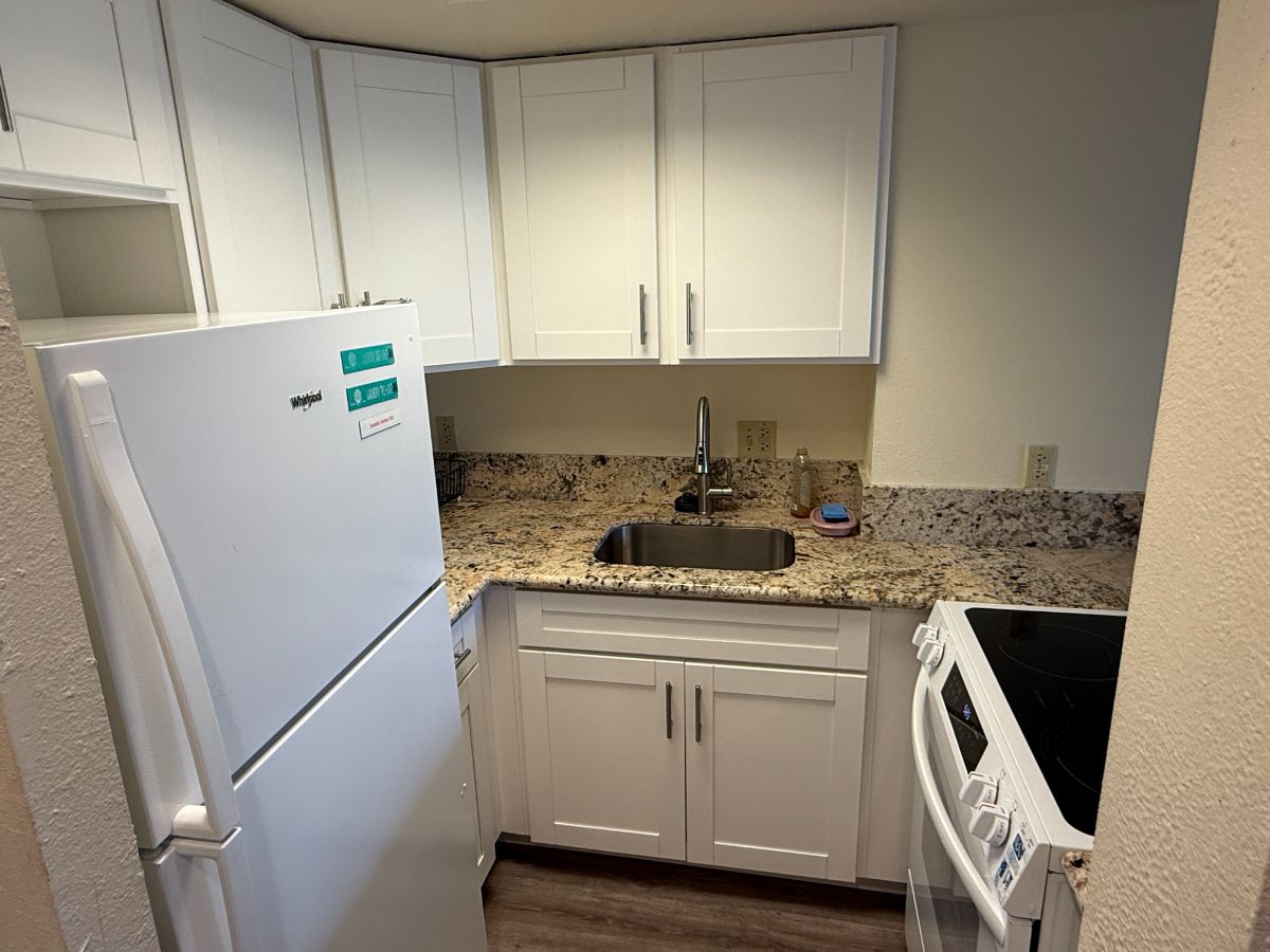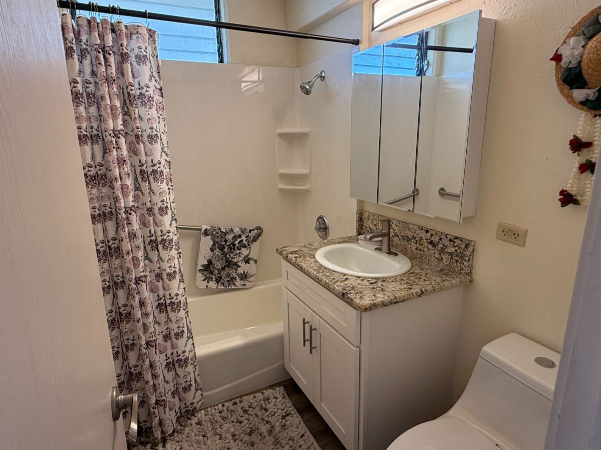 1ベッドルーム、1バス、家具付き、駐車場1台分付き(場所指定、屋根付き)但し小型車のみ(狭い急坂)