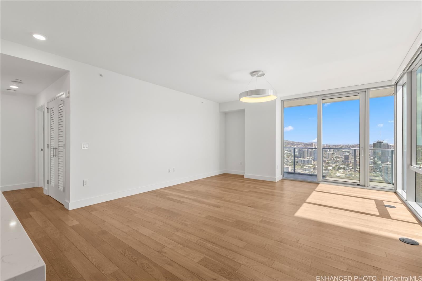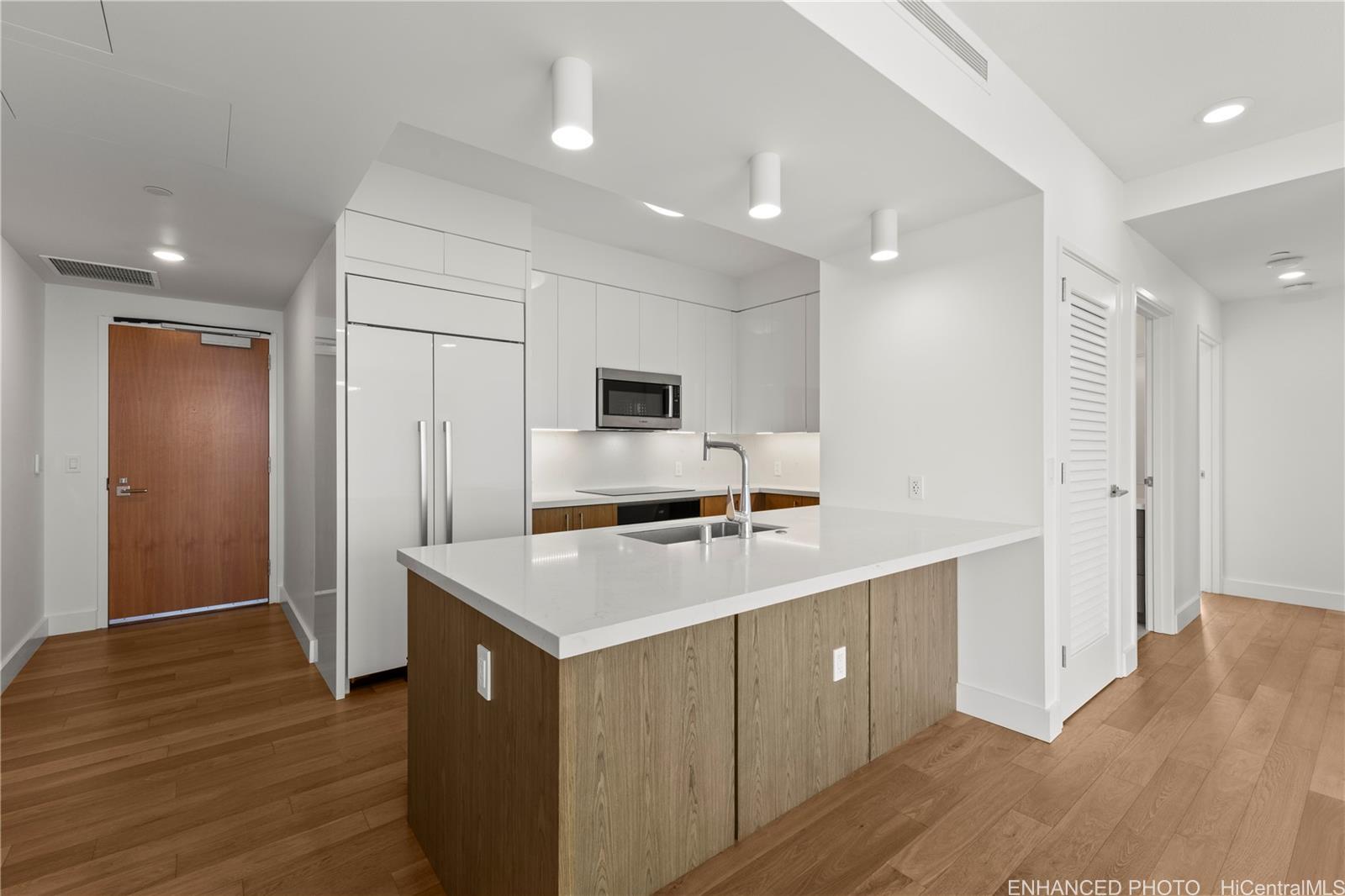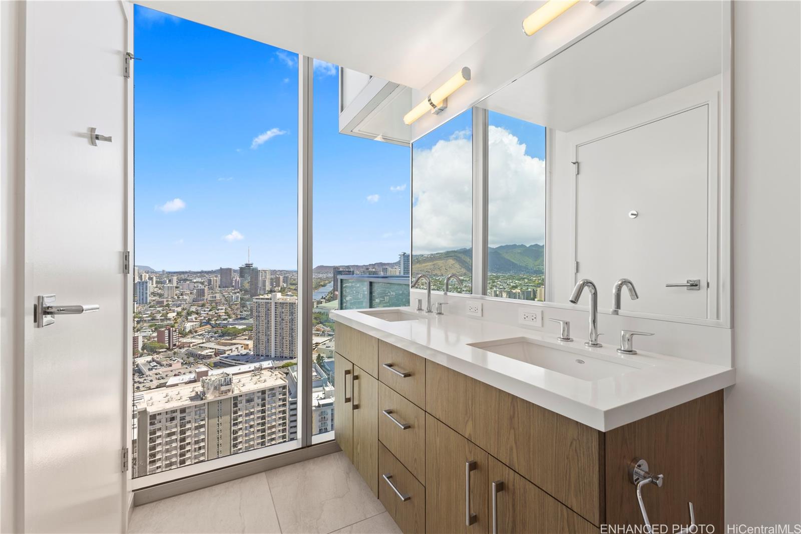 Experience modern urban living in the heart of Honolulu with this premium 2-bedroom, 2-bathroom corner unit at Azure Ala Moana. Situated on a desirable high floor with soaring 9-foot ceilings, this home offers both comfort and style. The kitchen features top-of-the-line appliances, including a Sub-Zero refrigerator, Bosch microwave, Wolf cooktop and oven, and Bosch dishwasher. The living room has roller shades, while all bedrooms are equipped with both roller shades and blackout curtains. A storage locker is conveniently located in your assigned parking stall, along with two side-by-side reserved covered parking spaces. Enjoy being just minutes from Ala Moana Center, Ala Moana Beach Park, Target, Sam’s Club, and a variety of dining options. Azure Ala Moana provides resort-style amenities such as a pool and jacuzzi, BBQ pavilions, movie theater, fitness center, bicycle and surfboard storage, guest suites, and high-speed Wi-Fi in amenity areas. The building also offers secured entry and 24-hour front desk service for added convenience and peace of mind. Discover the perfect balance of convenience, comfort, and luxury at Azure Ala Moana.