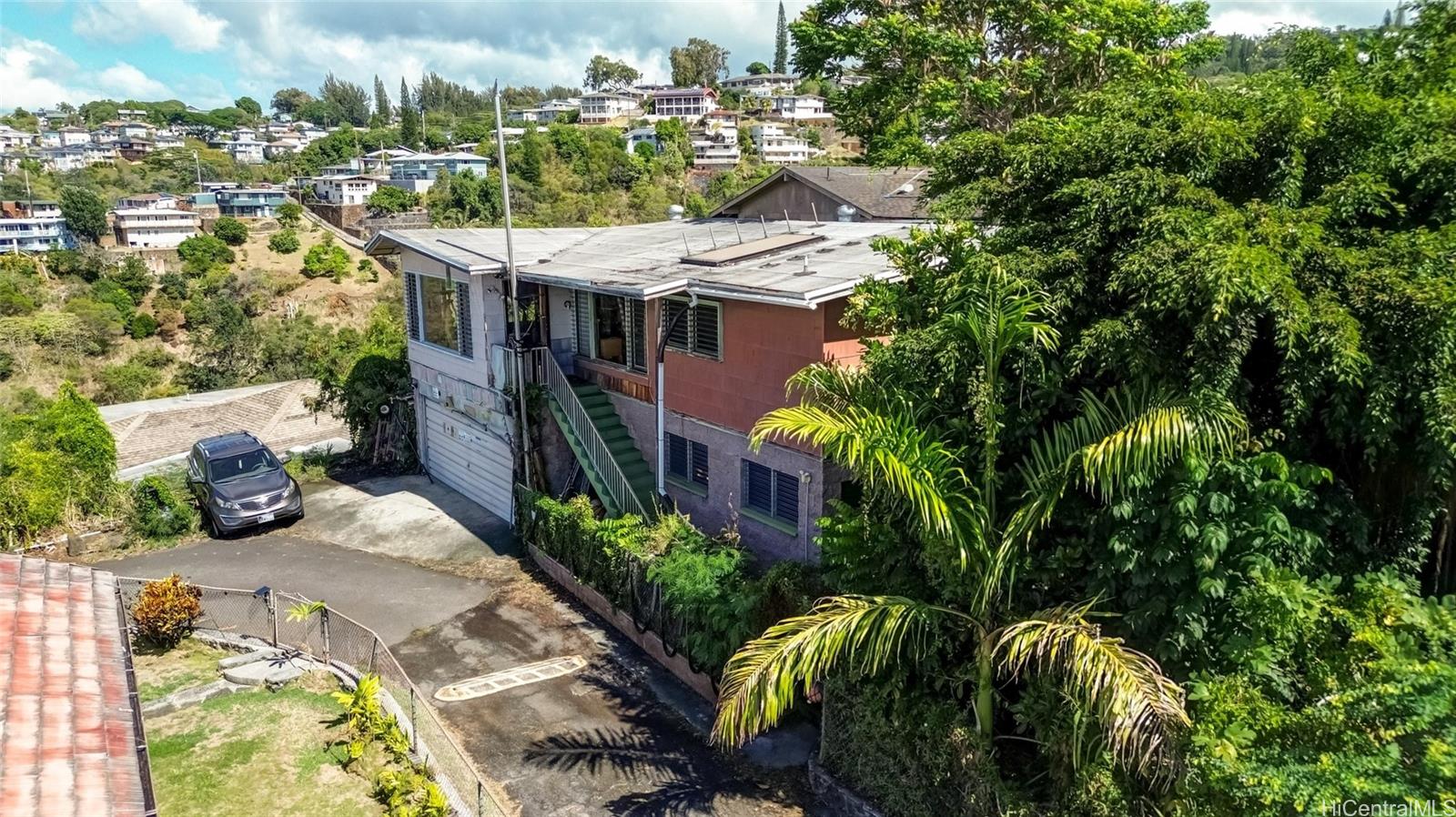 Rare opportunity to own a home in desirable Halawa Heights with no association fees! Longtime owner is selling this spacious 5-bdrm, 3-bath single-family home tucked away up a private, 50% OWNED driveway offering privacy, comfort, and sweeping views of Pearl Harbor and the valley. This unique property is perfect for MULTIFAMILY living or RENTAL, with a flexible layout that provides separate entrances upstairs and downstairs. Grandfathered to allow full kitchens in both the upstairs which is 3 bedrooms, 2 bathrooms, and the downstairs which is 2 bedrooms, 1 bathroom. Interior plumbing upgrades were done.