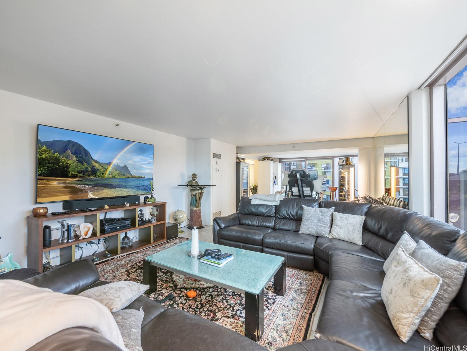 Experience the best of urban island living in this spacious 2-bedroom, 2-bath, 2-parking unit located in the heart of Kaka'ako- Hawaii's most dynamic and vibrant neighborhood. This low-floor corner unit features a generous lanai with tranquil tree-top and ocean views, perfect for relaxing or entertaining. Inside, the unit boasts a sleek, glossy ceiling and large living room mirrors that enhance light and space with wall to wall porcelain plank tile flooring. The recently renovated kitchen is both modern and functional, showcasing wide quartz countertops and island, ample cabinetry and drawers, newer appliances, and a built-in bar. Comfort is ensured with a rebuilt A/C system and new thermostat. The primary suite includes walk-in closet and an ensuite bathroom with updated shower tile. Floor-to-ceiling windows and sliding doors complete with new drapes and blinds fill the living and dining areas with natural light, creating a bright, townhouse-like atmosphere with the security and convenience of condo living. Enjoy access to impressive amenities including two fire pits, party cabanas, and more. Ideally situated near SALT, downtown, Aloha Tower, hospitals, beaches, & restaurants.