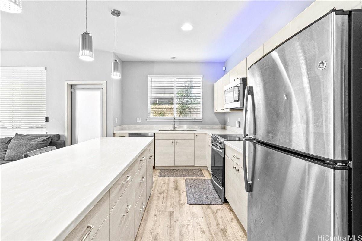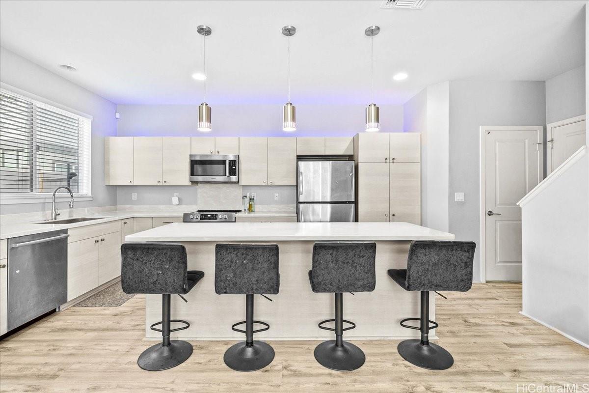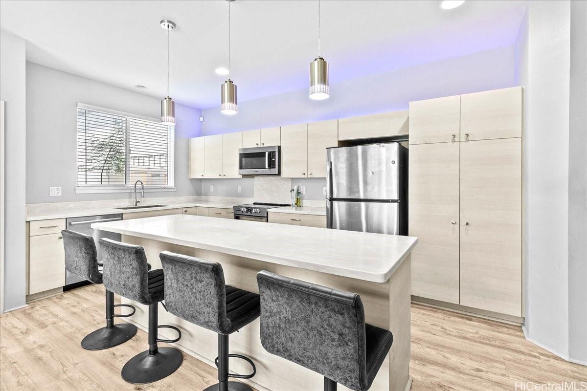 シーブリッジコミュニティの91-1159 Kamakana St、ユニット310にある、楽園のような住まいへようこそ。美しくデザインされた2階建てのこの住宅は、モダンな仕上げと快適なアイランドライフがシームレスに融合しています。3ベッドルーム、2.5バスルームを備え、9フィートの天井高とリビング、ダイニング、キッチンエリア間の明るい動線により、開放的で風通しの良い空間が広がります。屋外には、屋根付きのベランダと人工芝のフェンスで囲まれた庭があり、リラックスしたり、パーティーを開いたりするのに最適です。維持管理もほとんど必要ありません。2台分のガレージに加え、近くにゲスト用駐車場もございますので、便利です。シーブリッジは、ホワイトプレーンズビーチ、ラウラニ・ビレッジ・ショッピングセンター、カ・マカナ・アリイ、コストコ、カポレイ・コモンズに近い便利な立地で、ショッピング、レストラン、公園へのアクセスも抜群です。