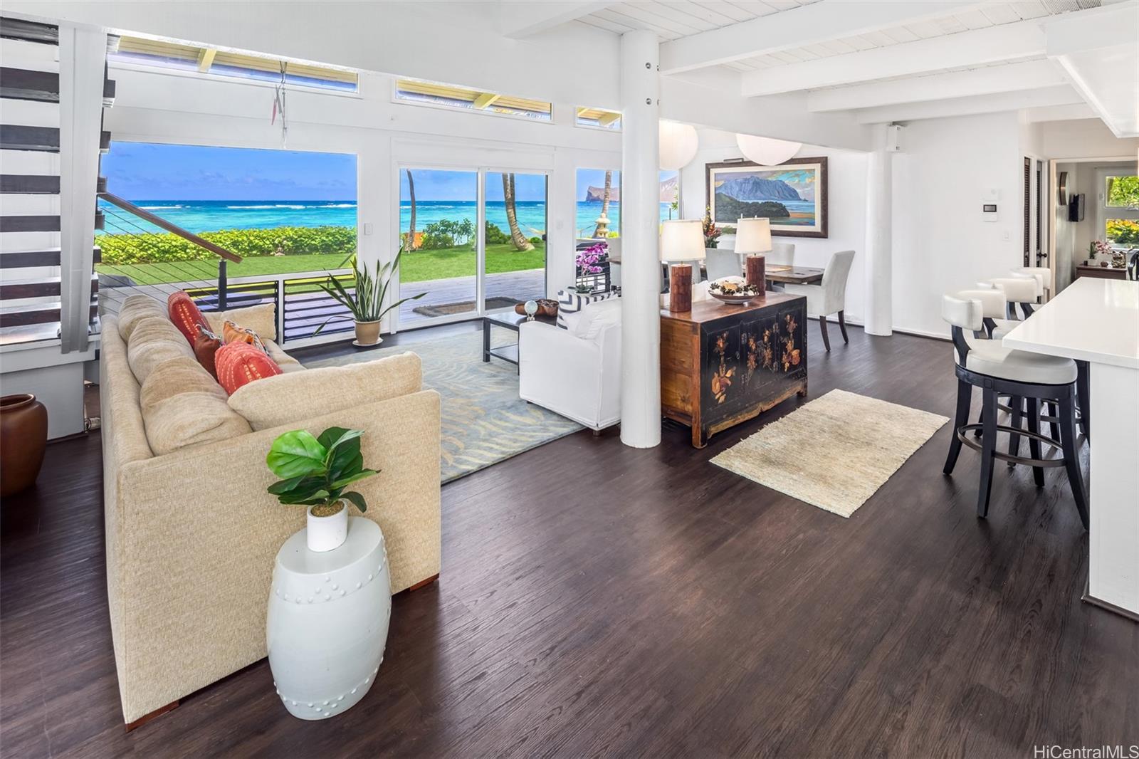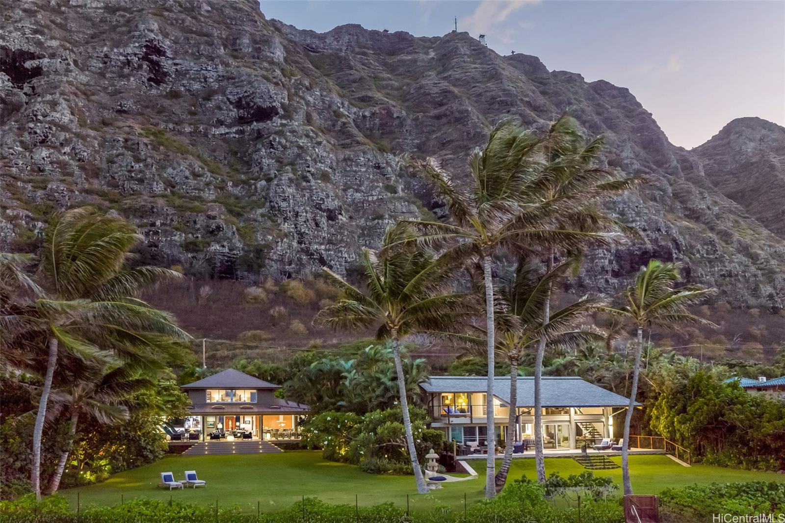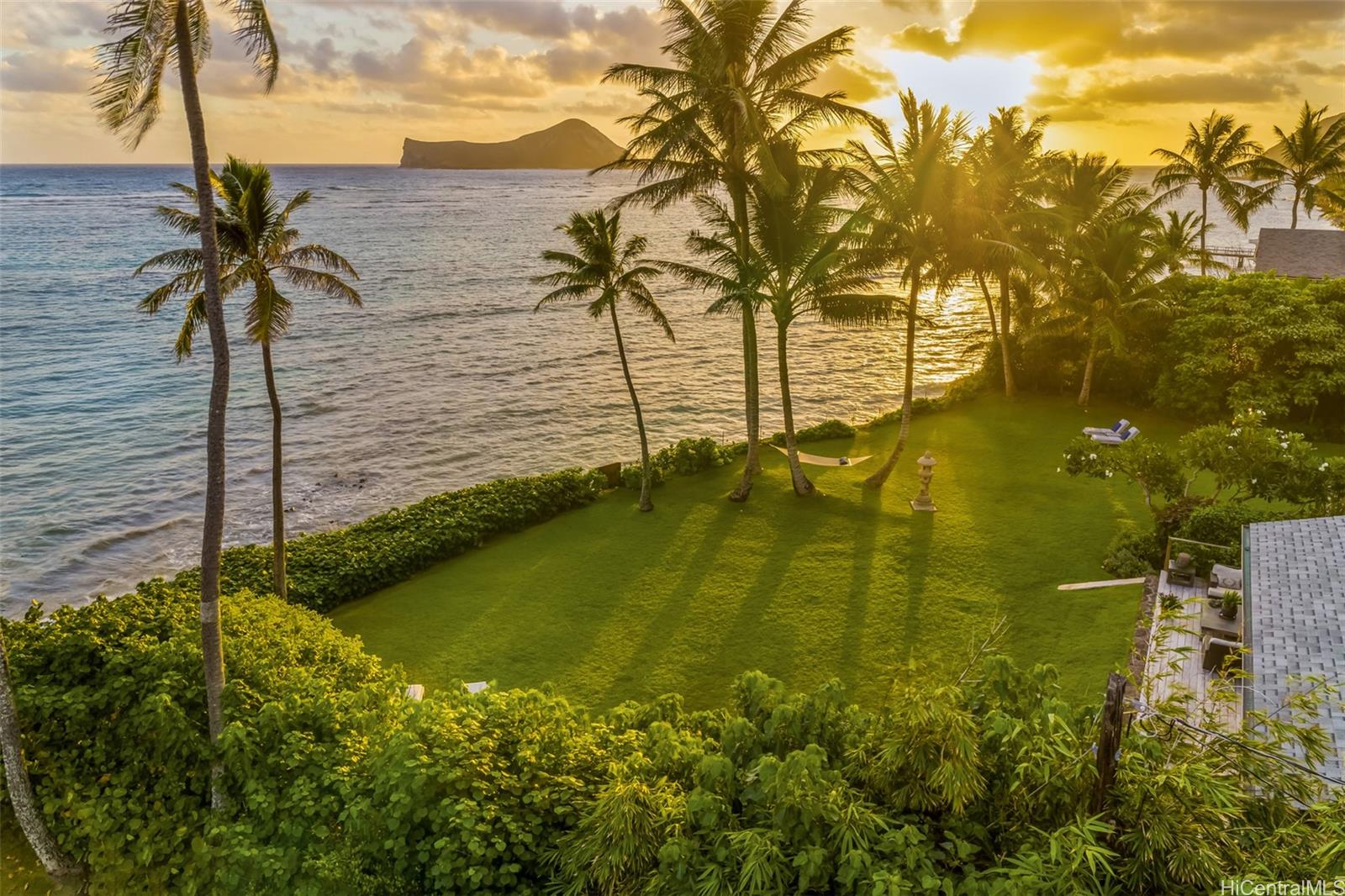 nearly 1 acre, this oceanfront property includes 152 linear feet along the Pacific Ocean. Nestled in a private, gated location, the 2 lot compound offers over 8600 sq ft of living area in its main house, guest house, cottage, and studio. Expansive lawns provide mesmerizing views across the ocean to Manama (Rabbit) Island and stunning vistas of the Koolau Mountains. The main house completed in 2022, sets a new standard of quality craftsmanship. Exceptional design, flawlessly executed using premium materials, creates a luxurious, beautiful, and comfortable home. Floor to ceiling sliding glass doors span the oceanfront side, providing spectacular views of the lush landscaping and ocean. The gourmet kitchen includes top of the line appliances, custom walnut cabinetry, and a disappearing pantry consistent with its sleek, modern design. Next door includes a 3BR oceanfront guest house, 2BR cottage and studio. This irreplaceable compound offers its next owner an opportunity to enjoy a spectacular lifestyle with family and friends in a magnificent oceanfront setting.