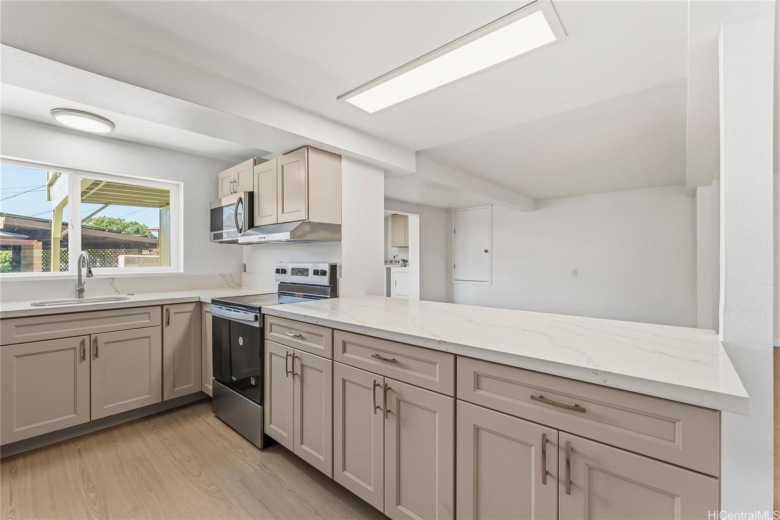 Step into this fully renovated corner-lot retreat featuring 5 bedrooms and 4.5 baths. Upstairs offers 3 bedrooms, 2.5 baths, a spacious dining area/living room, and sweeping ocean views from the balcony. Downstairs includes 2 bedrooms, 2 baths, private entry, and laundry. Ideal for large families, multi-generational living or an excellent rental income opportunity. Everything is new! Quartz countertops, vinyl windows, appliances, cabinets, flooring and bathrooms. Close to beaches, shopping, and everything you need. Don’t wait, this beauty won’t last!