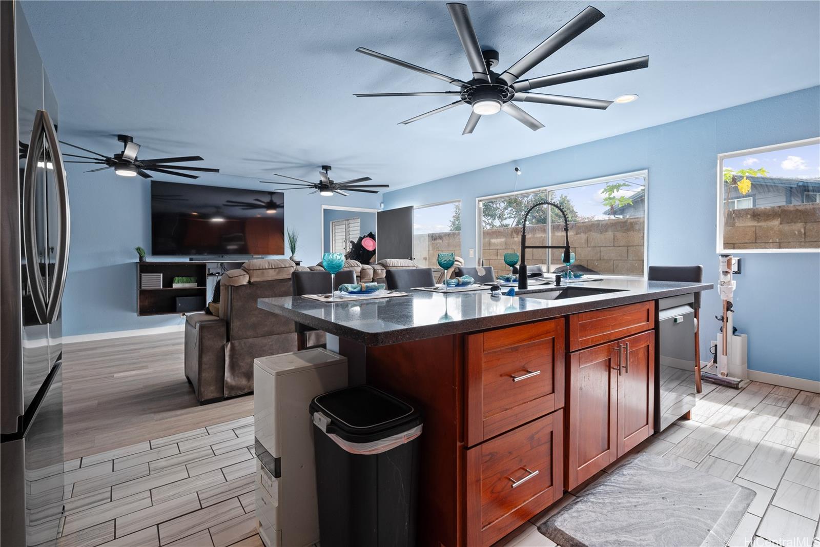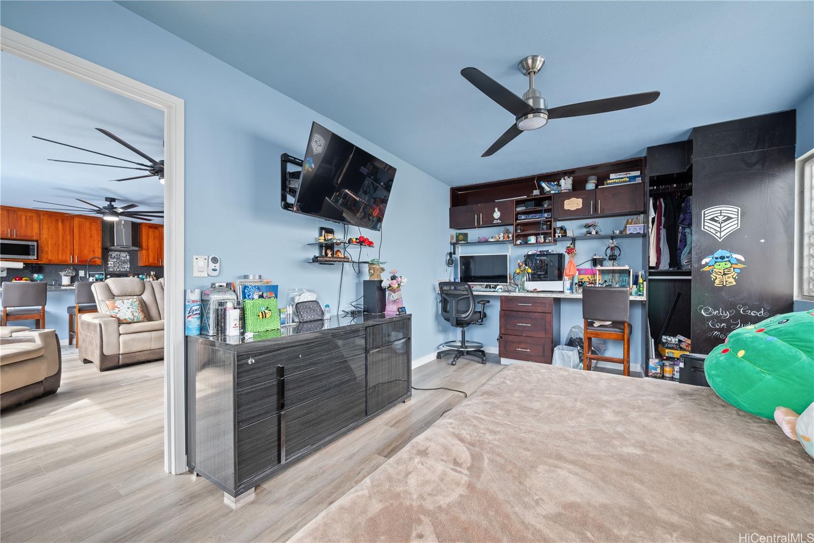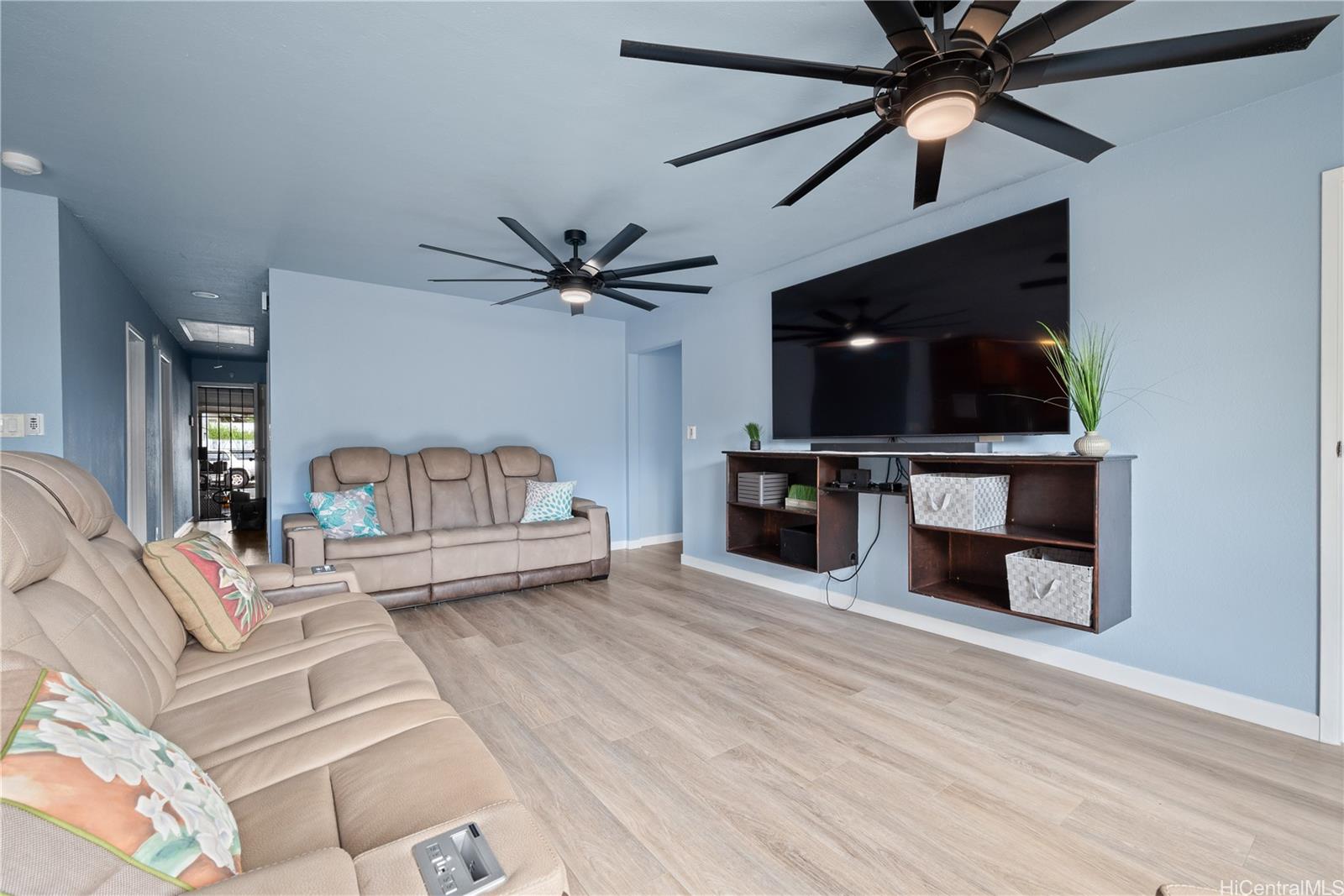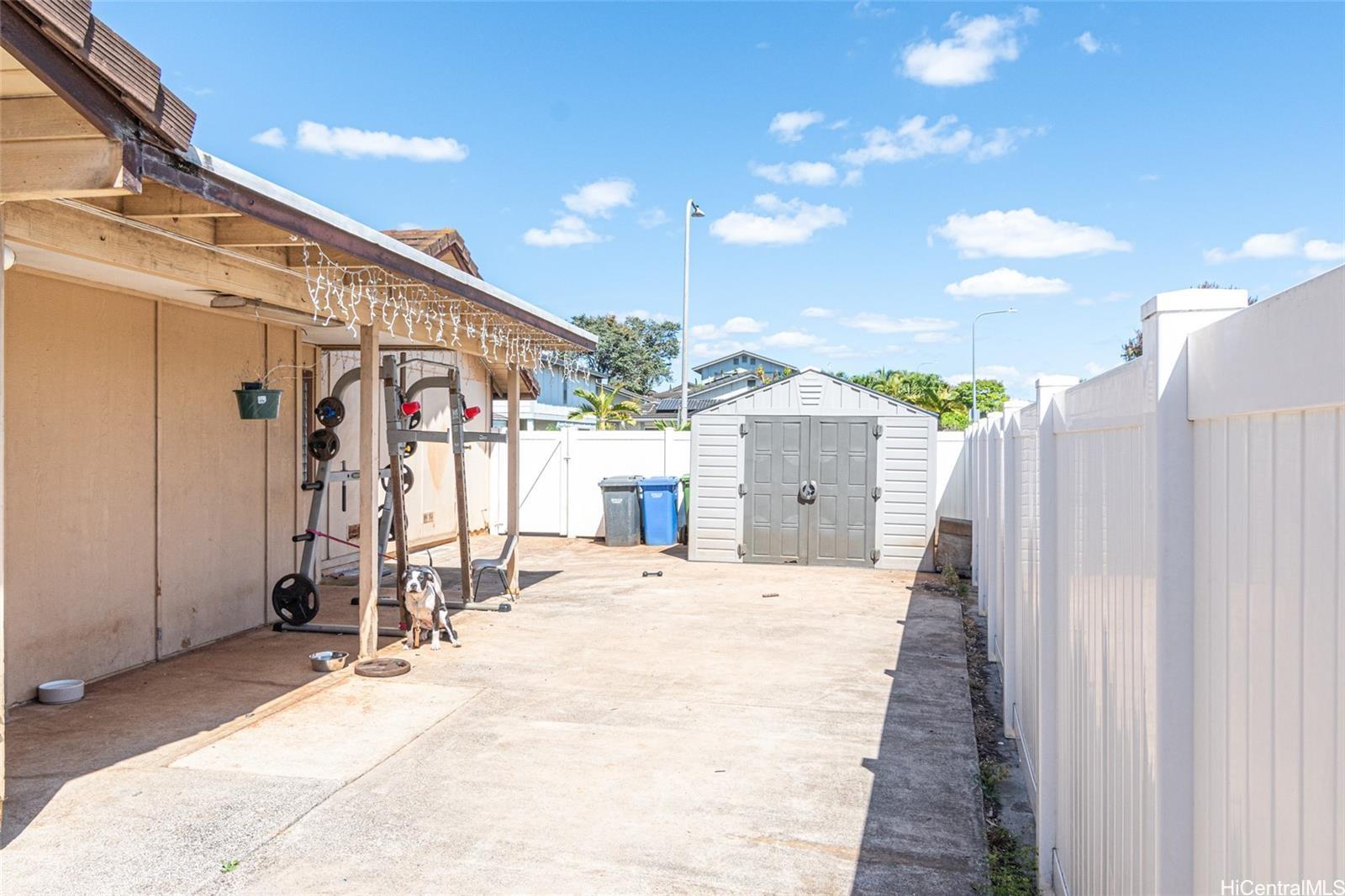 Priced below tax assessed value for this rarely available CORNER LOT, single level home with BRAND NEW ROOF just done in August of 2024, in the highly sought after Waipio Gentry community! 33 leased SOLAR PV panels with 3 BATTERIES gives you a low monthly electric bill. Refrigerator and dishwasher were just replaced in 2024, interior painted, vinyl plank flooring added, new ceiling fans also added, as well as recessed lighting outside. An interior renovation had been done in 2017 which included a new kitchen and bathrooms. The HUGE primary bedroom is your private oasis with an ensuite bathroom and room enough for a full office! Large bonus room off the living room which can be used as a fourth bedroom. Security equipment can stay. Garage has a retractable screen door and smart door opener which can be controlled from your phone. Outdoors, you’ll enjoy a large, fenced-in backyard perfect for gatherings, and the storage shed can stay. Located in a friendly neighborhood, this home is a short distance to community parks, playgrounds, military bases, Costco, shops, restaurants, Waikele Shopping Center and freeway cutoffs. 1 enhanced photo. Schedule your private showing today!
