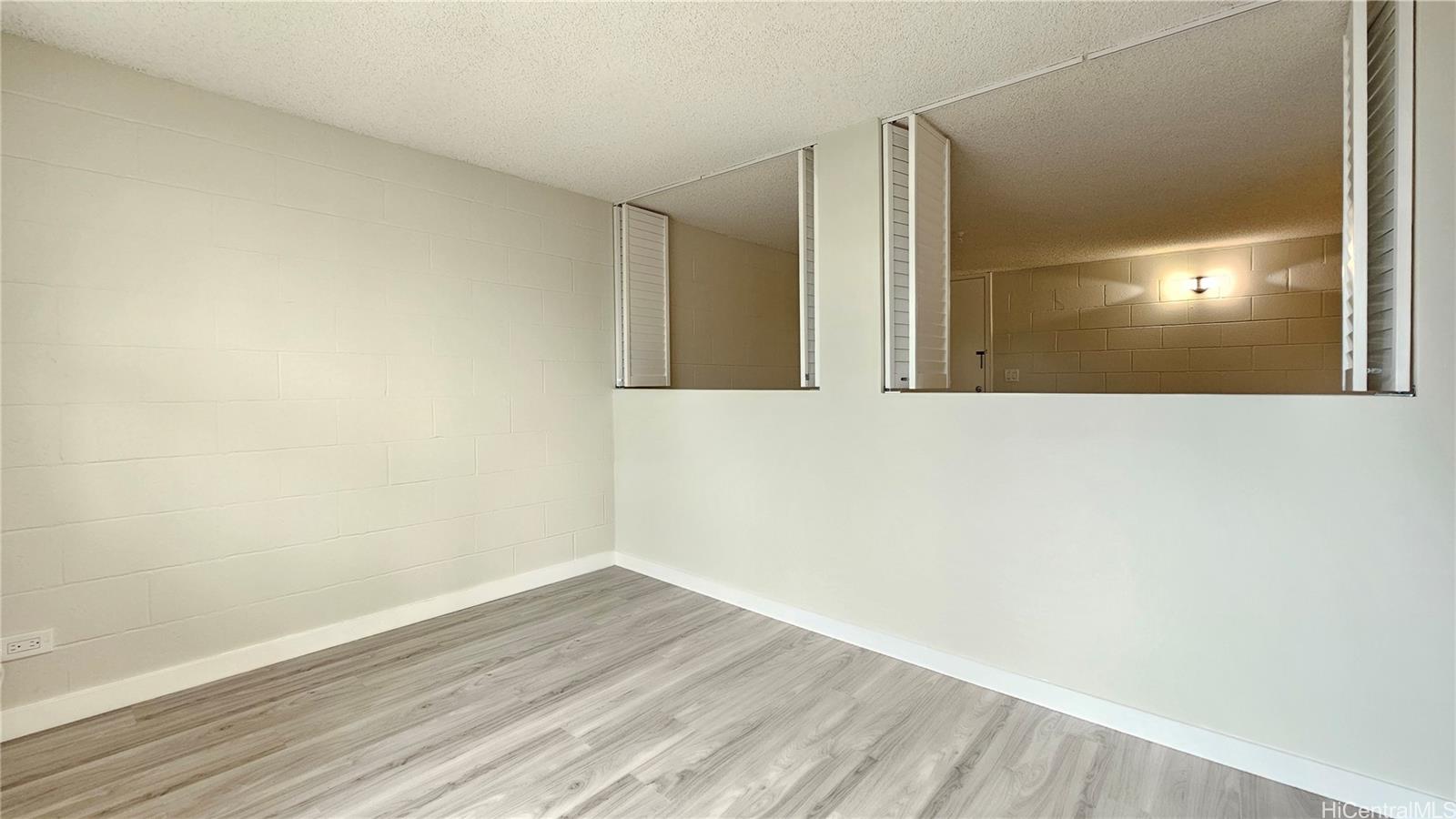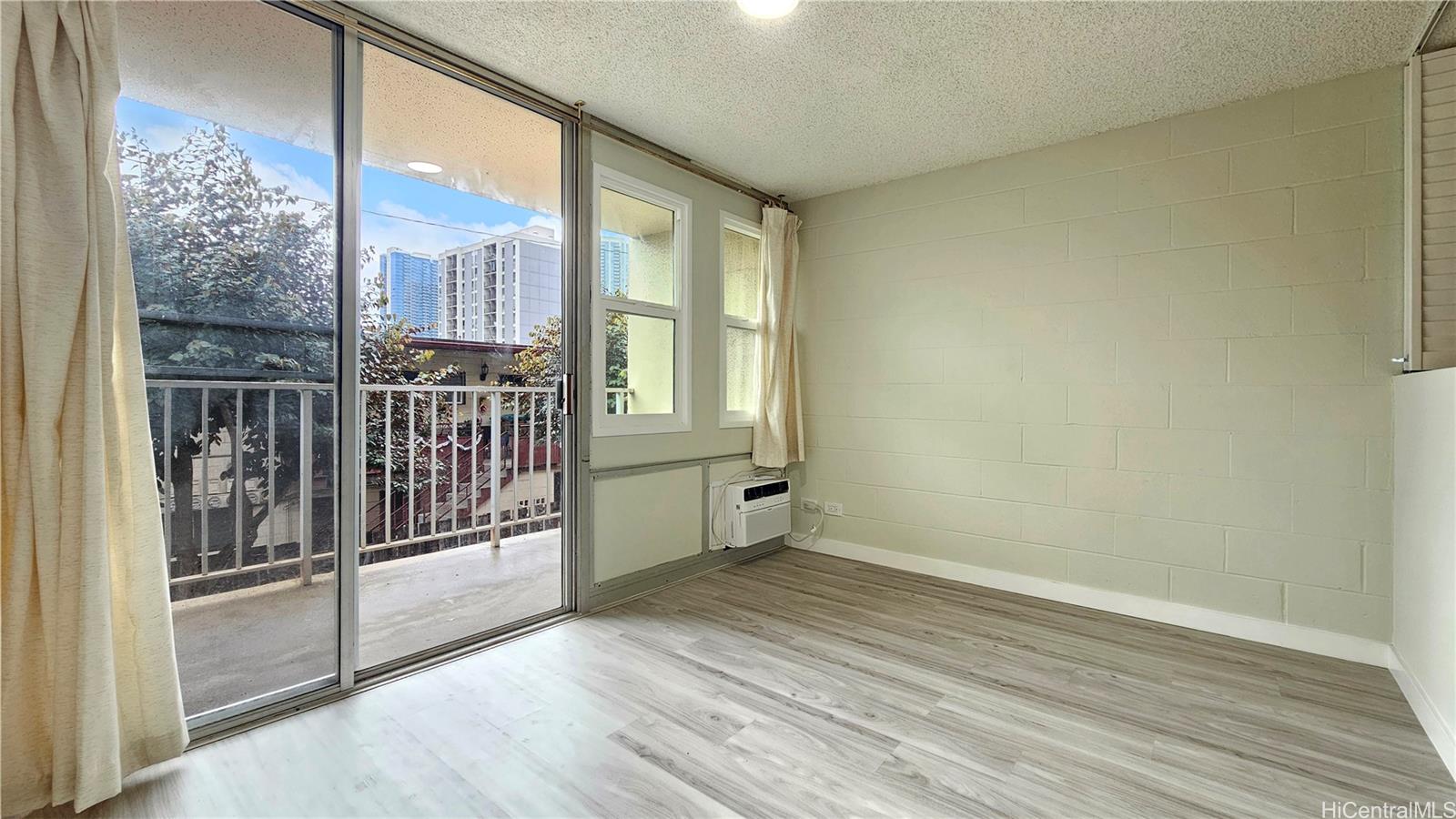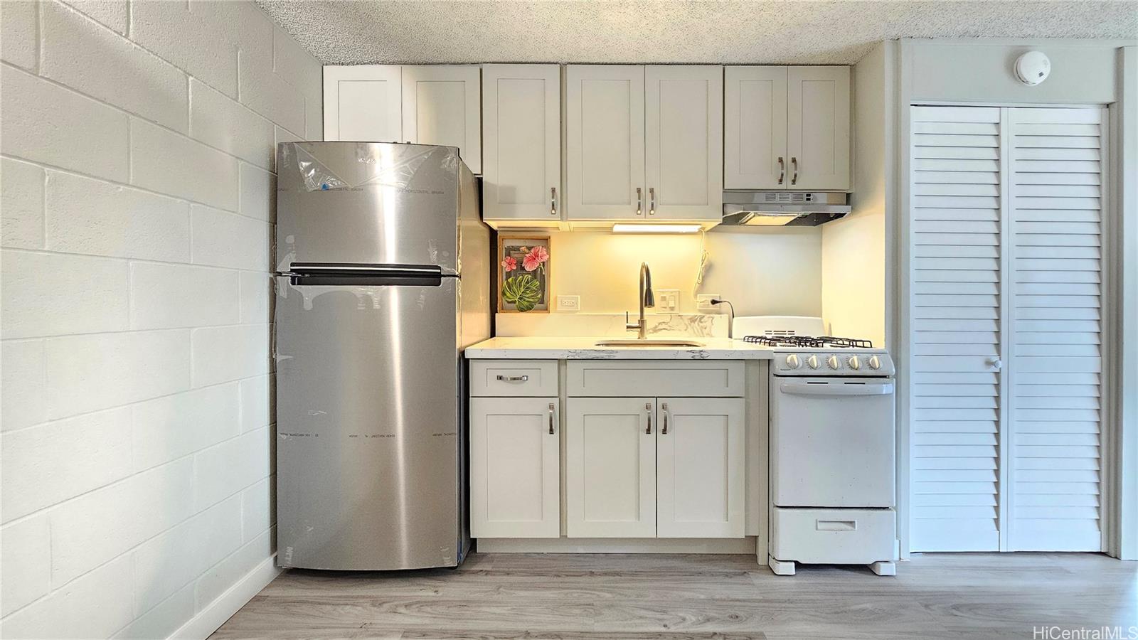 HIGHLY RENOVATED in 2025 with BRAND NEW kitchen & bath cabinets, counter tops, sink, vinyl plank laminate flooring, paint, bedroom & bathroom vinyl single hung windows, reglazed bathtub, lowered bedroom partition, mirrored closet doors, refrigerator, toilet, light fixtures, AC, curtains, sliding screen door. 1 year old gas range. Fee Simple 1 bedroom in central & convenient location close to Ala Moana, Safeway, beach, etc. with low maintenance fees of $464 which includes hot water, water, gas and sewer. 1 assigned covered parking stall. Community laundry on first floor. Rycroft Manor is fully insured, Buyer to verify.