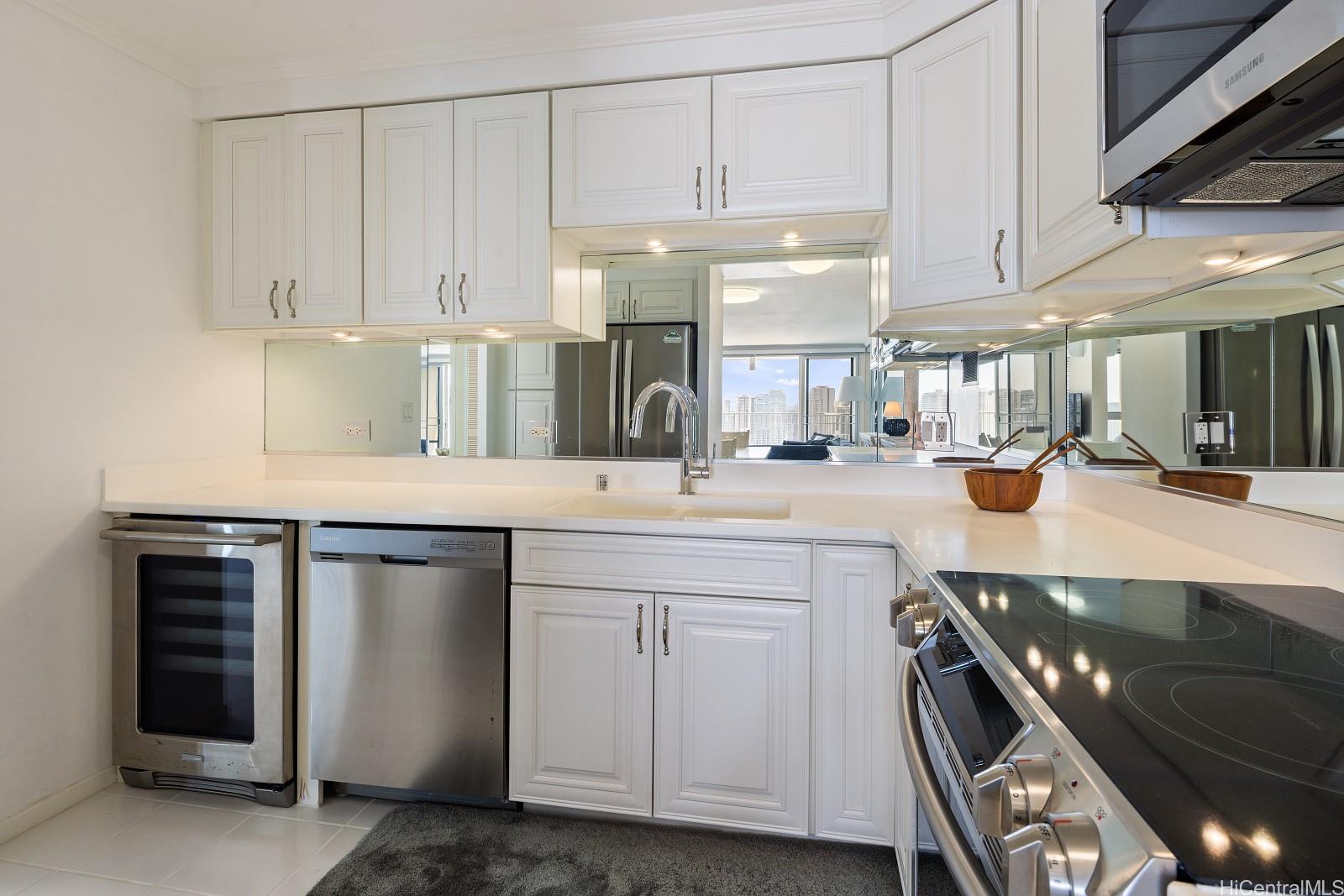 Rarely available high-floor residence one level below the lanai/penthouse floor at the prestigious 1350 Ala Moana. This elegantly upgraded property features a large open lanai with sweeping, unobstructed views of Diamond Head, Ala Wai Yacht Harbor, Ala Moana Beach, and the Pacific Ocean.
