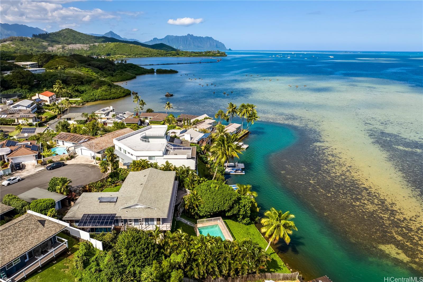 Extraordinary opportunity to own your own deep channel waterfront treasure in Hawaii’s most coveted sailing Bay. This spacious 4 bedroom 3 bath home sits on a generous 14,767 foot lot at the end of a quite cul-de-sac, offering privacy and tranquility. Enjoy the breathtaking views of world-famous Kaneohe Bay, where sailboats glide across turquoise waters and the iconic sandbar beckons for adventure. Excellent set up for entertaining and hosting unforgettable gatherings with a garden lanai with stunning Koolau mountain views and 2 swimming pools. One large pool with deck, and a second heated exercise lap pool under a shaded cover for exercise. Spacious lower floor bedroom and living area with separate entrance and kitchenette for flexible living arrangement. The ultimate island lifestyle: Sail across the bay or paddle your canoe through calm waters. Enjoy stand-up paddling right from your backyard. Visit the famous Kaneohe Sandbar for picnics, parties, and unforgettable recreation. Don’t miss your chance to own this rare waterfront gem!