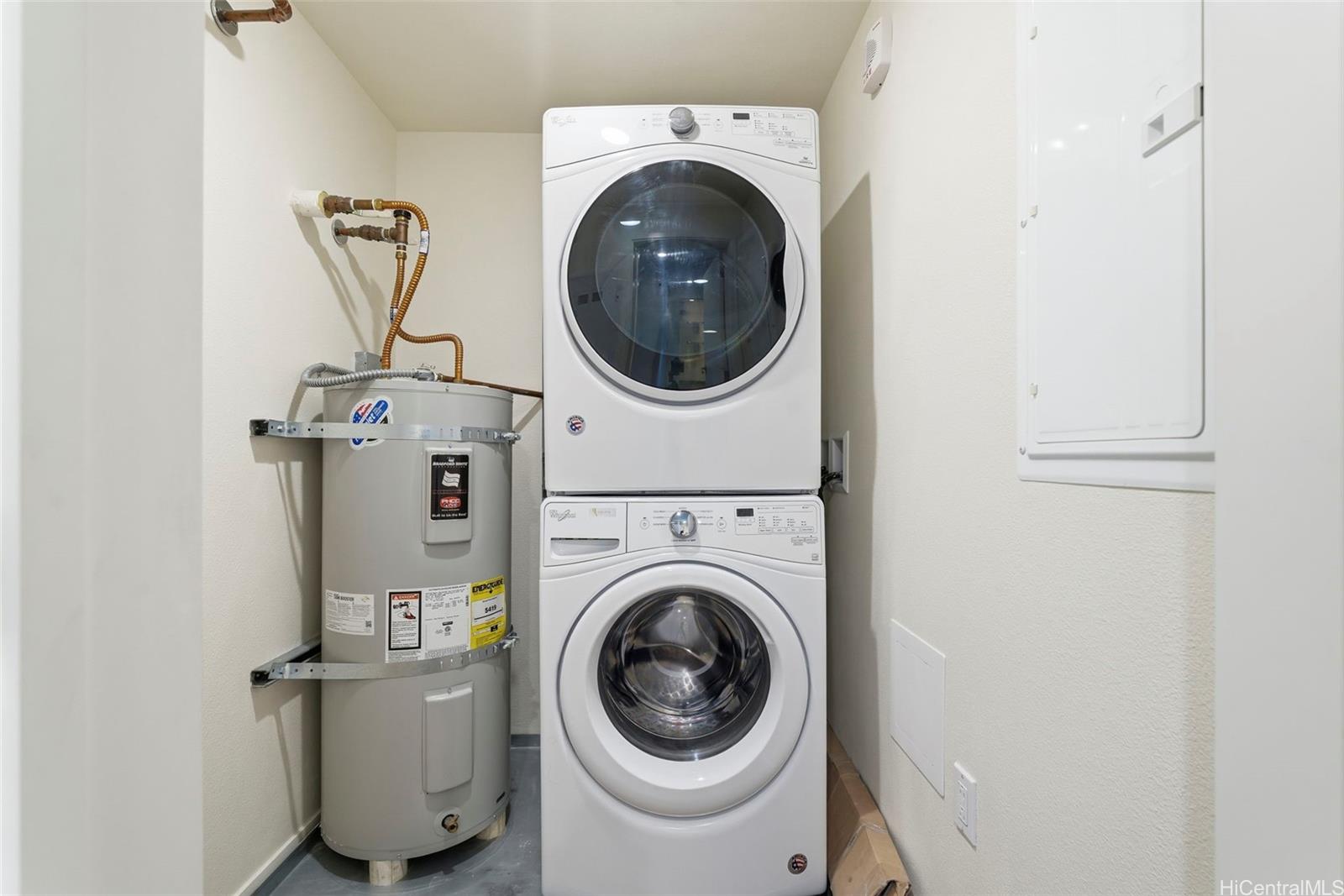 Private in-unit laundry room w/ a stackable front-load washer and dryer, along with two separate storage closets. The secure building offers resort-style amenities including a barbecue area, recreation deck, meeting room, EV charging station, & one assigned parking stall. Located near the Hawaii Convention Center, Ala Moana, & world-renowned beaches, this turnkey residence presents a rare opportunity to enjoy luxury, convenience, & elevated island living.
