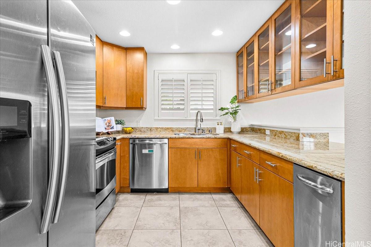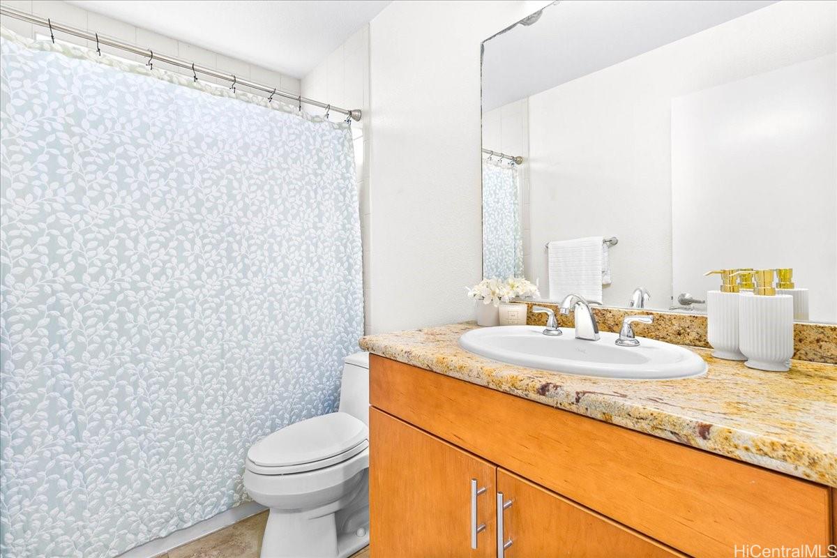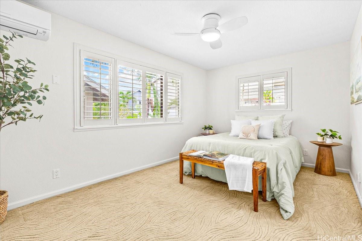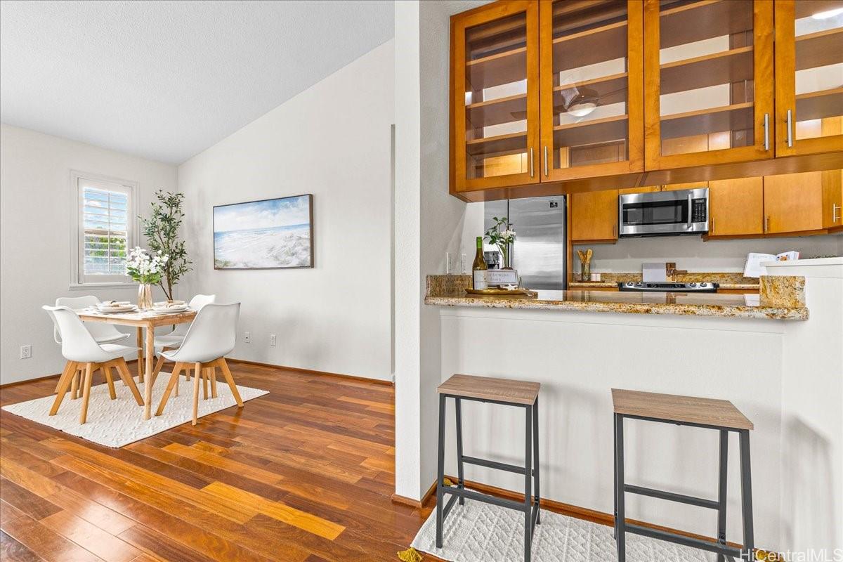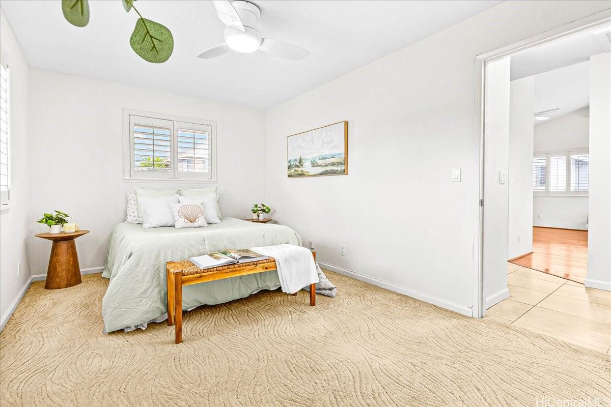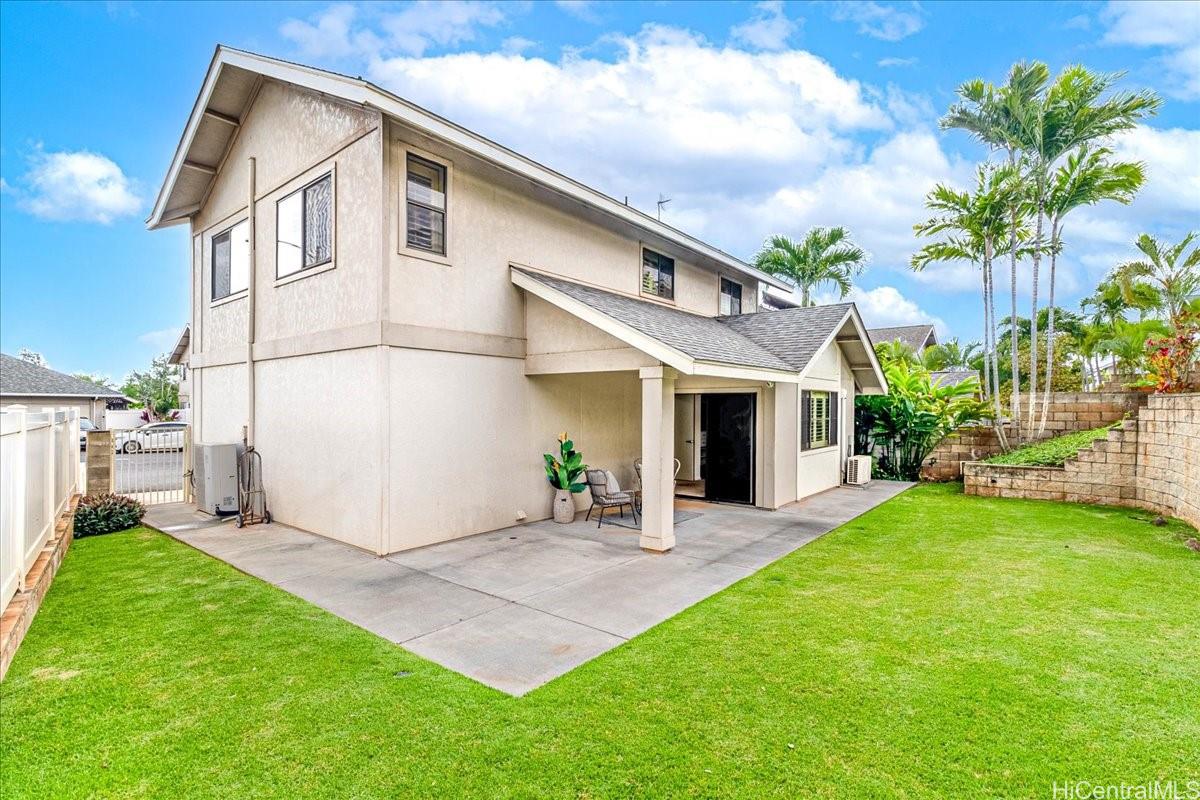 Experience elevated island living in this lovingly cared for 3-bedroom, 2-bath home tucked into a peaceful Royal Kunia cul-de-sac. This two-story retreat features a thoughtful layout with two bedrooms and a full bath on the main level for comfort and privacy. Upstairs, the primary bedroom opens to a bright kitchen with granite countertops, while the living room shines with beautiful hardwood floors and plantation shutters that bring in soft, airy light. Fresh, clean, and truly move-in ready, this home shows pride of ownership throughout. Outside, the beautifully landscaped and fully gated yard offers the perfect place to unwind after a long day- quiet, breezy, and made for easy island evenings. With Royal Kunia's prime location near shopping, dining, parks, schools, and freeway access, you get convenience wrapped in community charm. Homes like this don't linger - come see it, feel it, and imagine your next chapter here.