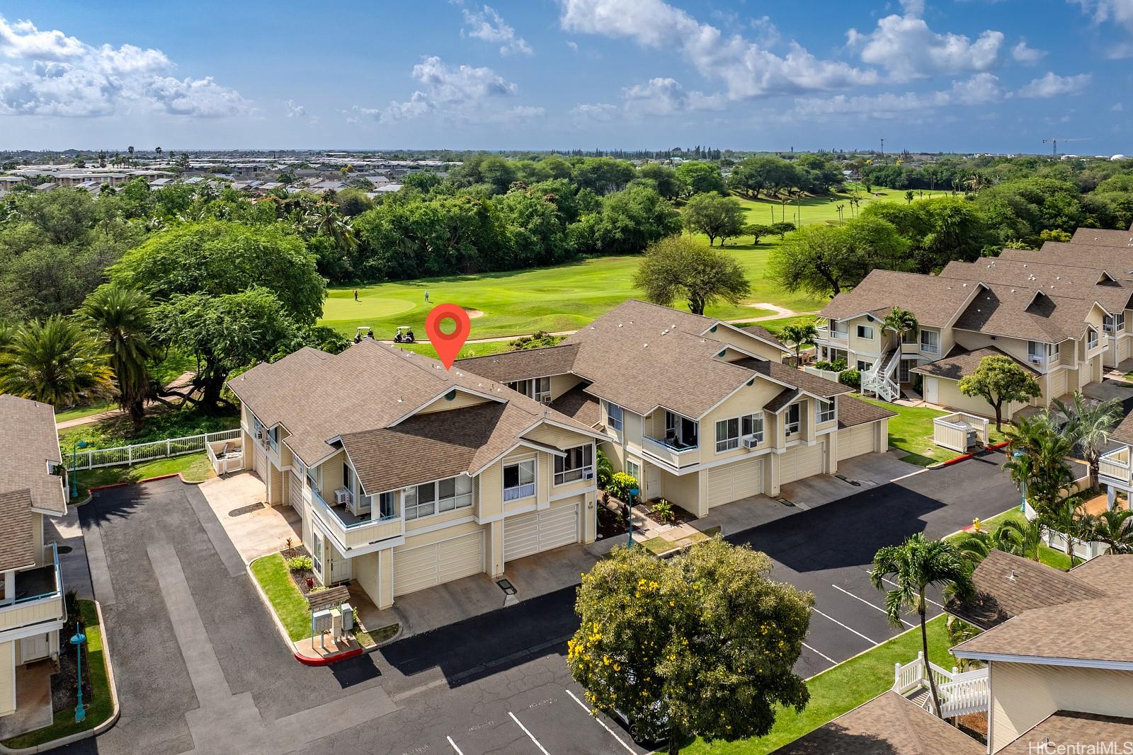 Enjoy tranquil fairway views from this spacious 3-bedroom, 3-full-bath townhouse that lives like a single-family home. The open-concept living, dining, and kitchen area is ideal for everyday living and entertaining. A convenient first-floor bedroom and full bath offer flexibility for guests, a home office, or multigenerational living. Enjoy your morning coffee or evening beverage on the private lanai overlooking the 5th green of the Coral Creek Golf Course. The expansive primary suite features two large closets and a relaxing retreat-like feel. The second bedroom upstairs features a Murphy Bed, perfect for guests! Separate downstairs laundry room with full size Washer & Dryer, sink and plenty of storage. Additional highlights include a 2-car attached garage, secure gated community access, community pool and clubhouse, and plenty of guest parking conveniently located in front of the property. Ideally situated close to shopping, dining, golf courses, beaches, and the H-1 Freeway, this home offers comfort, convenience, and low-maintenance living. VA Assumable Loan at 2.875% rate with monthly payment of $2600; balance of loan is approximately $463,000.