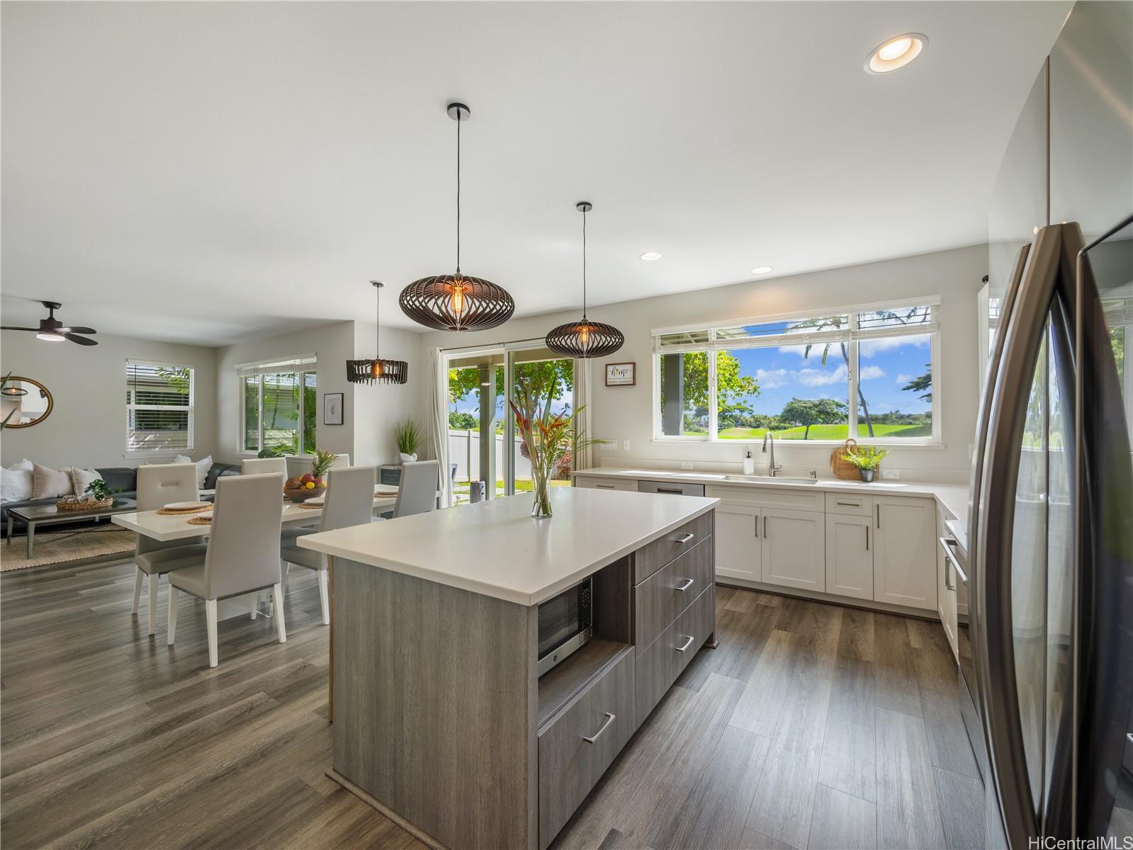 Perfectly situated on Hole 17 of the beautiful Kapolei Golf Course, this 4-bedroom, 3-bath home offers 2,119 sq ft of thoughtfully designed living space in one of Oahu’s most sought-after communities. Step inside to a bright, open layout with a chef’s kitchen featuring a large island, range hood, dishwasher, refrigerator, and wine cooler—ideal for everyday living and entertaining. The primary suite includes a walk-in closet and private ensuite, while the additional bedrooms offer flexible space for guests or a home office. With central AC, in-home laundry, and a fully fenced backyard overlooking the fairway, this home blends comfort, privacy, and scenic beauty. Located in the heart of Kapolei, you're just minutes from shopping, dining, top-rated schools, and world-class beaches—all while enjoying the tranquility of golf course living.