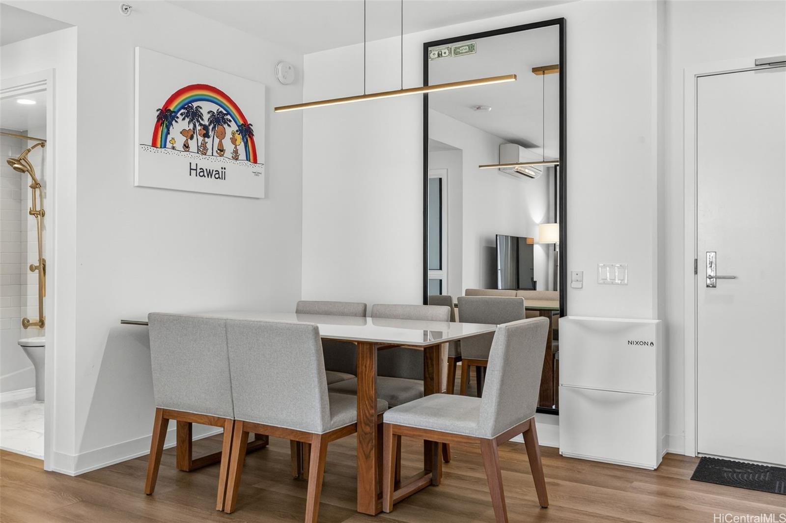 Welcome to Unit 2303 at A‘ali‘i, a modern 1-bedroom residence in the heart of Ward Village. This FULLY FURNNISHED unit offers expansive city and sunset views through floor-to-ceiling windows, filling the home with natural light and island breezes. The open-concept layout features a sleek contemporary kitchen with quartz countertops, modern cabinetry, seamlessly flowing into the living and dining areas.