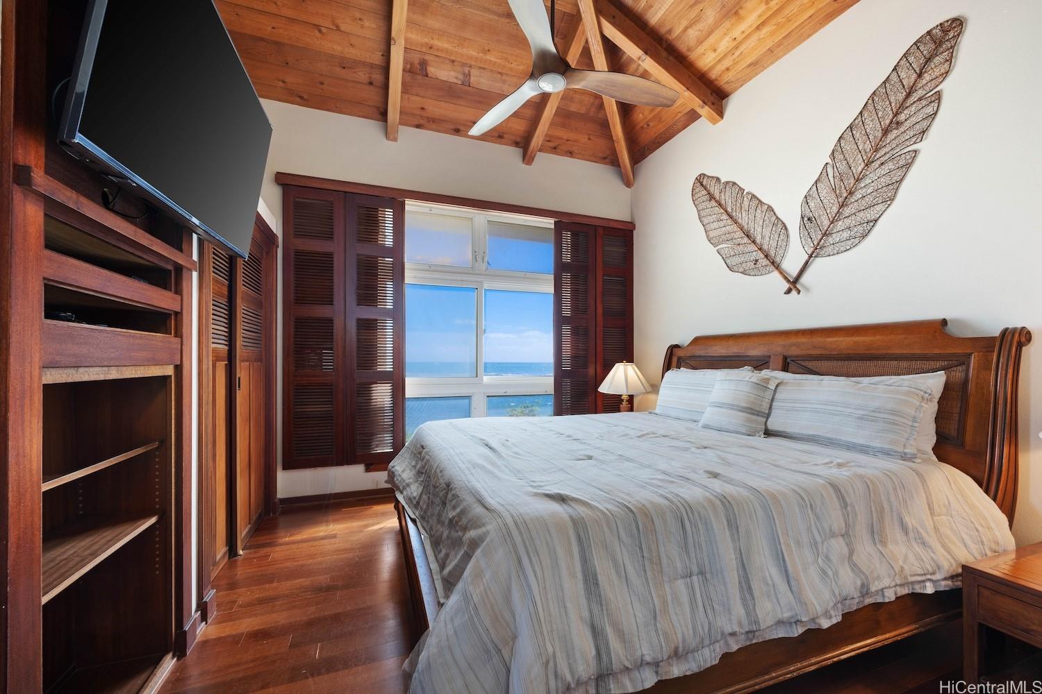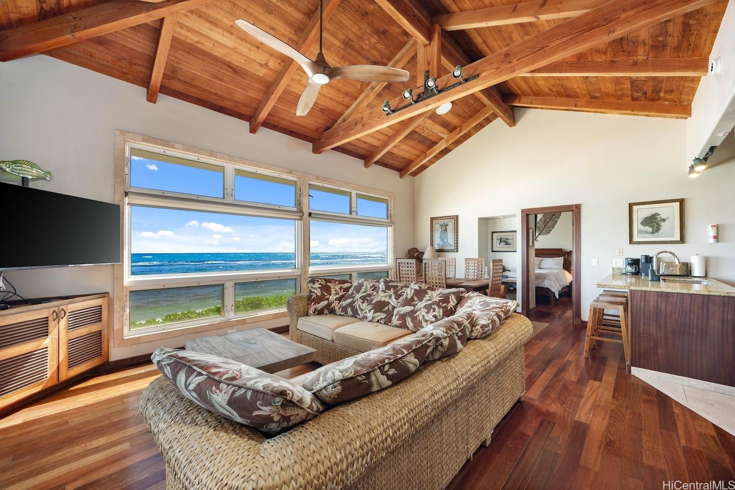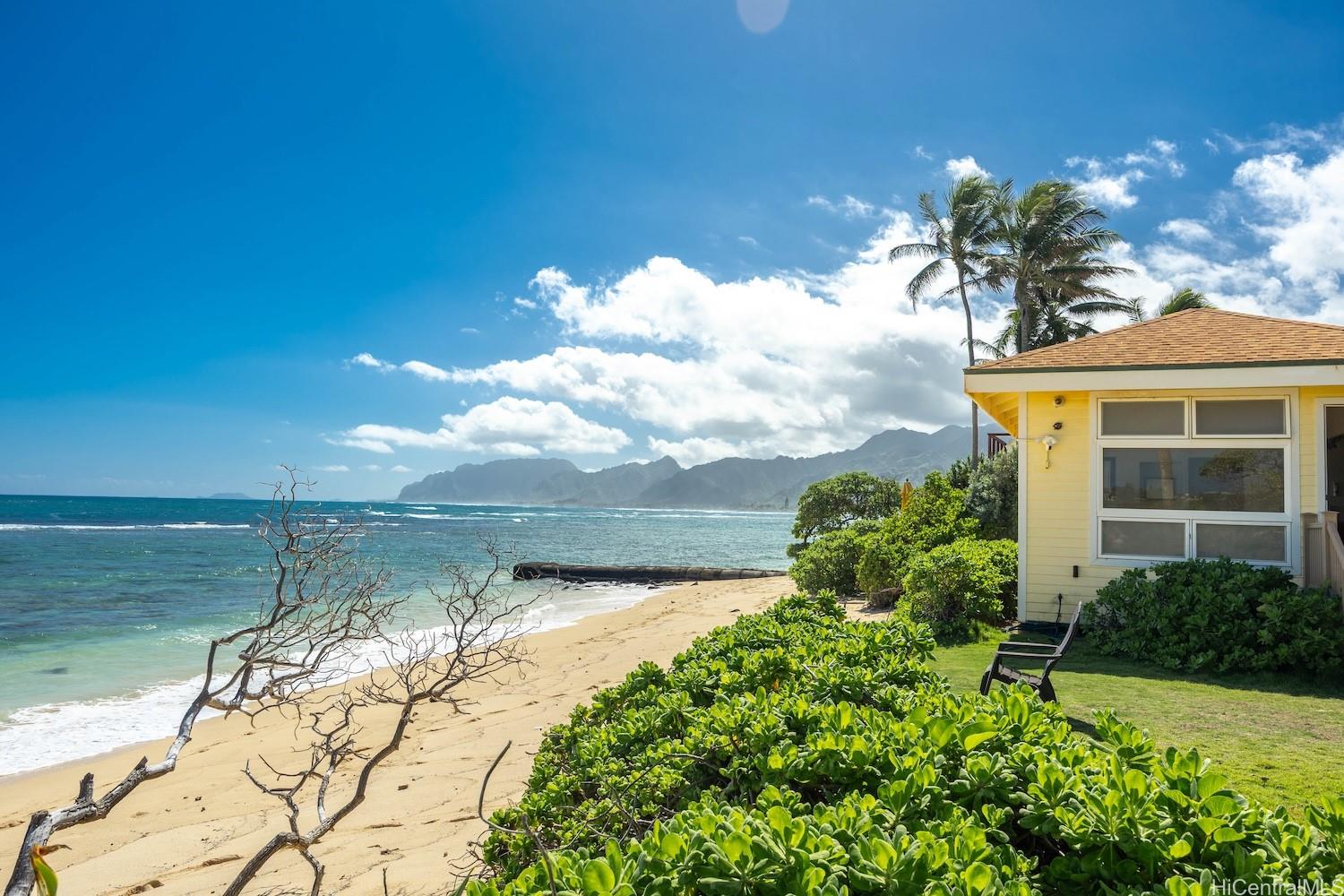 An exceptionally rare North Shore beachfront retreat. This virtually private, sandy beachfront property is one of only a select few where calm, crystal-clear waters meet the shoreline - ideal for daily swimming, fishing, and surfing just steps from your door. Despite its peaceful, secluded feel, the home is moments from everyday conveniences, including shopping centers with groceries, medical offices, dining, a theater, BYU–Hawaii, and some of Oahu’s most beautiful white-sand beaches. The main residence at 55-373 Kamehameha Hwy was thoughtfully renovated in 2010, showcasing solid Brazilian hardwood floors and travertine tile throughout. The second home, 55-373A, was newly constructed in 2014 and complements the original with matching finishes and design continuity. Both residences feature vaulted ceilings, unobstructed ocean views, private beach access, and impeccable upkeep, offering a rare opportunity to own a true beachfront compound on the North Shore.