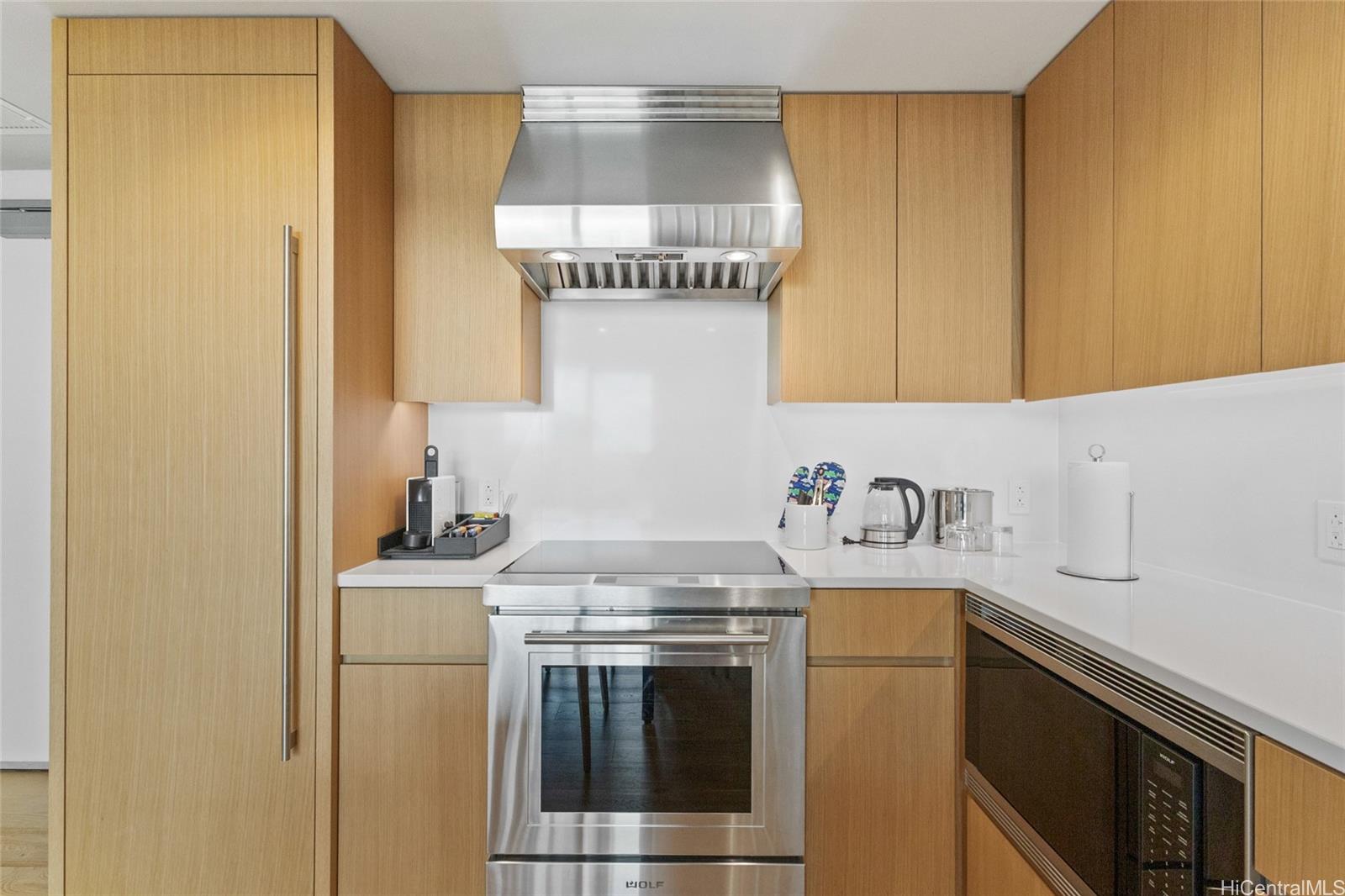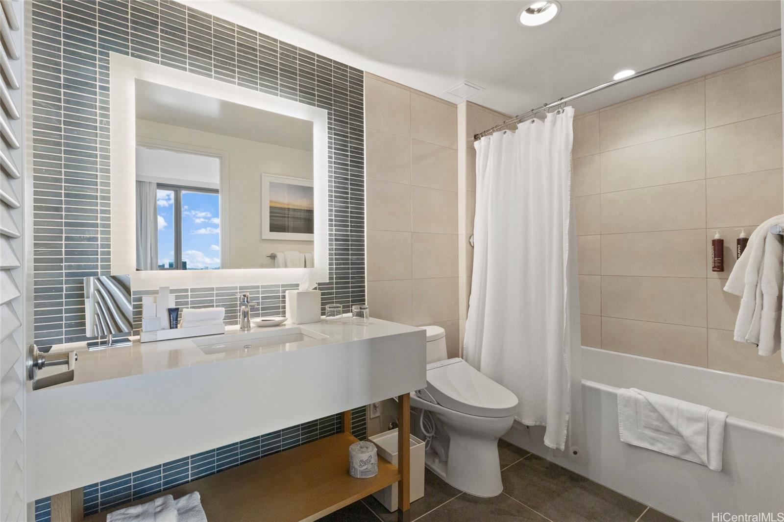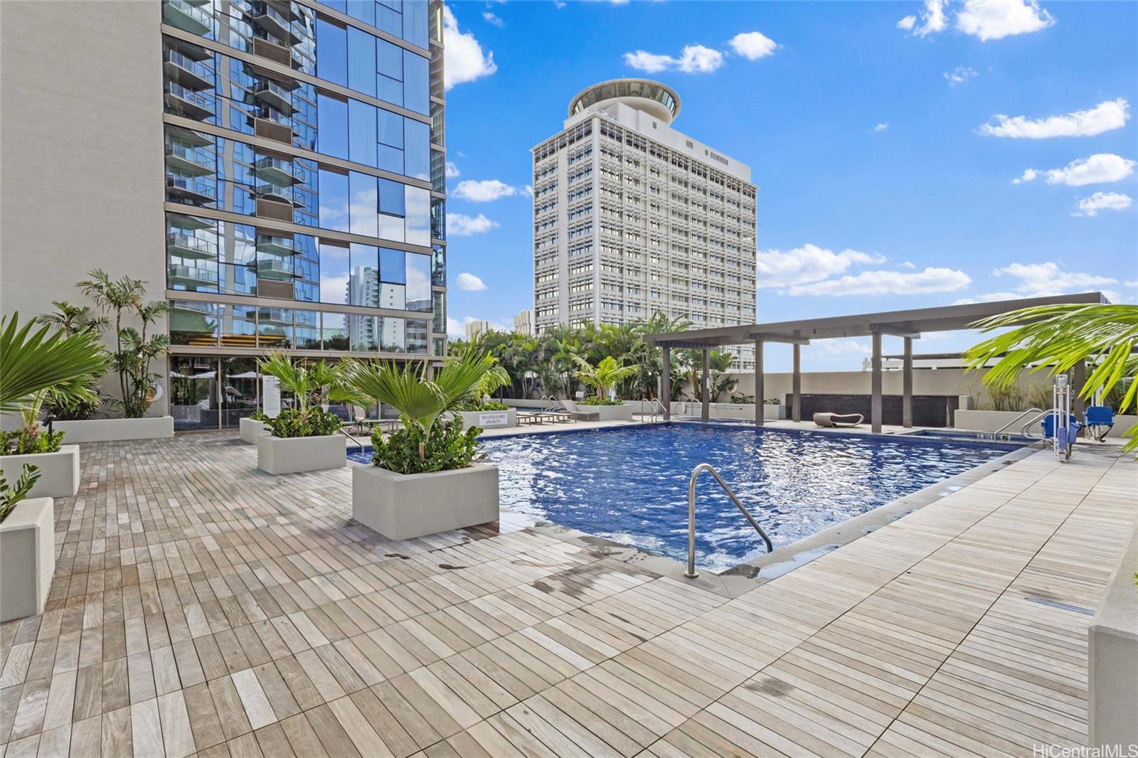 The building provides a full-service hotel experience with lobby check-in, valet, an on-site café and restaurant, plus an expansive amenity deck featuring multiple pools, a hot tub, cabanas, a state-of-the-art gym, and a full-service bar. Located directly across from Ala Moana Center and moments from dining, shopping, Don Quijote, Walmart, and an indoor golf facility, this is a refined alternative to the bustle of Waikiki. A stylish, flexible, and highly desirable residence in one of Honolulu’s most exciting new luxury offerings.
