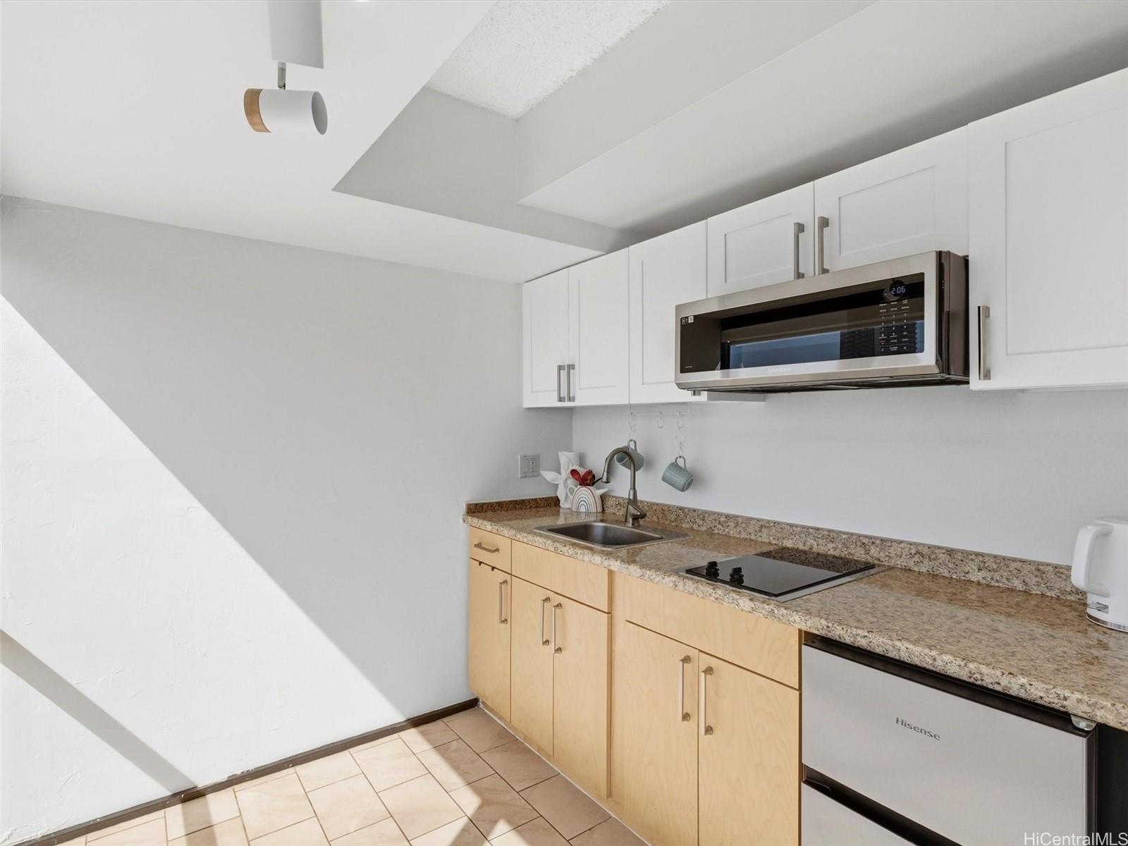 Beautifully updated studio in a rare mixed-use building, ideal for owner-occupants, professionals, or live/work use. This modern residence features luxury vinyl tile flooring, sleek kitchen and bath cabinetry, central AC, and a cleverly concealed closet for a streamlined layout. Floor-to-ceiling windows provide abundant natural light and are complemented by remote-controlled shades for added comfort and privacy. Residents enjoy resort-style amenities including swimming pool, saunas, private health spa, and recreation deck with sports courts and jogging path. Conveniently located near Waikiki and Ala Moana with easy access to beaches, shopping, dining, convention center, and bus lines. Excellent opportunity to own a turnkey unit in the heart of Honolulu.