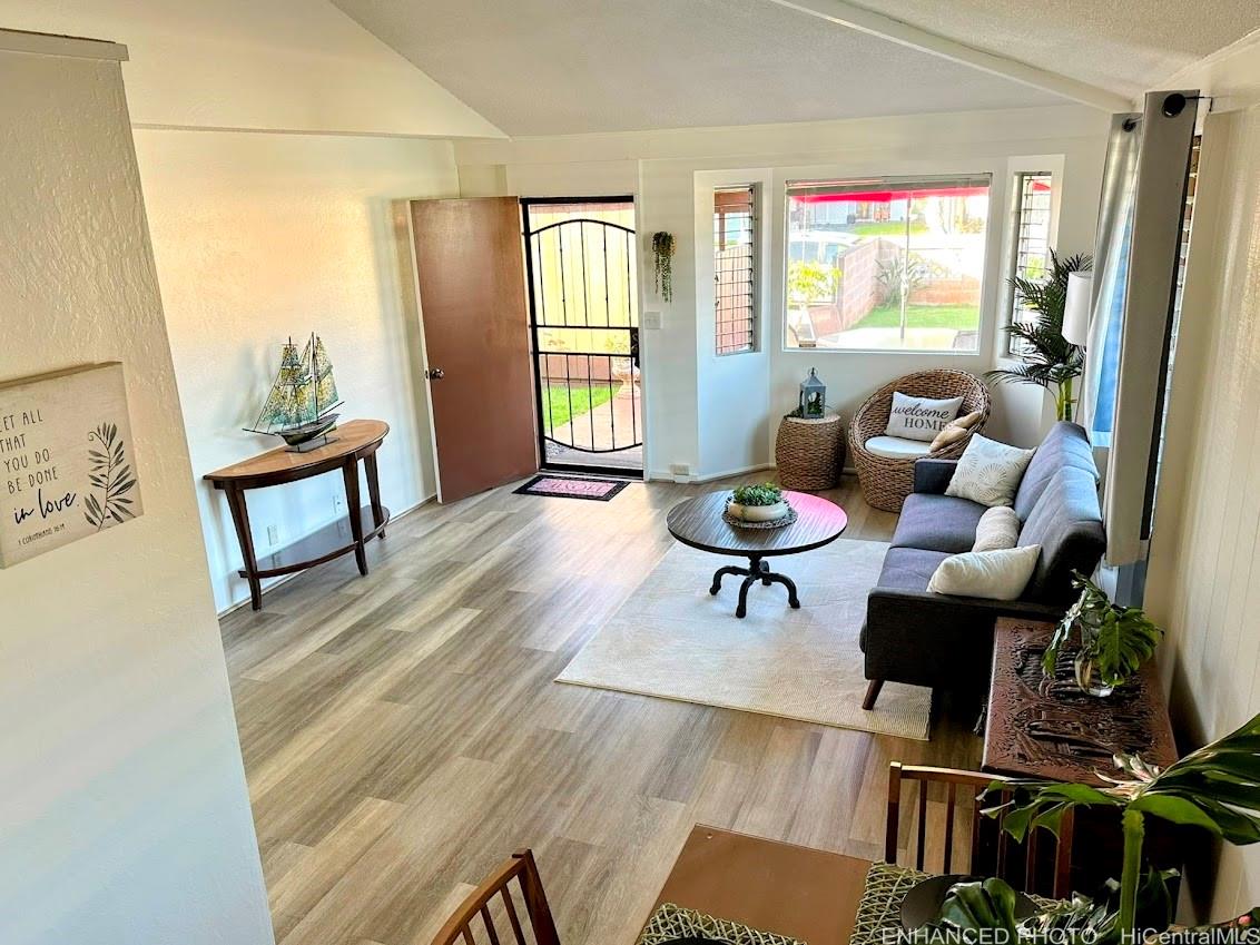 Welcome home! This is a move-in-ready, single-level home in the premier, highly desirable community of Mililani. Enjoy an open-flow layout with high ceilings, luxury vinyl flooring, renovated bathrooms and updated kitchen cabinets/counters. The expanded floor plan includes an additional large living area and a bonus flex space providing comfort and versatility. The washer and dryer is located indoors with shelving and storage space for added convenience during all weather conditions. Enjoy relaxing and entertaining outdoors in the front patio area or the back lanai surrounded by the large yard complemented with beautiful tropical plants. Location is everything! Just minutes from the H-2 freeway with easy access to Kamehameha Highway and bus lines to make daily commuting a breeze. Close to top-rated schools, military bases, parks, golf courses, shopping and restaurants. Residents of this vibrant community have access to Mililani's signature community amenities including recreation centers, pools, activities, classes and events. This loved home is ready for you to begin making memories.