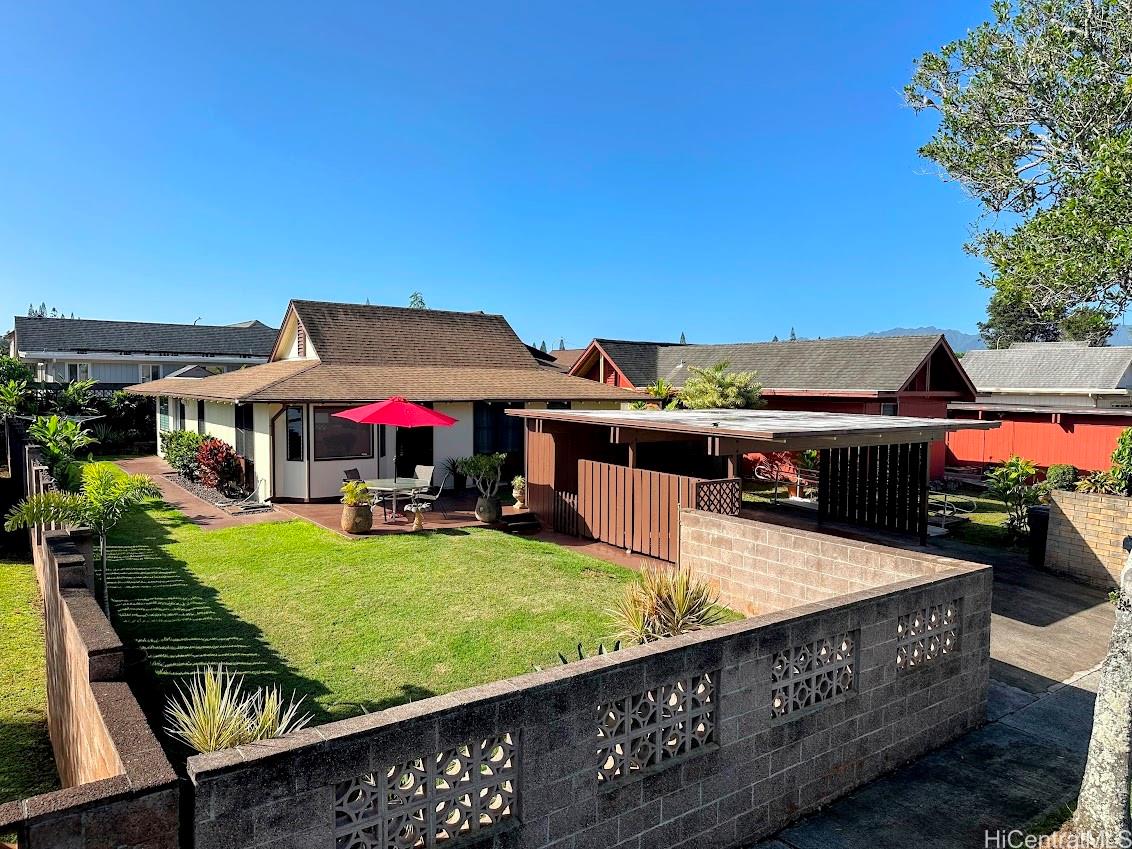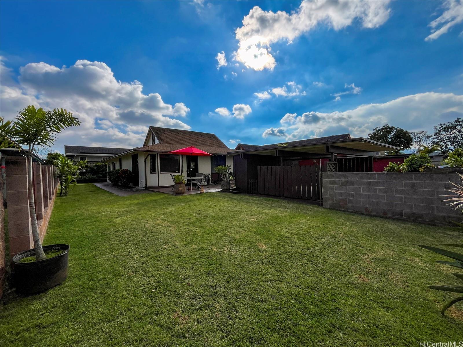 ようこそ!ミリラニという一流で人気のコミュニティにある、すぐに入居可能な平屋住宅です。高い天井、高級ビニールフローリング、改装済みのバスルーム、最新のキッチンキャビネット/カウンターを備えた開放的な間取りをお楽しみください。広々とした間取りには、さらに広いリビングエリアと、快適で多目的に使えるフレックススペースが備わっています。洗濯機と乾燥機は屋内に設置されており、棚と収納スペースも備えているので、どんな天候でも便利です。正面のパティオエリアや、美しい熱帯植物が生い茂る広い庭に囲まれた裏庭のベランダで、リラックスしたり、楽しい時間を過ごしたりしていただけます。立地は抜群です!H-2高速道路からわずか数分、カメハメハ・ハイウェイやバス路線へのアクセスも容易で、毎日の通勤も楽々です。一流の学校、軍事基地、公園、ゴルフコース、ショッピング、レストランも近くにあります。この活気あふれるコミュニティの住民は、レクリエーションセンター、プール、アクティビティ、クラス、イベントなど、ミリラニならではのコミュニティアメニティを利用できます。この愛すべき家で、思い出作りを始めませんか?