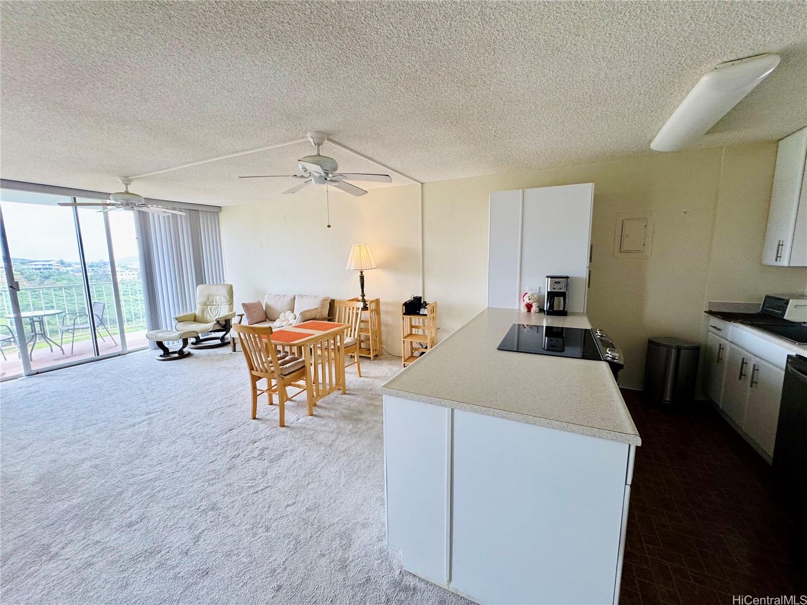 Rarely available corner unit featuring a versatile den area, perfect for a home office, reading nook, or guest space. Located in a highly desirable, secluded, gated community complex with all you need amenities for peaceful & healthy living! This 10-floor condo boasts a spacious living room with lanai, 2 bedrooms & 2 bathrooms making it perfect for first-time home buyers or investors. The bright & airy living room offers sweeping views of the golf course, Pearl Harbor, & partial ocean view from its lanai that is ideal for sipping your coffee while enjoying the island setting. The primary suite includes two closets & a remodeled shower tab. Updated kitchen, washer/dryer in unit, & one assigned open parking.