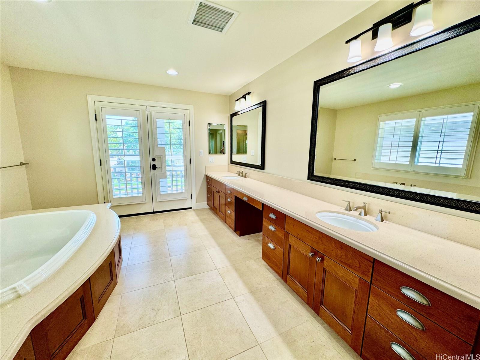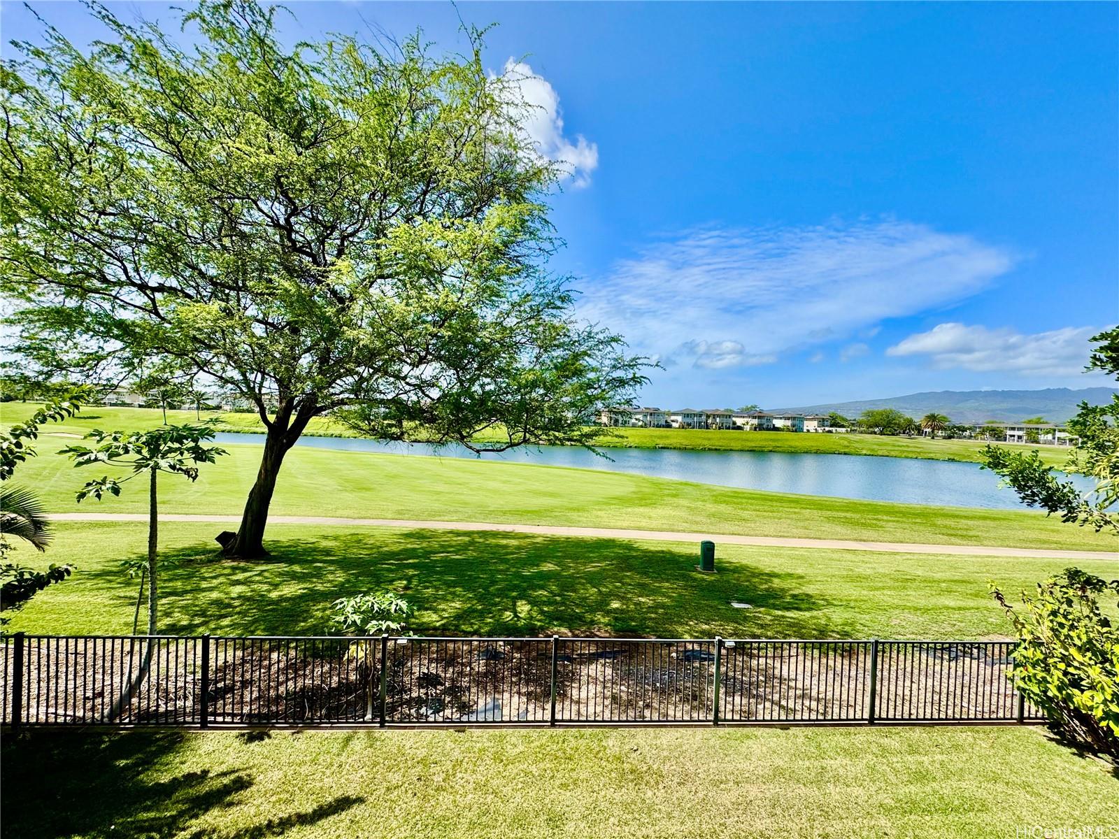 PRICED TO SELL! Rare opportunity to own a golf course-front property showcasing a spacious 5-bedroom, 4.5-bath home with beautiful fairway views along Hoakalei Country Club and a layout designed for comfortable island living. With 39 fully owned PV panels, the property delivers both style and energy efficiency. A welcoming entry with soaring ceilings, dramatic chandelier, and an elegant staircase creates a striking first impression, while large windows with plantation shutters bring in abundant natural light. A grand kitchen seamlessly connecting to generous living and dining spaces ideal for gatherings. Upstairs, the expansive primary includes a bonus area and access to a private lanai overlooking the golf course. A convenient main-level bedroom with full bath offers added versatility for guests or extended family. Engineered hardwood flooring enhances the downstairs living areas, while durable laminate flooring completes the 2nd level. Highlights include a 3 car garage and extra driveway parking. HOA dues include cable, internet, and access to the pool, and all just minutes from beaches, shopping, dining, and the vibrant Wai Kai waterfront destination.