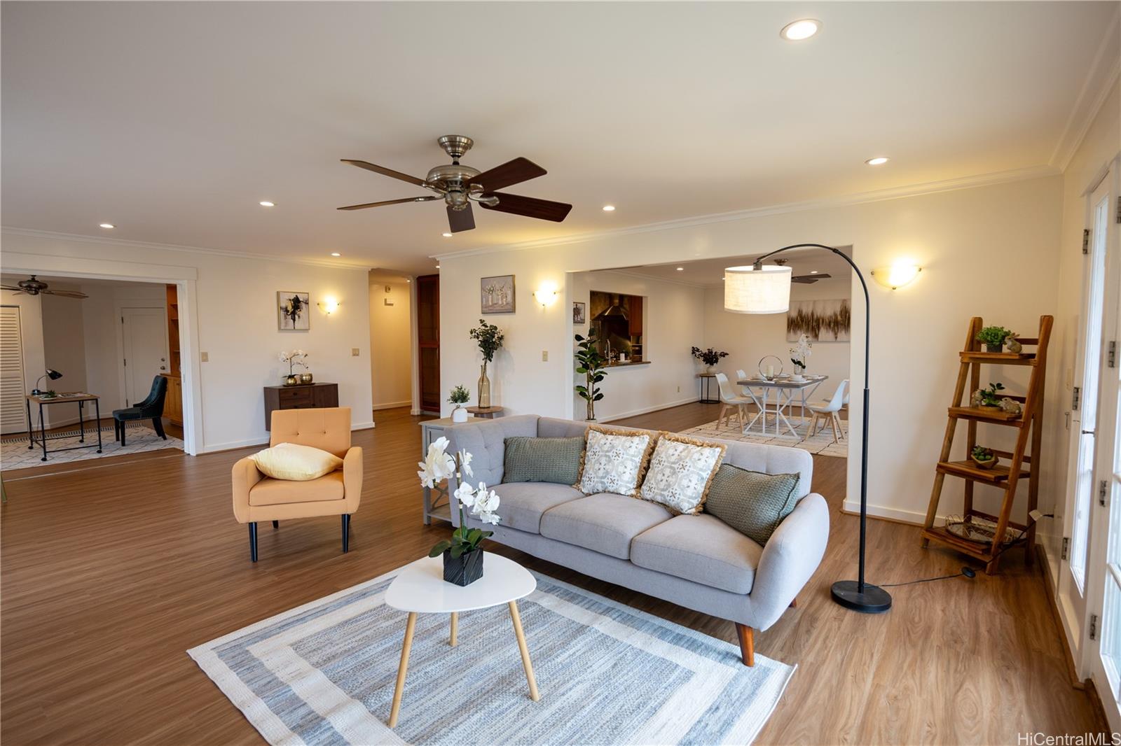 Spacious family home in Hawaii Kai’s highly coveted Triangle neighborhood. This 4-bedroom, 3-bathroom residence offers a functional and versatile floor plan ideal for multi-generational living or a home office, featuring two primary suites and an additional den. The home is move-in ready with brand-new flooring in the expansive living room and a fresh coat of paint throughout the interior.