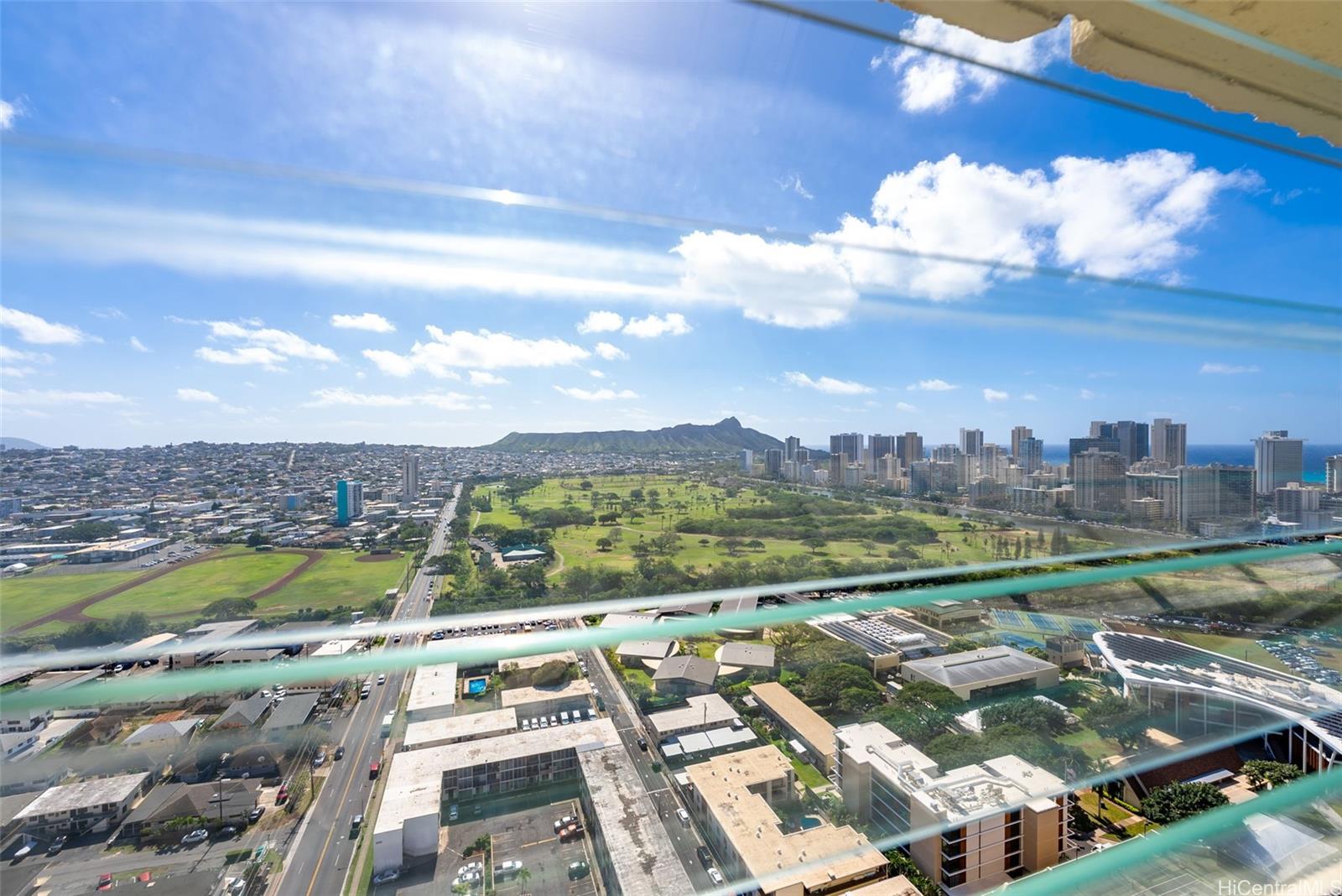 1BR/1BA high floor corner unit in desirable town location with sweeping Diamond Head, golf course and ocean views. Bright, airy floor plan with excellent cross breezes—bedroom features two side windows. A wonderful fixer opportunity to design your dream home. Well managed building offers pool, BBQ area, covered parking, on site security and a ground floor convenience store. Prime location near Waikiki, Ala Moana, UH and easy access to shopping, dining and public transit. Sold AS IS. Contact your agent to schedule a private showing today!
