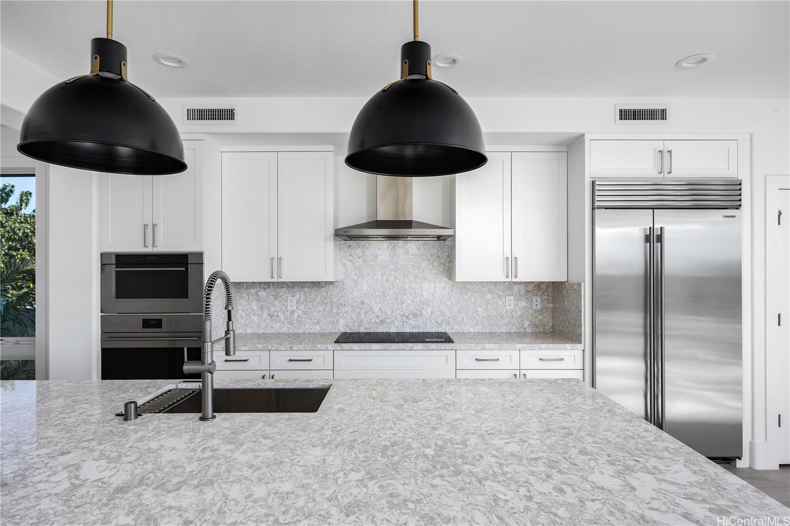 Enjoy panoramic ocean views and upscale features including central AC, a 120 gallon solar water heater, and accommodations for a PV solar electric system and EV charger. The gourmet kitchen is equipped with Sub Zero and Wolf appliances, a 42” built in refrigerator, 36" frameless induction cooktop, built in convection oven, drop down microwave oven, and a Bosch Energy Star dishwasher.