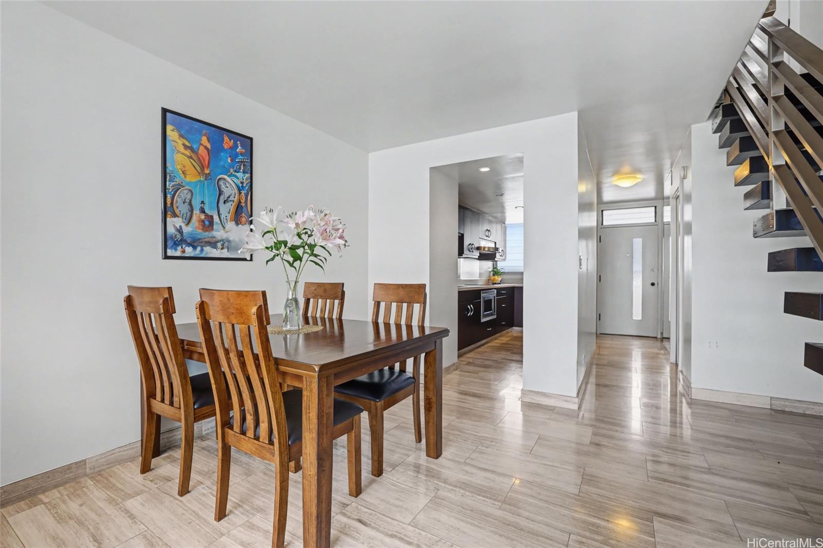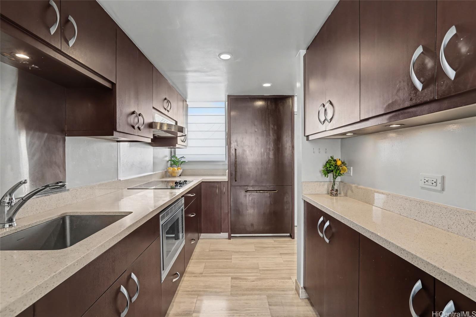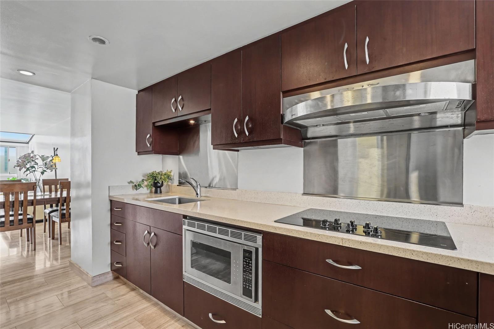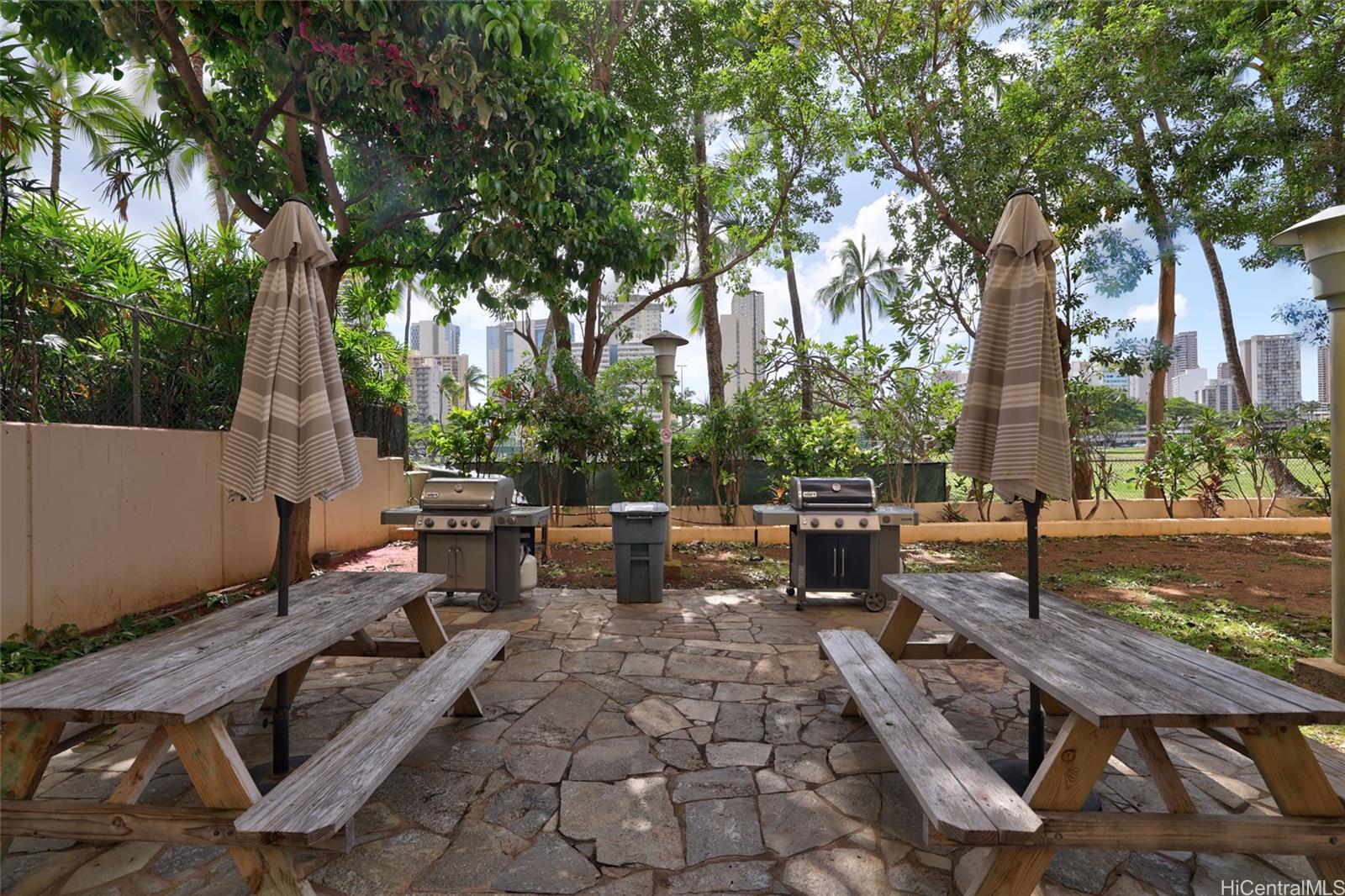 Welcome to Ala Wai Plaza, where expansive park and canal views meet the iconic Waikiki skyline and swaying palms below. This beautifully updated two-story residence offers over 1,500 SF of interior living space, highlighted by a dramatic wall of glass framing sweeping views and filling the home with natural light. Overhead skylight panels with retractable shades and smooth ceilings enhance the modern aesthetic. The split-level design delivers the comfort and flow of a home with the convenience and security of vertical living. Mountain-to-ocean breezes flow naturally, with window AC for added comfort. The contemporary kitchen features a Thermador refrigerator and cooktop with sleek Zephyr range hood. Three spacious bedrooms upstairs include two with expansive views, while the third captures lush mountain ridgelines and passing rainbows. Includes full-size washer and dryer and covered parking. Pet-friendly with 24-hour security, pool, fitness center, BBQ area, bike/surfboard storage, and car wash area. Near UH Manoa, beaches, Ala Moana Shopping Center and Waikiki.