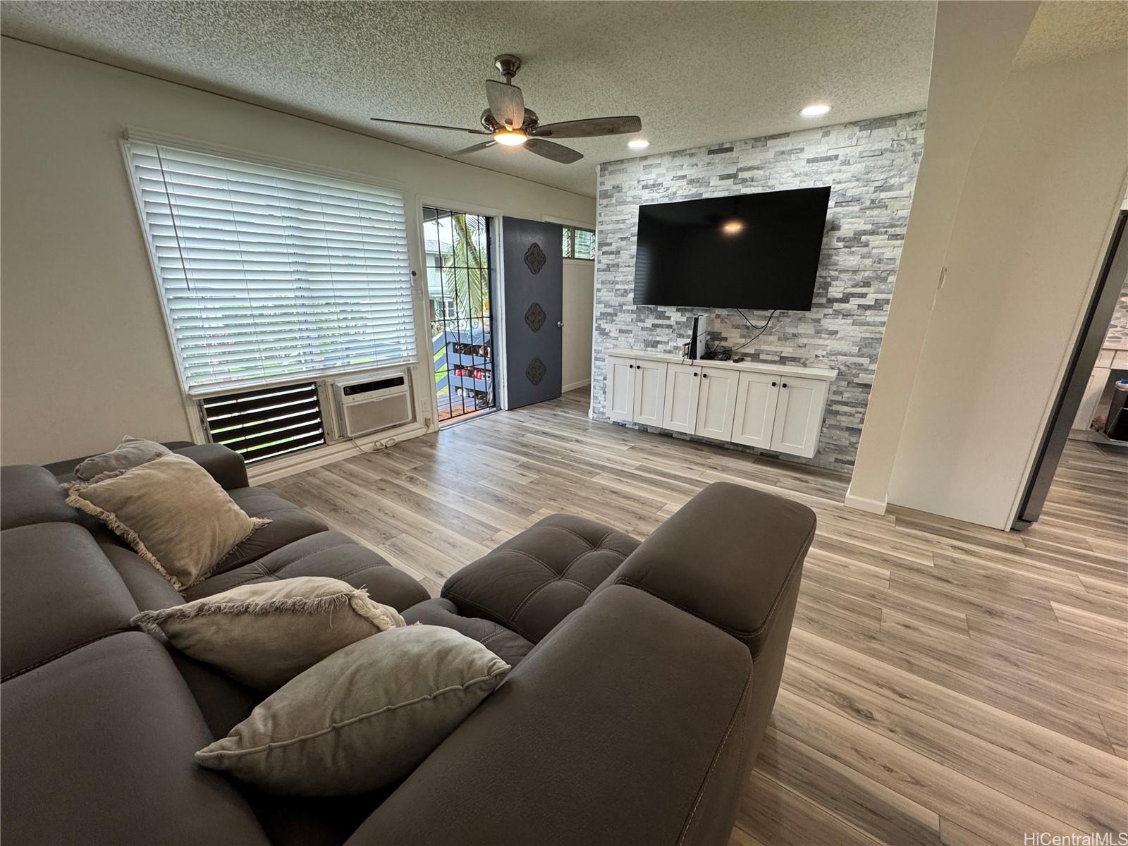 TWO SIDE-BY-SIDE PARKING STALLS! This well-maintained 3-bedroom, 2 FULL bath townhouse (tax records show 1.5 baths) features a spacious open-concept layout with 2022 renovations. The enclosed lanai has been converted into a separate laundry room with storage and a home office. Recessed lighting enhances the living room, kitchen, and office areas. Pantry and laundry rooms feature convenient pocket doors that save space and improve flow. A stylish accent wall with TV mount included adds a modern touch. The current maintenance fee is $575; increasing to $635 effective April 1, 2026. Conveniently located near Pearl Harbor, Pearlridge Mall, schools, shopping, dining, and easy freeway access. Contact your Realtor to schedule a private showing. Owner-occupied.