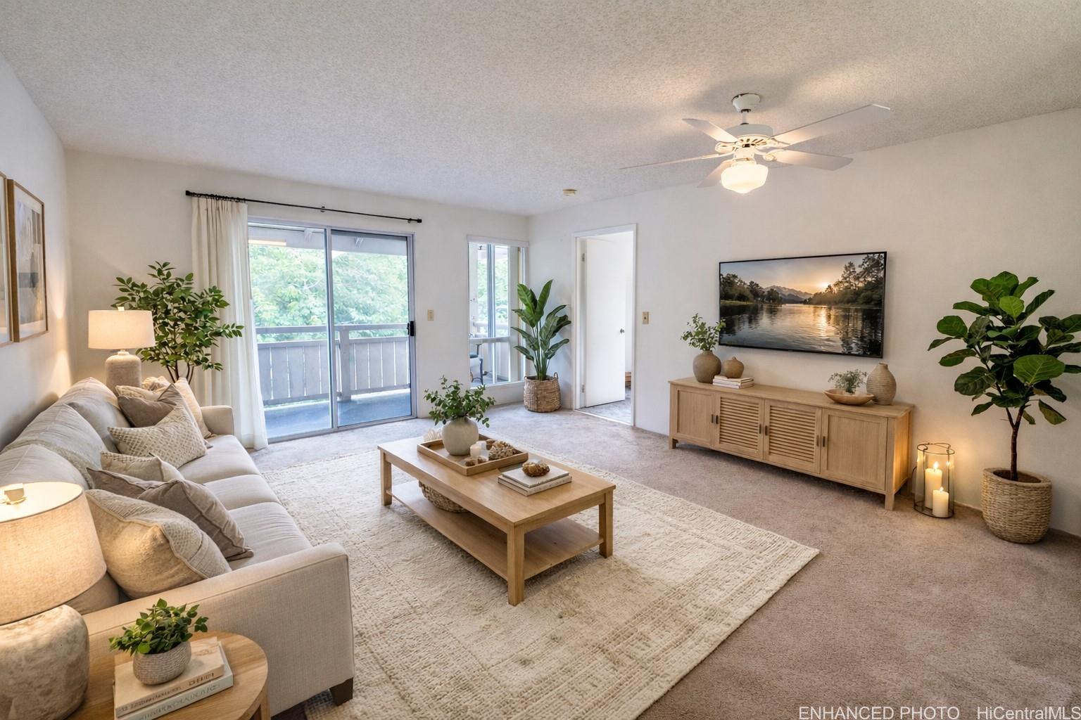 Step into island living in this spacious 3-bedroom, 2-bath townhouse with 2 parking stalls, located in the sought-after Ridge at Launani Valley. Tucked among lush greenery and cooled by gentle valley breezes, this residence offers a comfortable layout with plenty of potential to personalize and enhance over time. The interior features an open-concept living and an area that flows naturally to your private lanai—perfect for relaxing while enjoying the peaceful setting and added privacy of no rear neighbors being a corner unit. Enjoy the convenience of two assigned parking stalls with plenty of guest parking. Residents appreciate the well-maintained community with nearby walking paths, parks, and playgrounds that complement the serene surroundings. Ideally positioned close by from Schofield Barracks, Wheeler Army Airfield, Mililani Town, Leilehua Golf Course, freeway access, and everyday essentials, this location makes commuting and daily errands a breeze. Whether you're looking for more space, a primary residence, or an investment opportunity, this home offers a great combination of value, comfort, and a relaxed lifestyle within Launani Valley! Don't wait, schedule a viewing today!