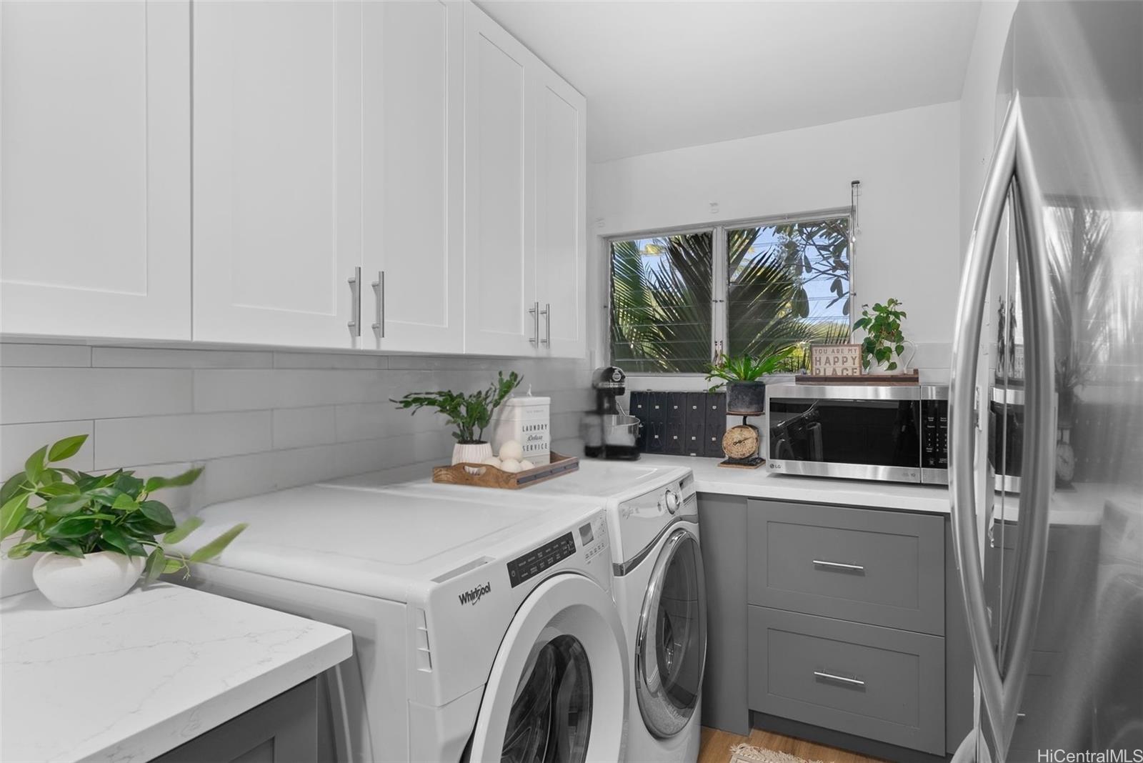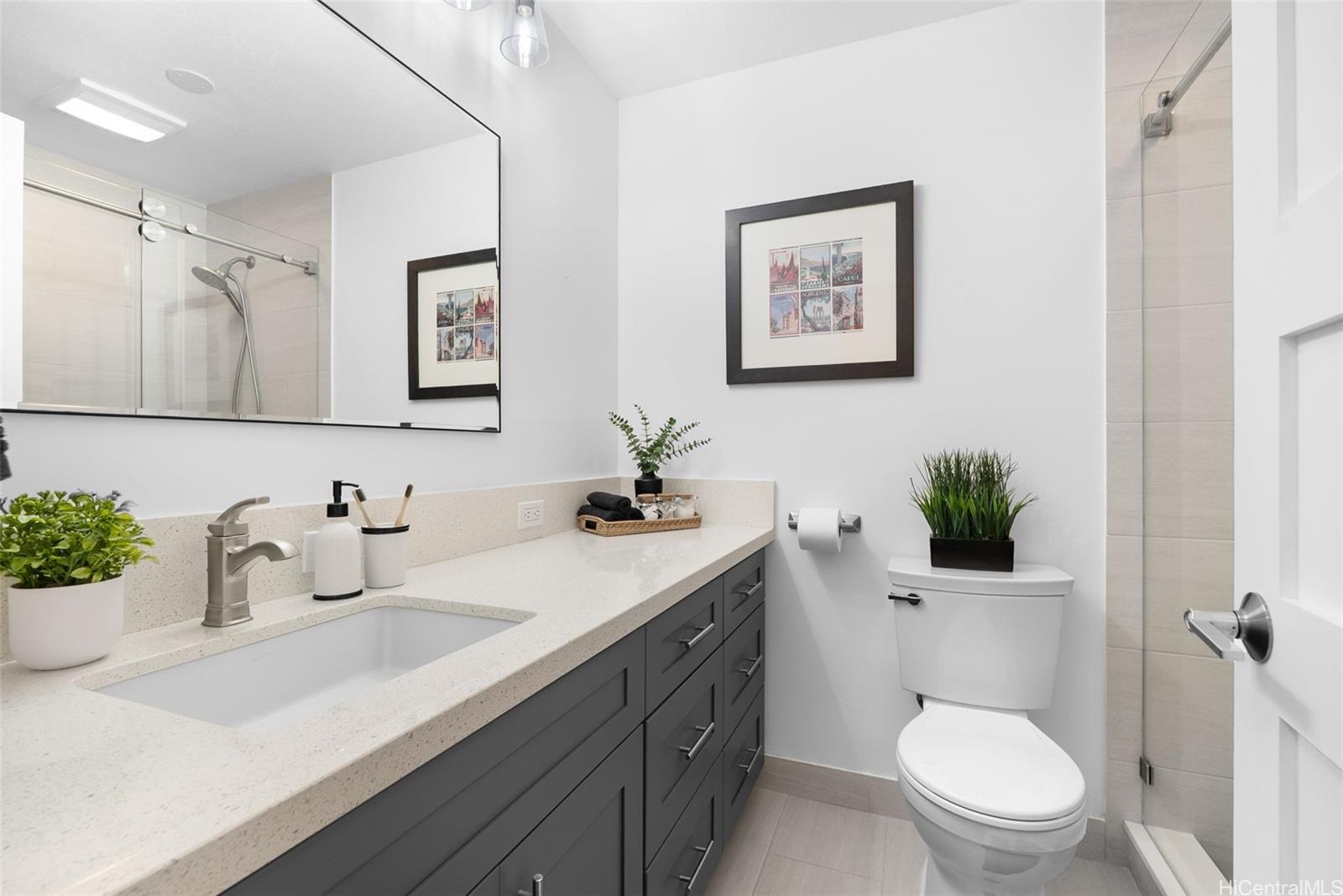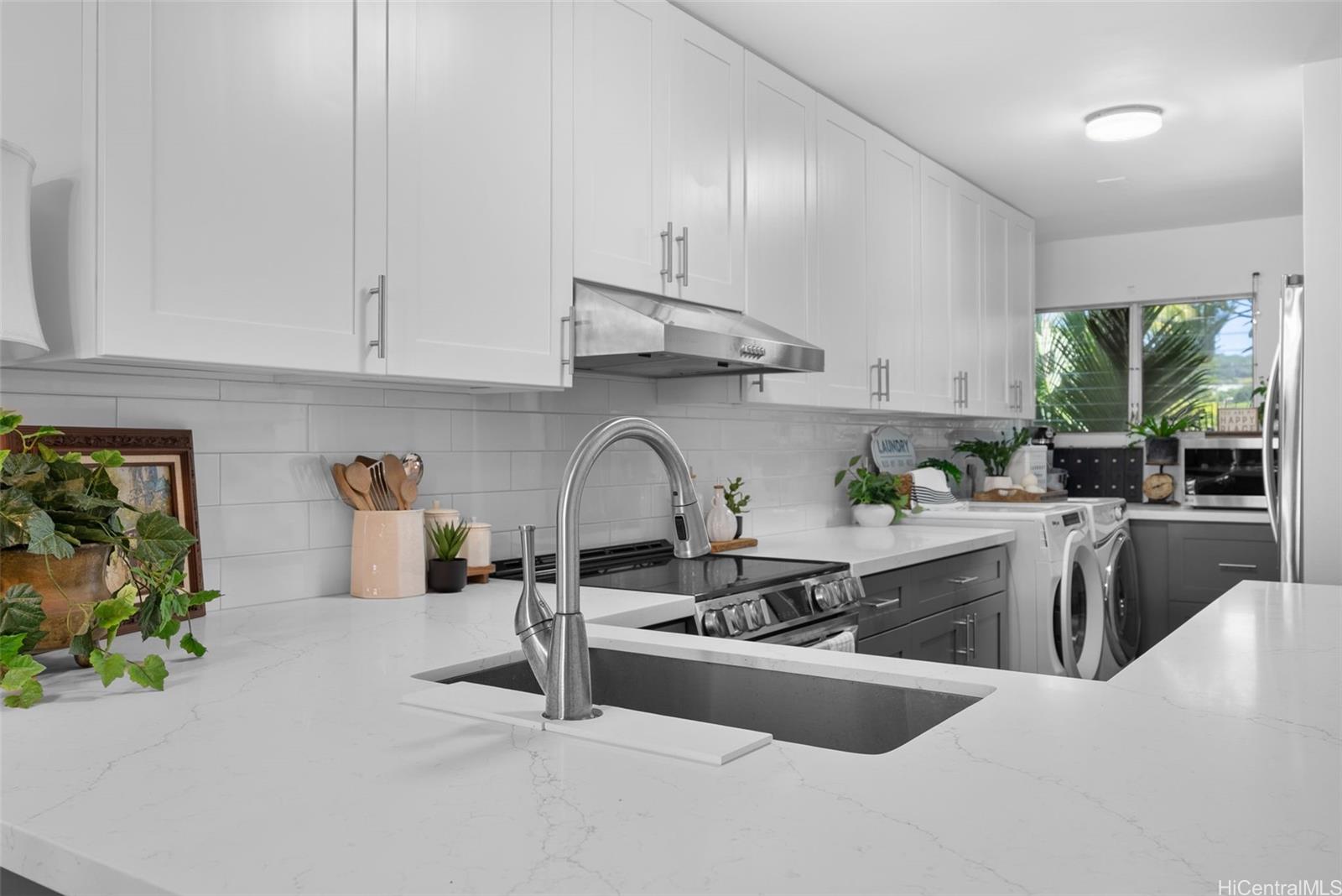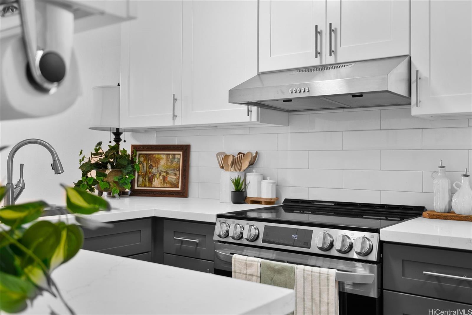 showcases a recently and tastefully renovated kitchen with modern cabinetry, quartz countertops, and stainless steel appliances,