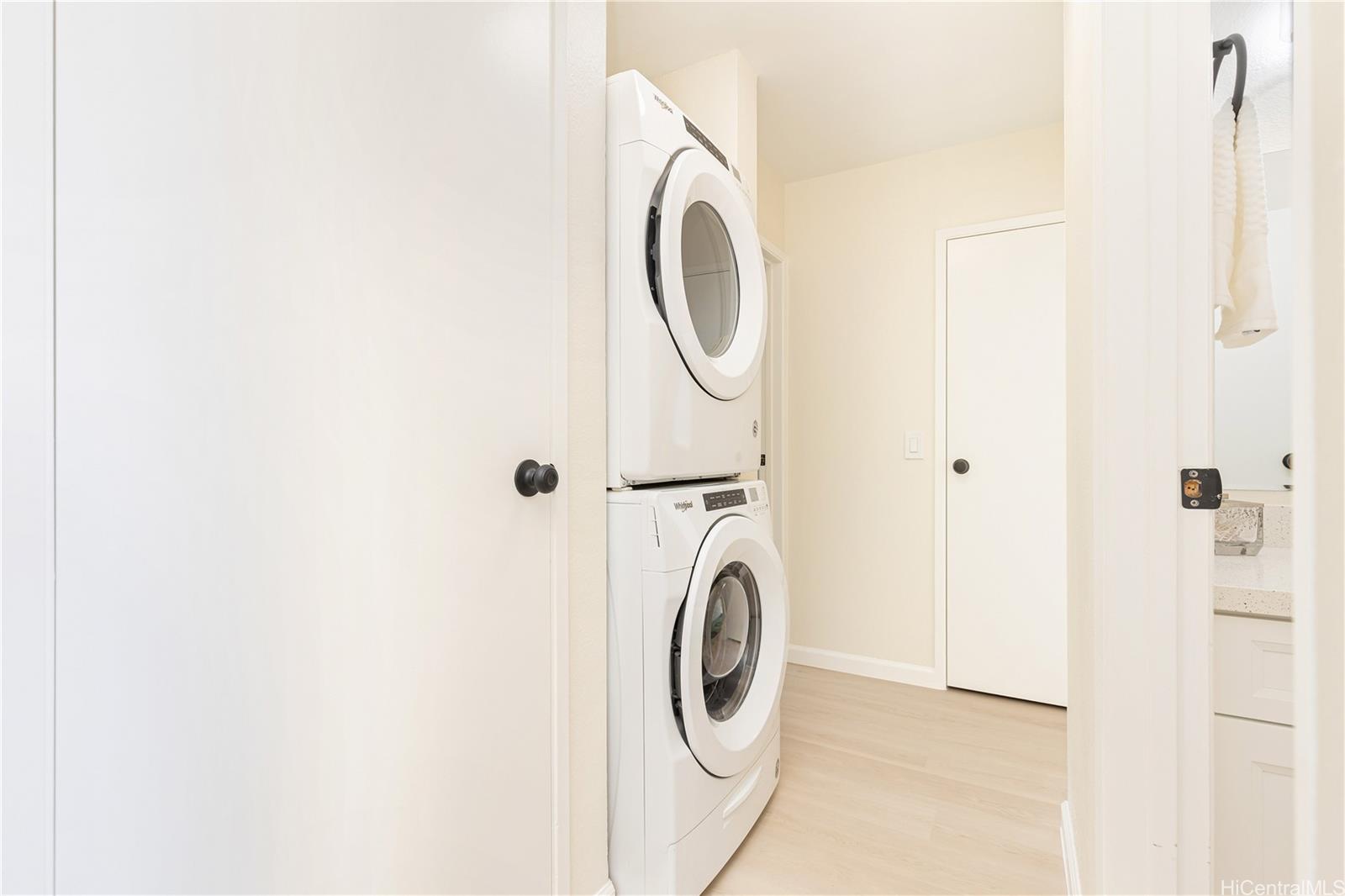 Luxury Vinyl Tile plank flooring runs through the main living areas and bedrooms, combining style and durability. A washer and dryer are conveniently located in-unit for added ease.