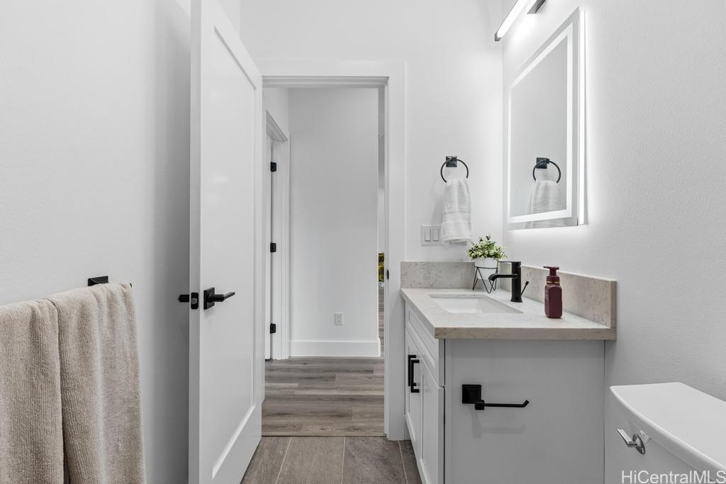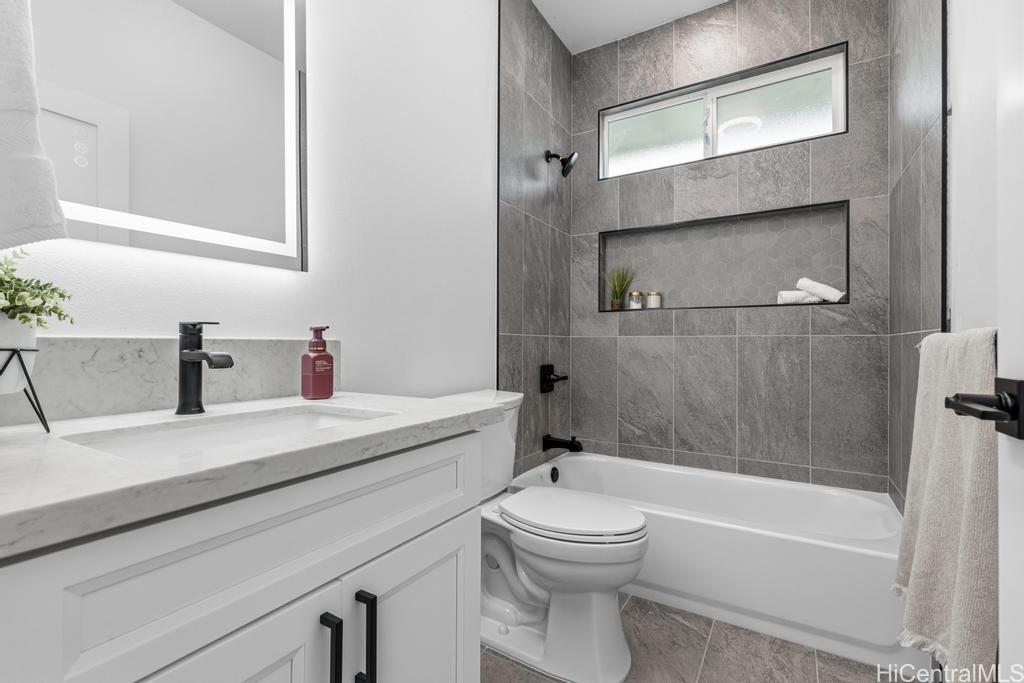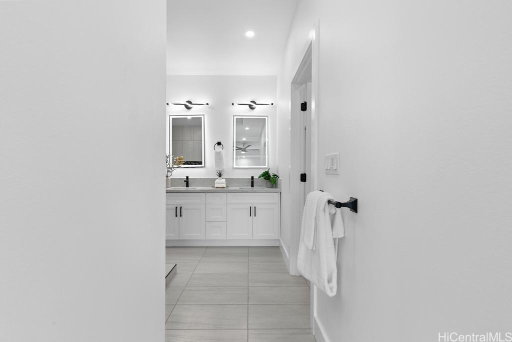 Two guest bedrooms are positioned near a beautifully finished guest bath with a tiled tub surround and modern lighted mirror. Privately located on the opposite wing of the home, the primary suite is exceptionally large and offers a spa inspired bath with dual vanities, lighted mirrors, an oversized open concept walk in shower, and a walk in closet.