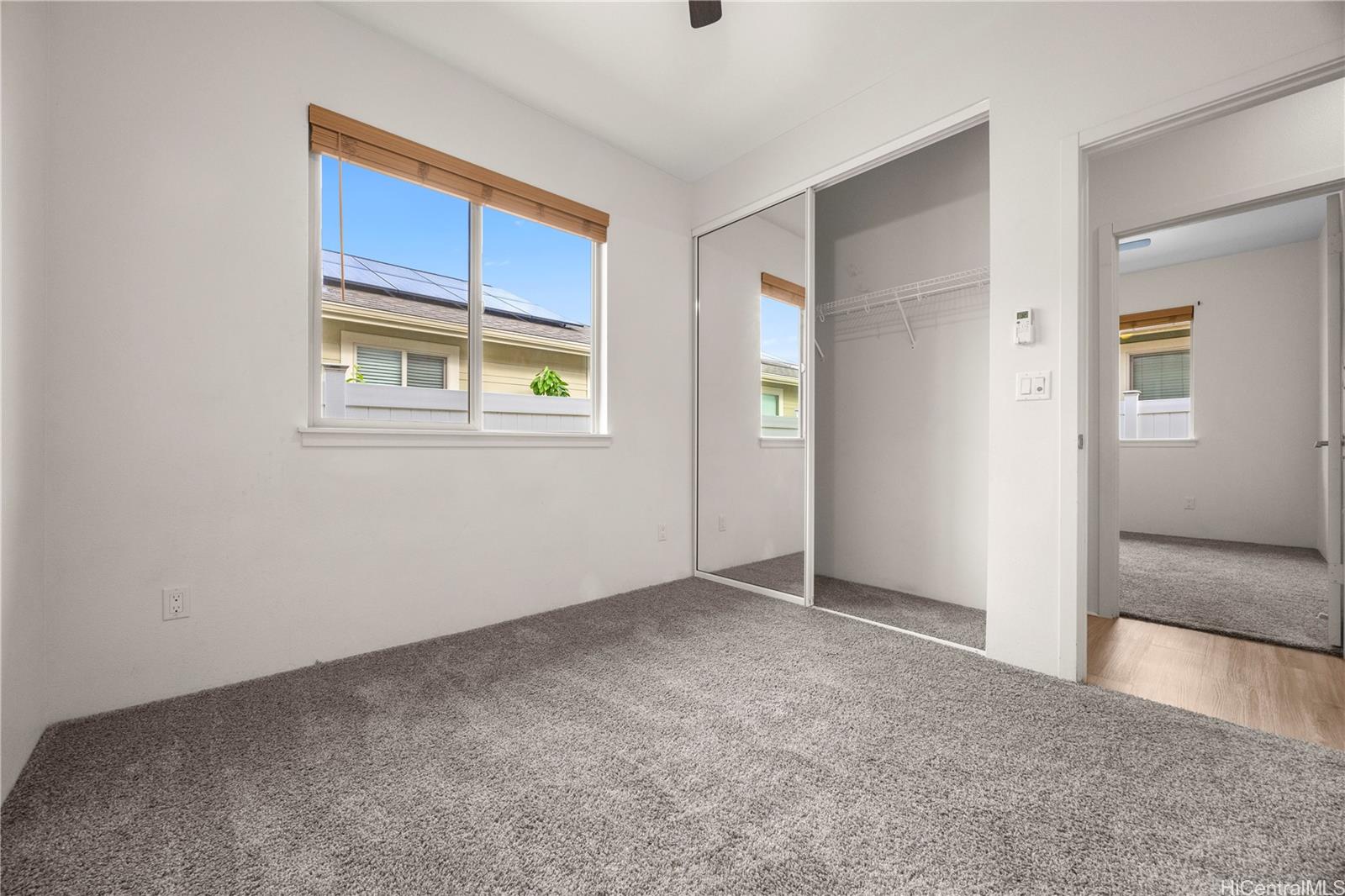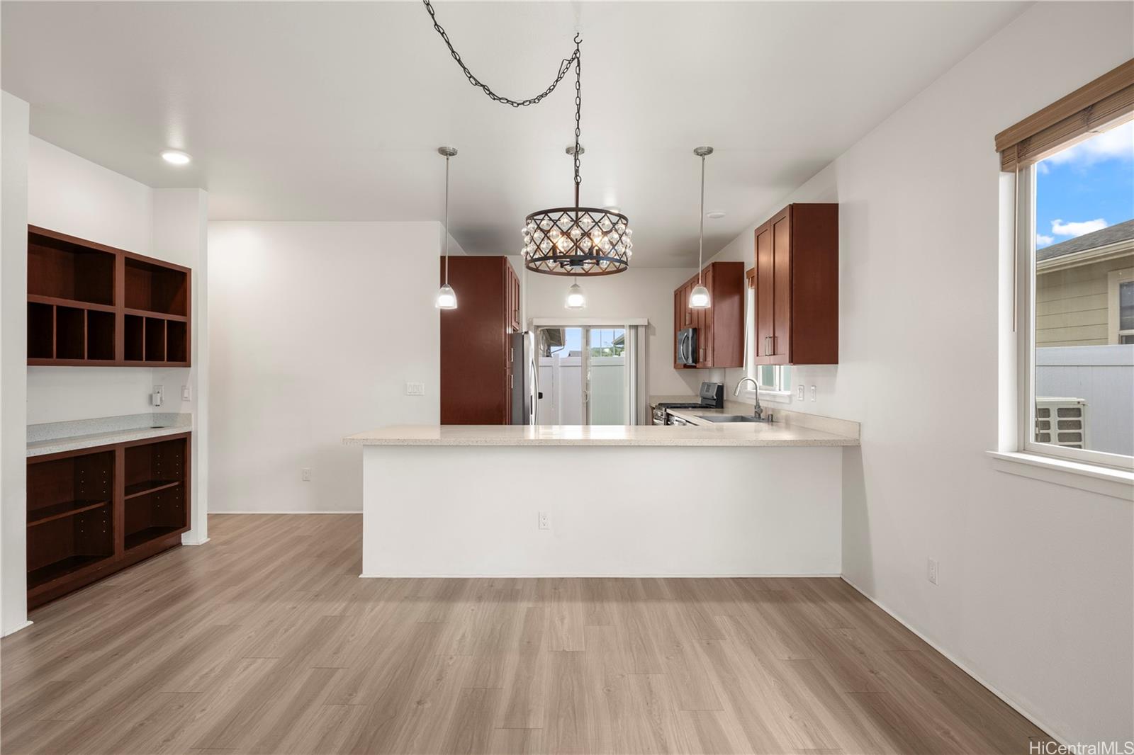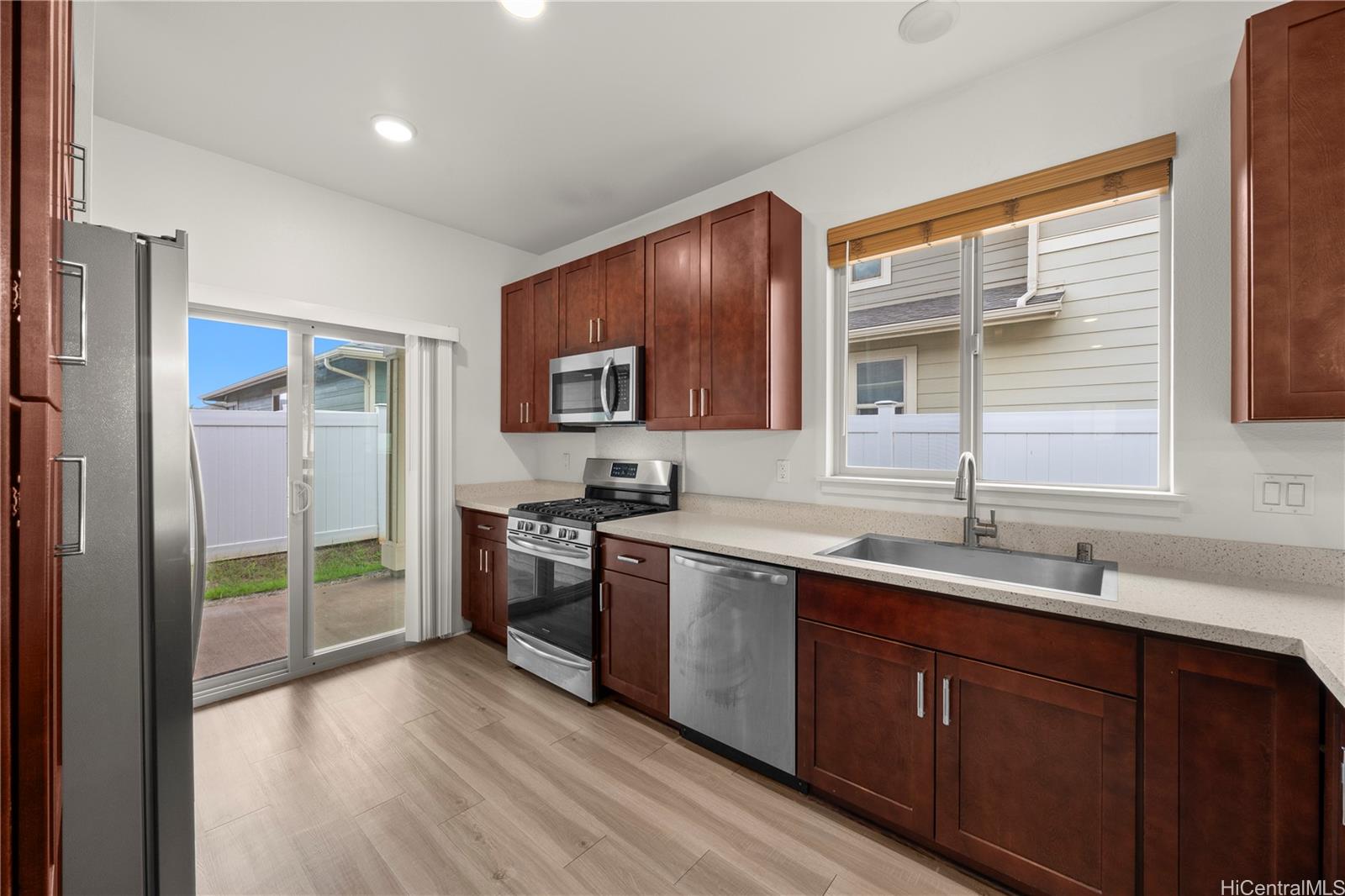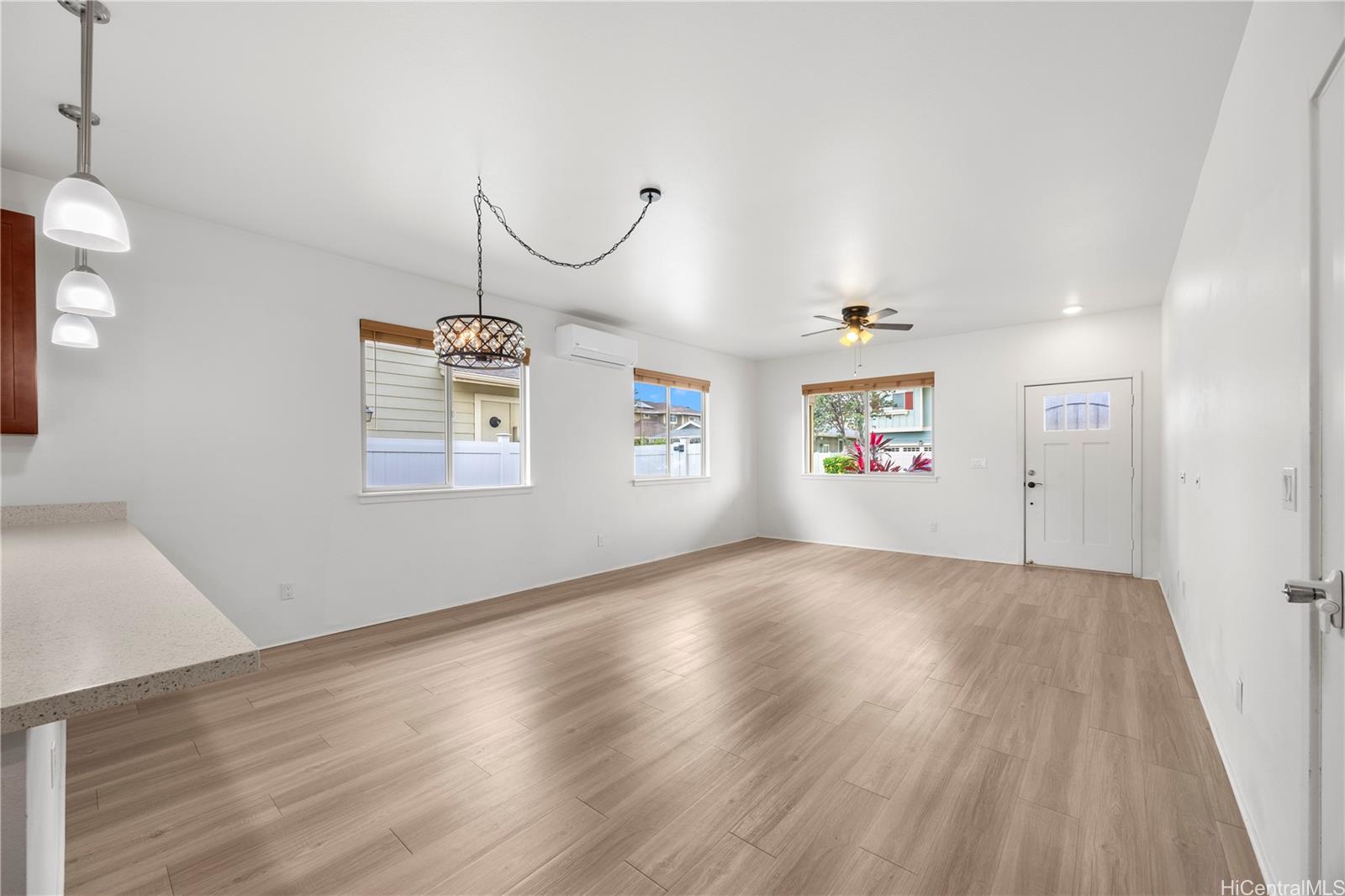 Highly desirable single-level 3 bedroom, 2 bathroom home located in the master-planned community of Ho‘opili. This well-maintained residence features an open concept layout with luxury vinyl plank flooring throughout the main living areas and carpeted bedrooms for added comfort. The modern kitchen is appointed with upgraded countertops and ample cabinetry, ideal for both everyday living and entertaining. Enjoy year-round comfort with split AC units in every room. The attached garage includes overhead storage, maximizing functionality and space. Conveniently located near parks, walking paths, shopping, dining, and easy access to major roadways and the Skyline. A great opportunity to own a single level home in one of Ewa Plain’s most sought after communities.
