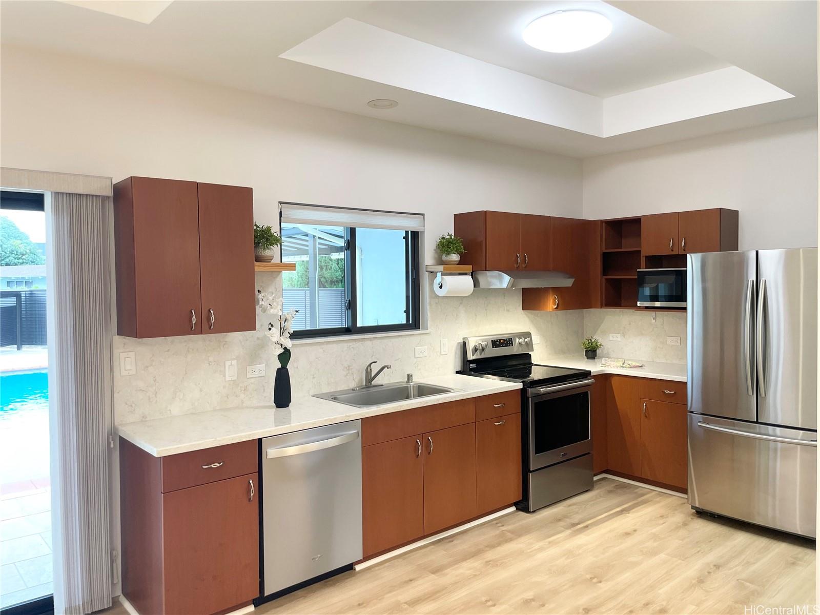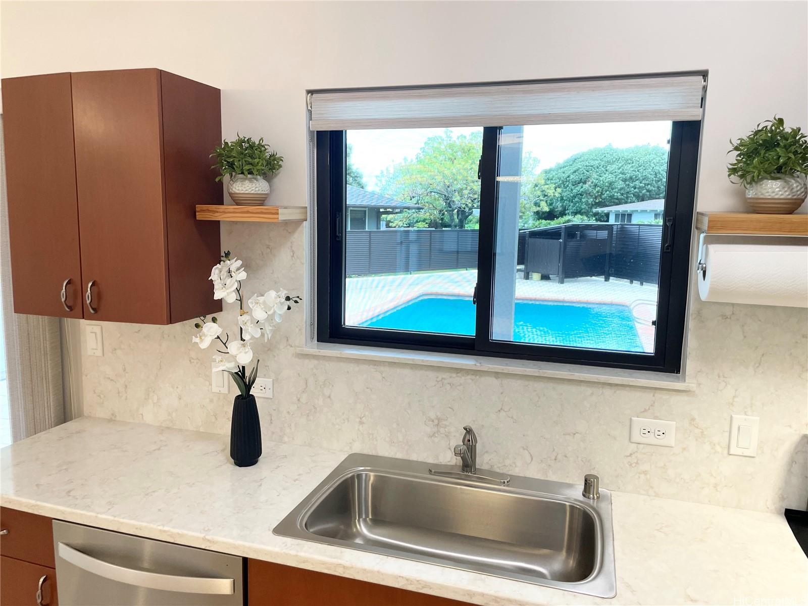 Don’t miss this beautifully maintained 8-year-old single-level home designed for comfortable living and aging in place. This spacious 4-bedroom, 2.5-bath residence also includes a dedicated home office, making it perfect for remote work or flexible living needs. The home features wide hallways and generously sized rooms, offering excellent ADA accessibility throughout. Recent updates are new dishwasher, new security system & hard wire alarm system. Energy efficiency is a major highlight with 24 owned photovoltaic panels and a Tesla battery system, helping reduce energy costs while providing reliable power. Outdoor living is just as impressive. Enjoy a refreshing saltwater pool with a large pool deck, a covered poolside area ideal for relaxing or entertaining, and additional outdoor storage. The large garage offers abundant storage space and includes a convenient laundry area. Located in the highly desirable Niu Valley neighborhood, offering both tranquility and convenience. Just minutes from dining, shopping & everyday essentials at Niu Valley Center, minutes to Hawaii Kai neighborhood. This rare single-level home combines modern efficiency, accessibility - an unbeatable location.