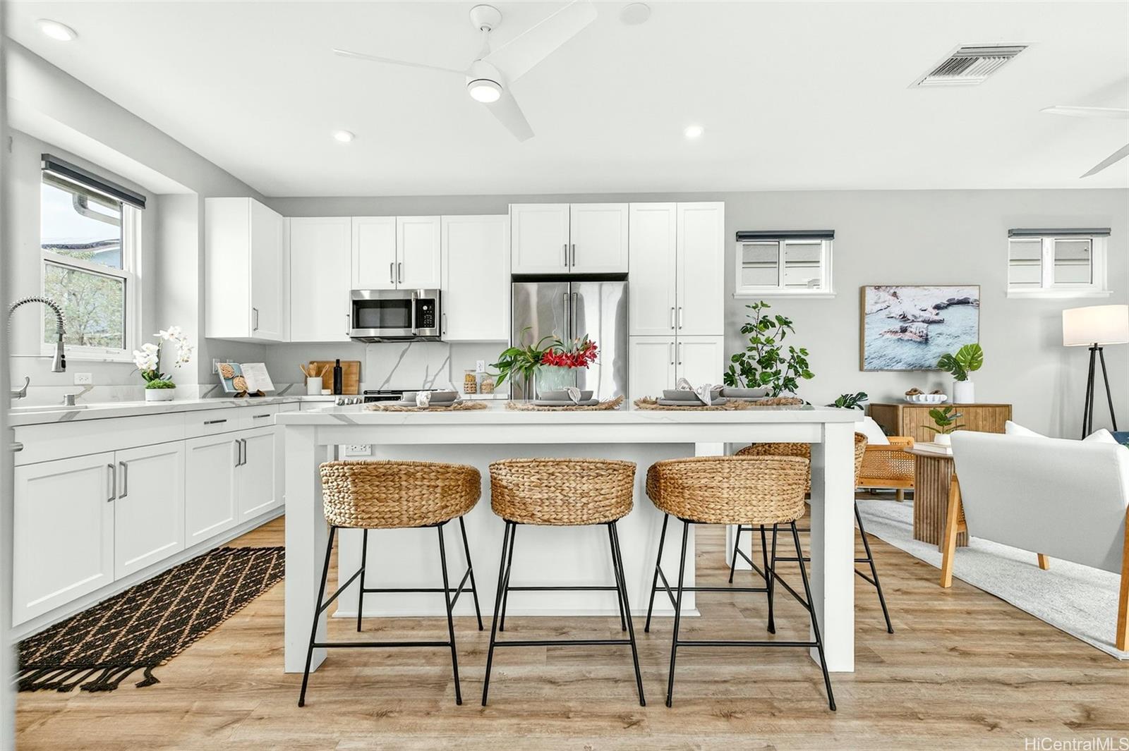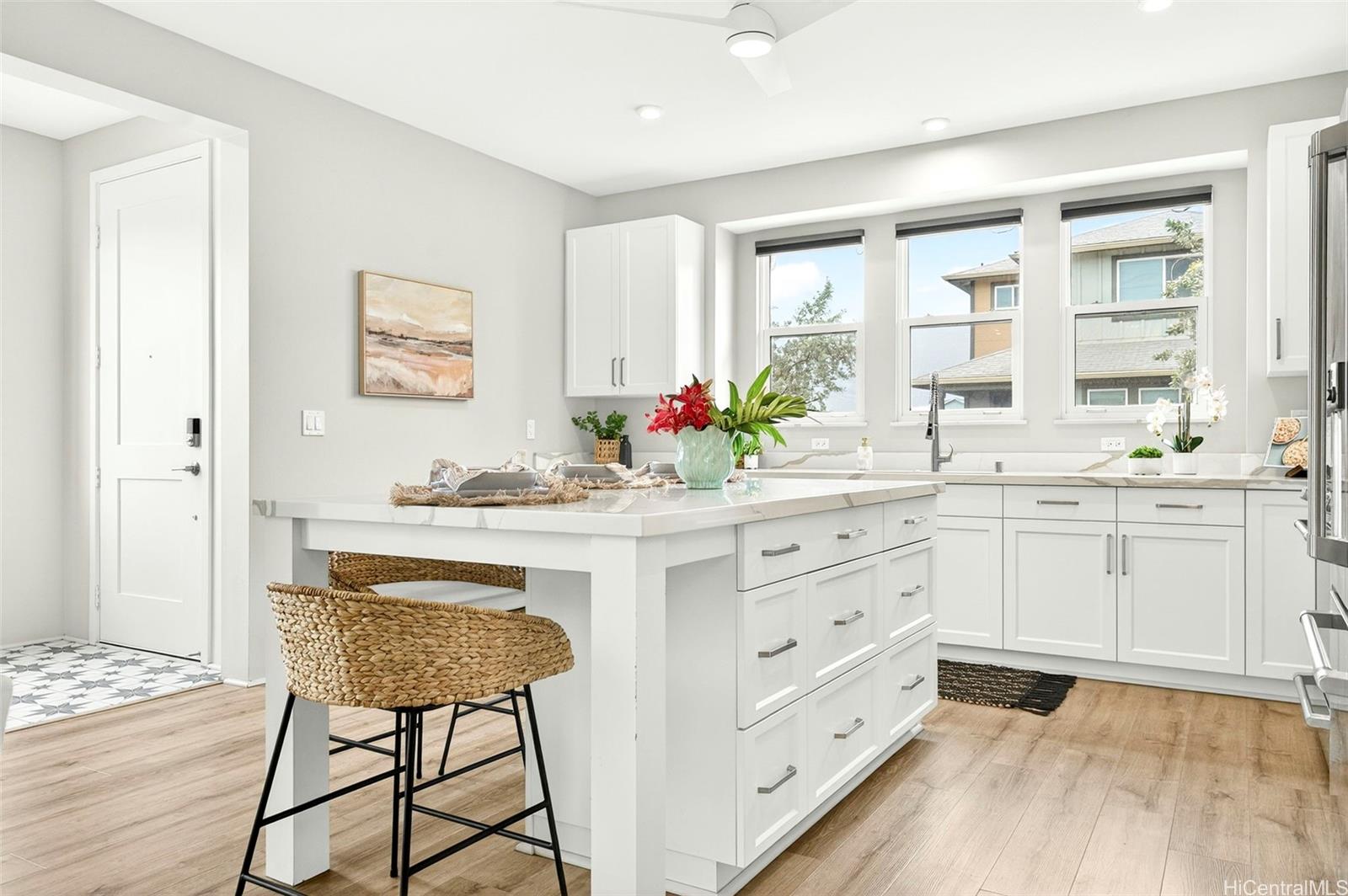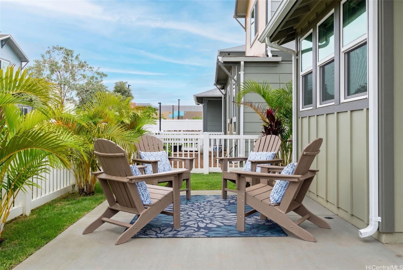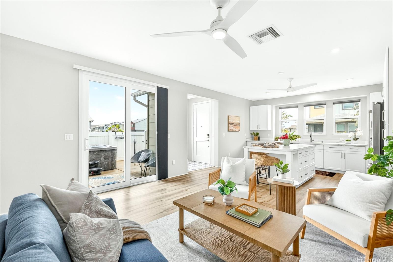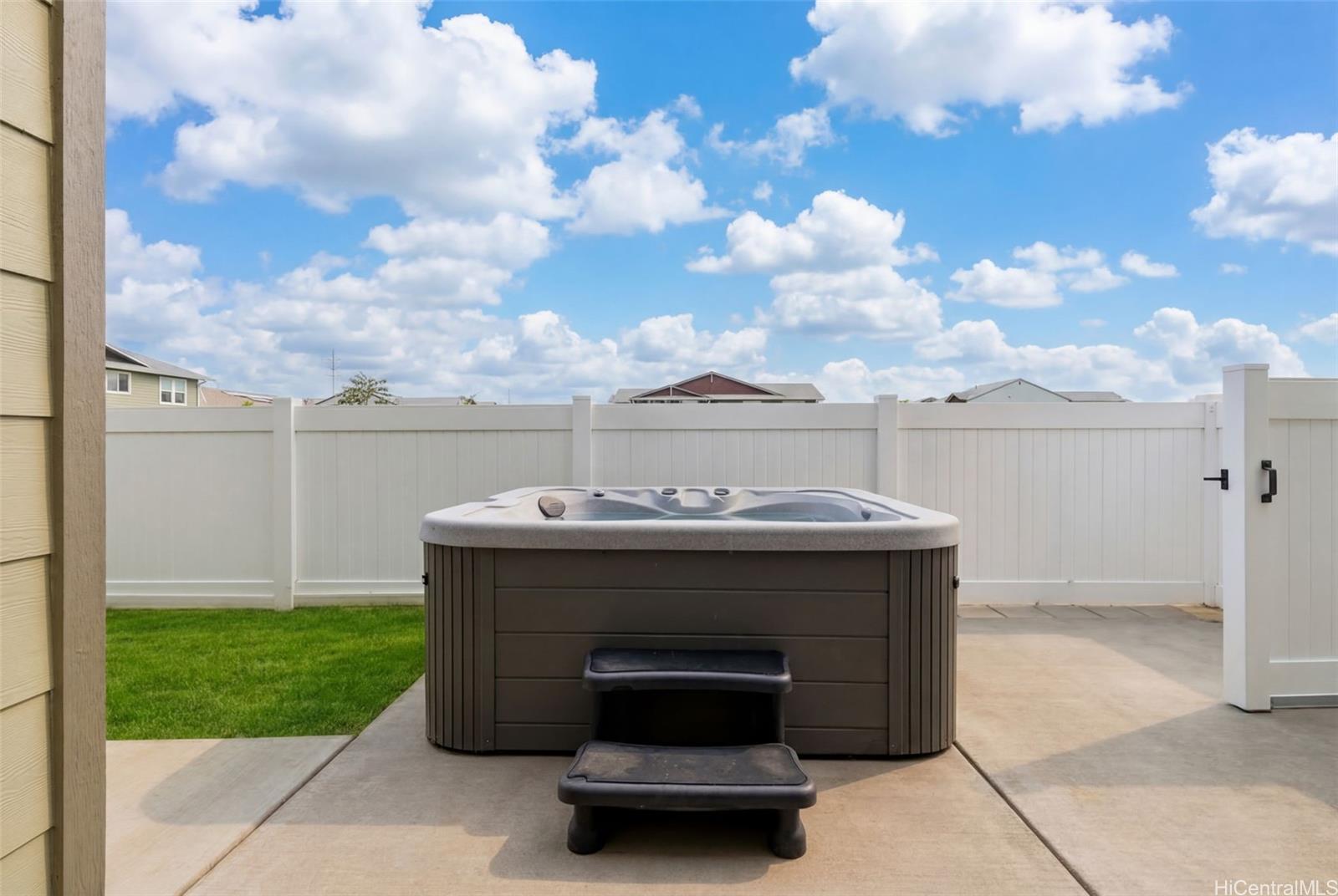 Welcome to the highly sought-after Ka’ulu neighborhood! This newer 3-bed, 2.5-bath single-family home offers 1,673 sq ft of thoughtfully designed living space, blending modern style, privacy & energy efficiency. The open-concept layout features 9-ft ceilings, luxury vinyl plank flooring throughout, custom tile work, and a versatile BONUS LOFT. The kitchen is a designer's dream with white shaker cabinetry, quartz counters, and upgraded GE Café appliances, perfect for everyday living and entertaining. Enjoy peace of mind with PV SOLAR and TESLA POWERWALL battery backup, helping reduce electricity costs while powering the home’s central A/C. Ideally situated on a CORNER LOT along a greenbelt with only five neighboring homes, the property offers added privacy with no neighbors on one side. The beautifully landscaped yard has been professionally designed with an upgraded sprinkler system, stepping stones, lush tropical plants, and two finished concrete lanais- perfect for entertaining! Unwind in the DELUXE JACUZZI in your private, fenced backyard retreat. Conveniently located just minutes from H-1, with easy access to beaches, shopping, & dining in the growing “Second City” of Kapolei.
