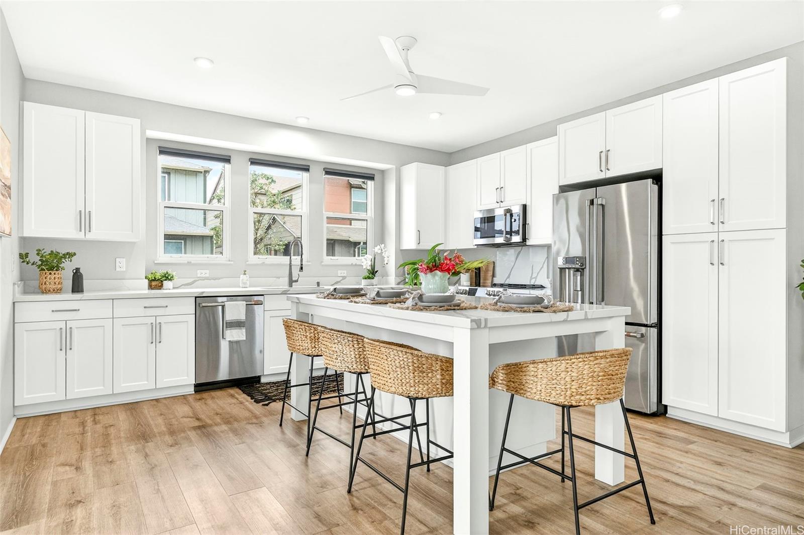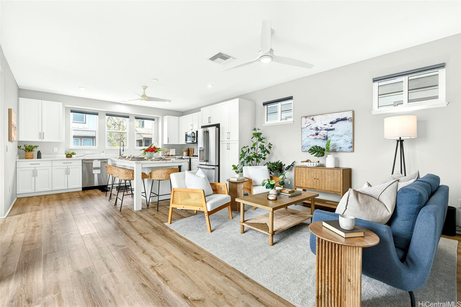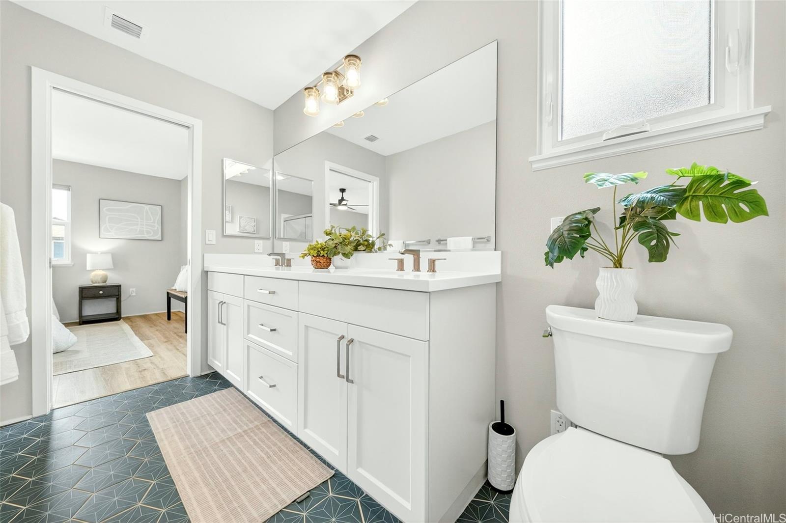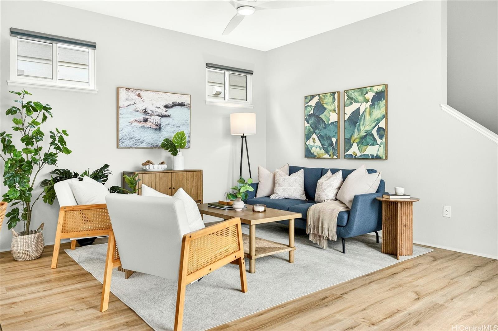 Welcome to the highly sought-after Ka’ulu neighborhood! This newer 3-bed, 2.5-bath single-family home offers 1,673 sq ft of thoughtfully designed living space, blending modern style, privacy & energy efficiency. The open-concept layout features 9-ft ceilings, luxury vinyl plank flooring throughout, custom tile work, and a versatile BONUS LOFT. The kitchen is a designer's dream with white shaker cabinetry, quartz counters, and upgraded GE Café appliances, perfect for everyday living and entertaining. Enjoy peace of mind with PV SOLAR and TESLA POWERWALL battery backup, helping reduce electricity costs while powering the home’s central A/C. Ideally situated on a CORNER LOT along a greenbelt with only five neighboring homes, the property offers added privacy with no neighbors on one side. The beautifully landscaped yard has been professionally designed with an upgraded sprinkler system, stepping stones, lush tropical plants, and two finished concrete lanais- perfect for entertaining! Unwind in the DELUXE JACUZZI in your private, fenced backyard retreat. Conveniently located just minutes from H-1, with easy access to beaches, shopping, & dining in the growing “Second City” of Kapolei.