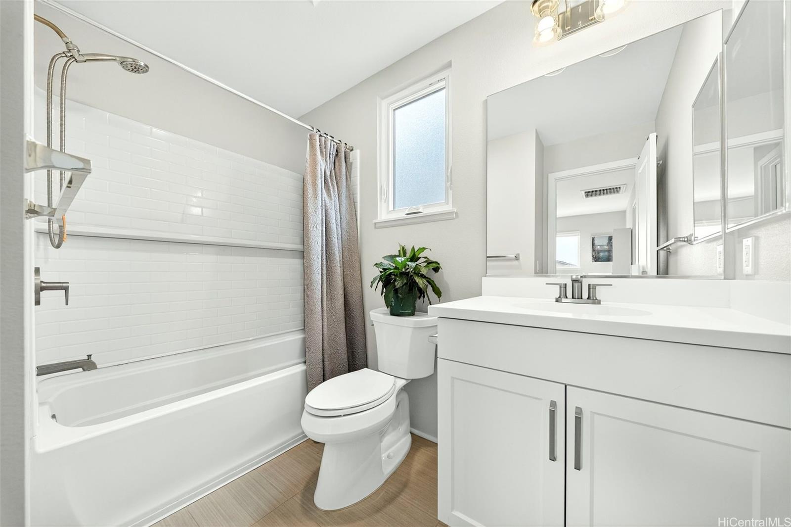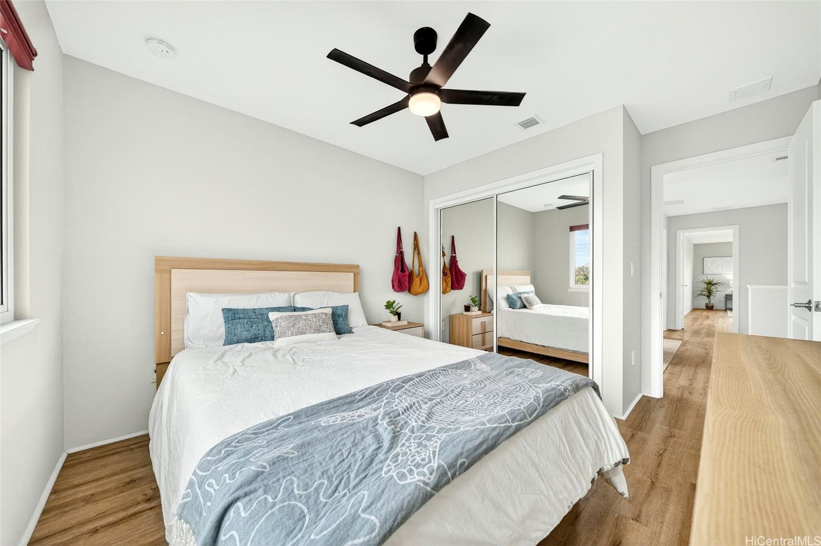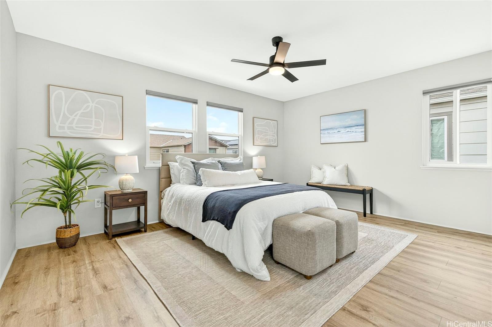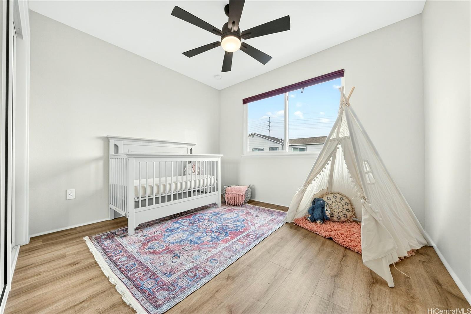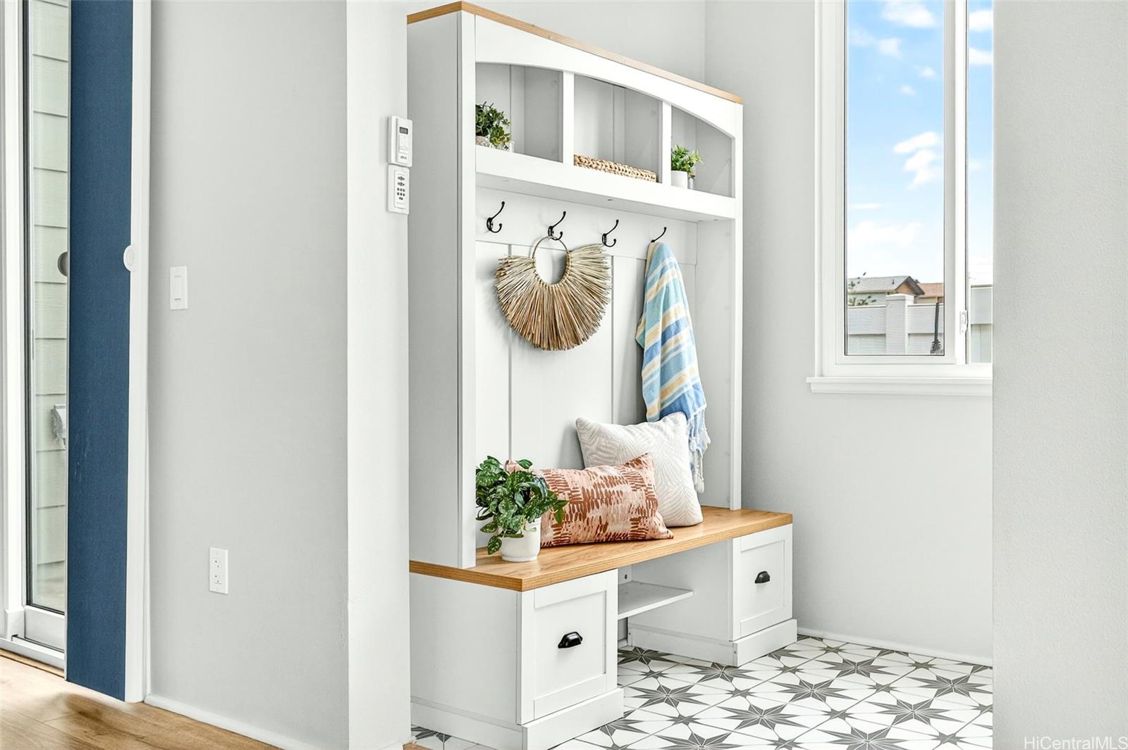 Welcome to the highly sought-after Ka’ulu neighborhood! This newer 3-bed, 2.5-bath single-family home offers 1,673 sq ft of thoughtfully designed living space, blending modern style, privacy & energy efficiency. The open-concept layout features 9-ft ceilings, luxury vinyl plank flooring throughout, custom tile work, and a versatile BONUS LOFT. The kitchen is a designer's dream with white shaker cabinetry, quartz counters, and upgraded GE Café appliances, perfect for everyday living and entertaining. Enjoy peace of mind with PV SOLAR and TESLA POWERWALL battery backup, helping reduce electricity costs while powering the home’s central A/C. Ideally situated on a CORNER LOT along a greenbelt with only five neighboring homes, the property offers added privacy with no neighbors on one side. The beautifully landscaped yard has been professionally designed with an upgraded sprinkler system, stepping stones, lush tropical plants, and two finished concrete lanais- perfect for entertaining! Unwind in the DELUXE JACUZZI in your private, fenced backyard retreat. Conveniently located just minutes from H-1, with easy access to beaches, shopping, & dining in the growing “Second City” of Kapolei.