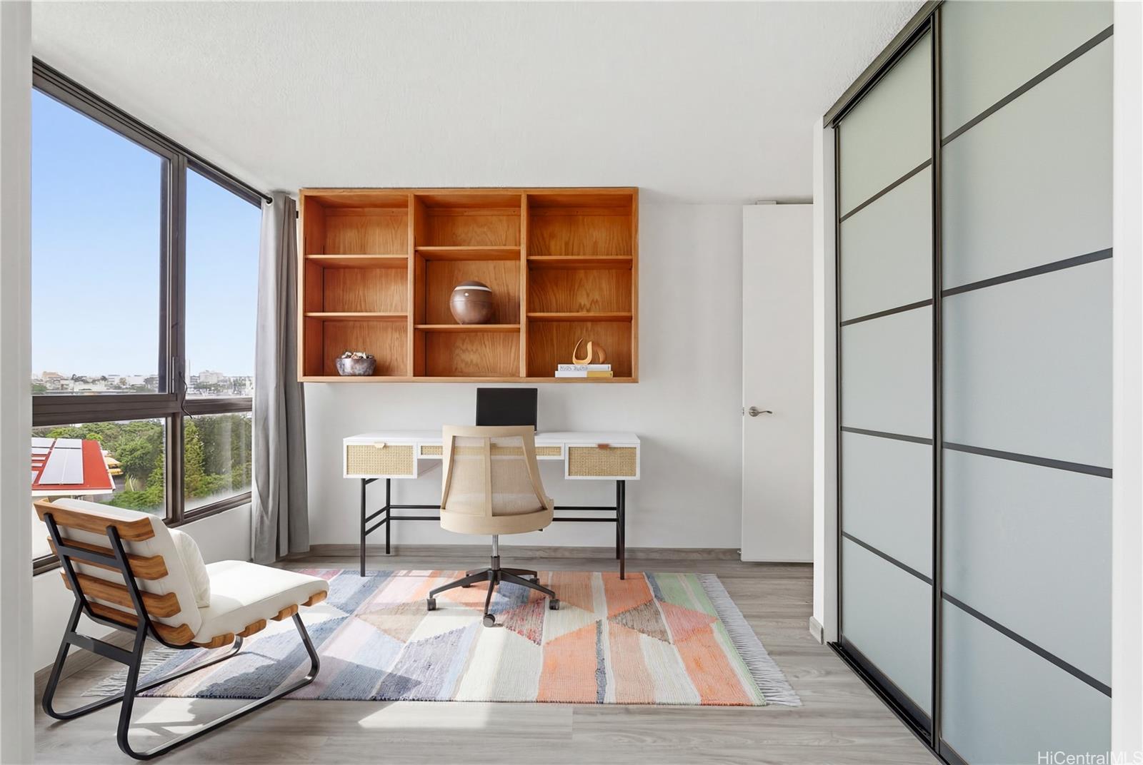 カイムキの隠れた宝石。すぐに入居または賃貸に出せます。涼しい貿易風のそよ風、美しい木々の梢の庭と山の景色、そして暑い午後の日差しのない東の朝の日の出をお楽しみください。これは必見です。この高層階のユニットは、自然光がたっぷりと差し込み、絵のように美しい窓とスライド式のガラスドアがあり、2 つの広々としたラナイがあります。メインの寝室と専用バスルームには 2 つのクローゼットがあります。2 番目の寝室は、作り付けの棚とリビングルームに開く 2 つのドアを備えた柔軟なレイアウトで、オフィスやクラフト スペースに最適です。バスタブ付きのフル バスルーム 2 つ、フル サイズの洗濯機と乾燥機。駐車場 2 台 (1 つは屋根付き、1 つは屋外)。最近、新しいビニール床で改装されました。ペットも可。管理費には、水道と下水道、インターネット、ケーブル TV、建物のハリケーン保険、24 時間セキュリティ、常駐管理人、および物件のメンテナンスが含まれます。シャミナード大学とセントルイス高校のすぐ隣という便利な立地で、ハワイ大学マノア校へも徒歩圏内です!東西両方向の高速道路へのアクセスも容易で、ワイキキやダウンタウンにも近いです。道路から少し奥まった場所に位置し、樹齢を重ねた木々に囲まれたプライベートパーク、プール、バスケットボールコート、テニスコート、ジム、レクリエーションルームを備えています!アメニティも充実。とても楽しい空間です!ゲスト用駐車場も多数ございます。現状渡しとなります。
