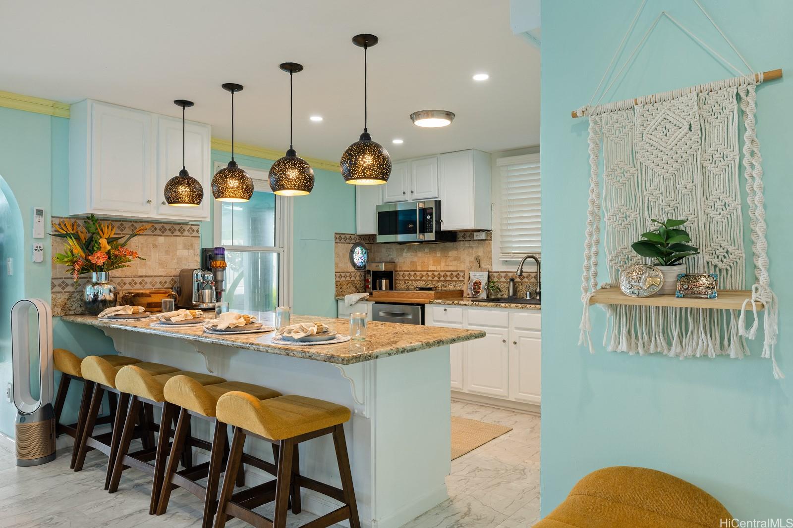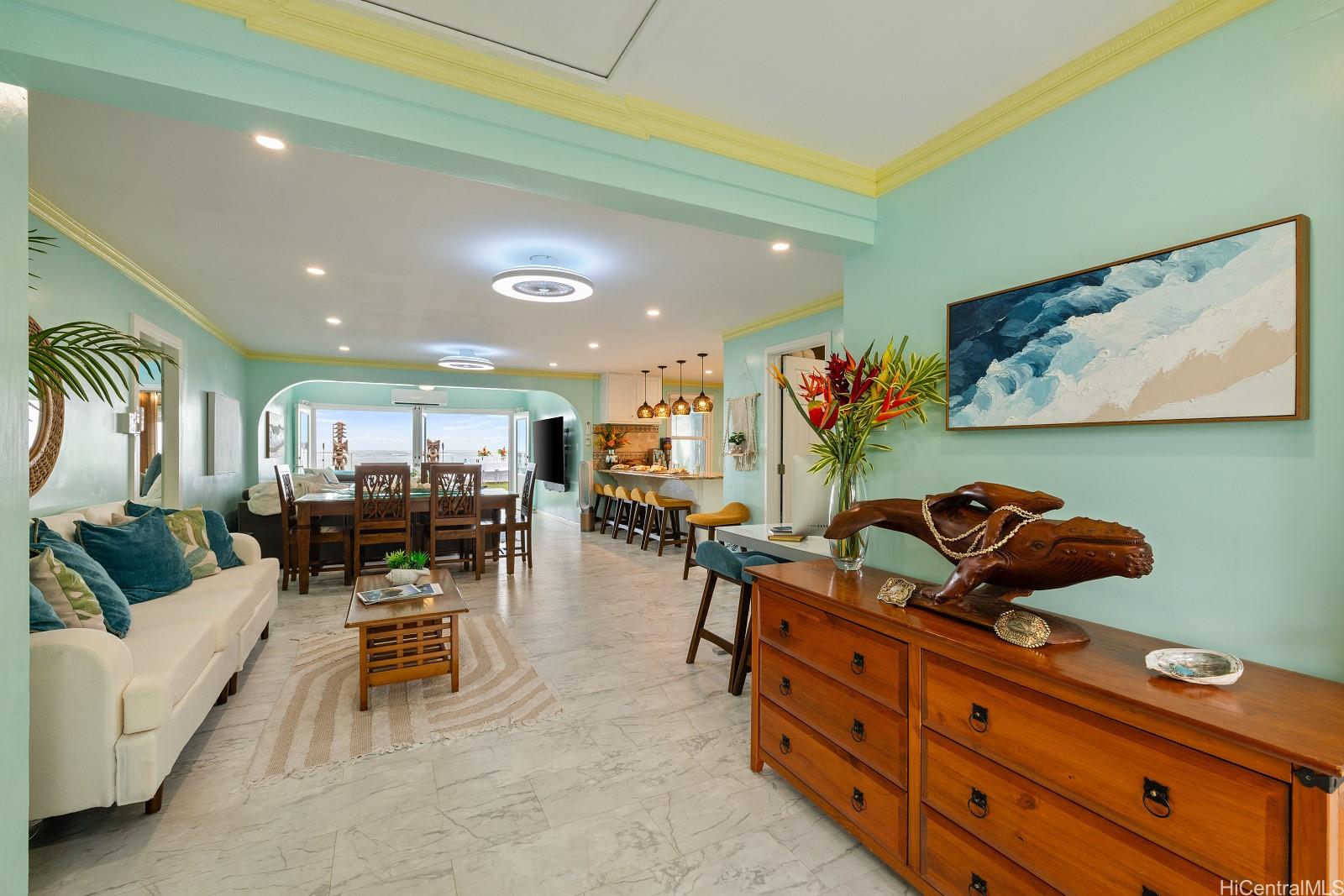 Hawai‘i. Step inside to discover an updated interior featuring high-end finishes, modern flooring, and designer touches throughout. The gourmet kitchen is equipped with luxury appliances, perfect for entertaining or enjoying quiet seaside mornings.