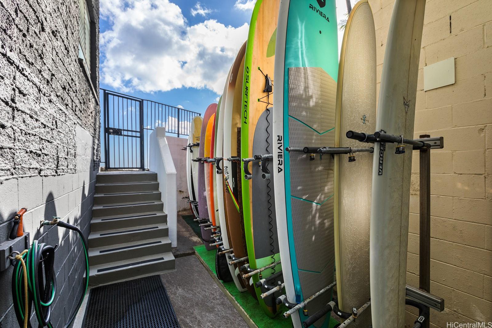 Wake up to Diamond Head views from your bed and catch gorgeous ocean glimpses from the spacious wrap-around lanai. This breezy, light-filled, private end unit 1BR features expansive, approximately 9 ft ceilings (found on 5th floor only), a beautifully updated kitchen and bath with high-end appliances and quartz countertops, built-in foyer storage, and an integrated kitchen water filtration system. Large onsite storage unit included; bike and surfboard storage available.