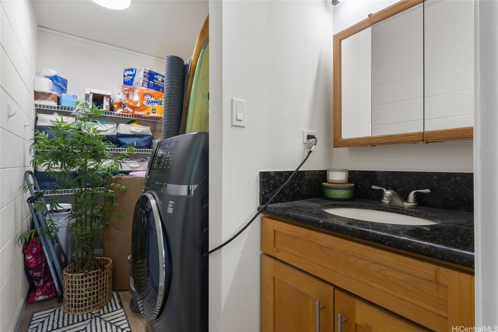The home features a remodeled kitchen, vinyl plank flooring, fresh interior paint, and popcorn ceiling removal. Enjoy city views from the preferred mauka side. This unit is not facing the freeway, offering a quieter side of the building. Functional layout includes a lanai and in-unit washer/dryer.