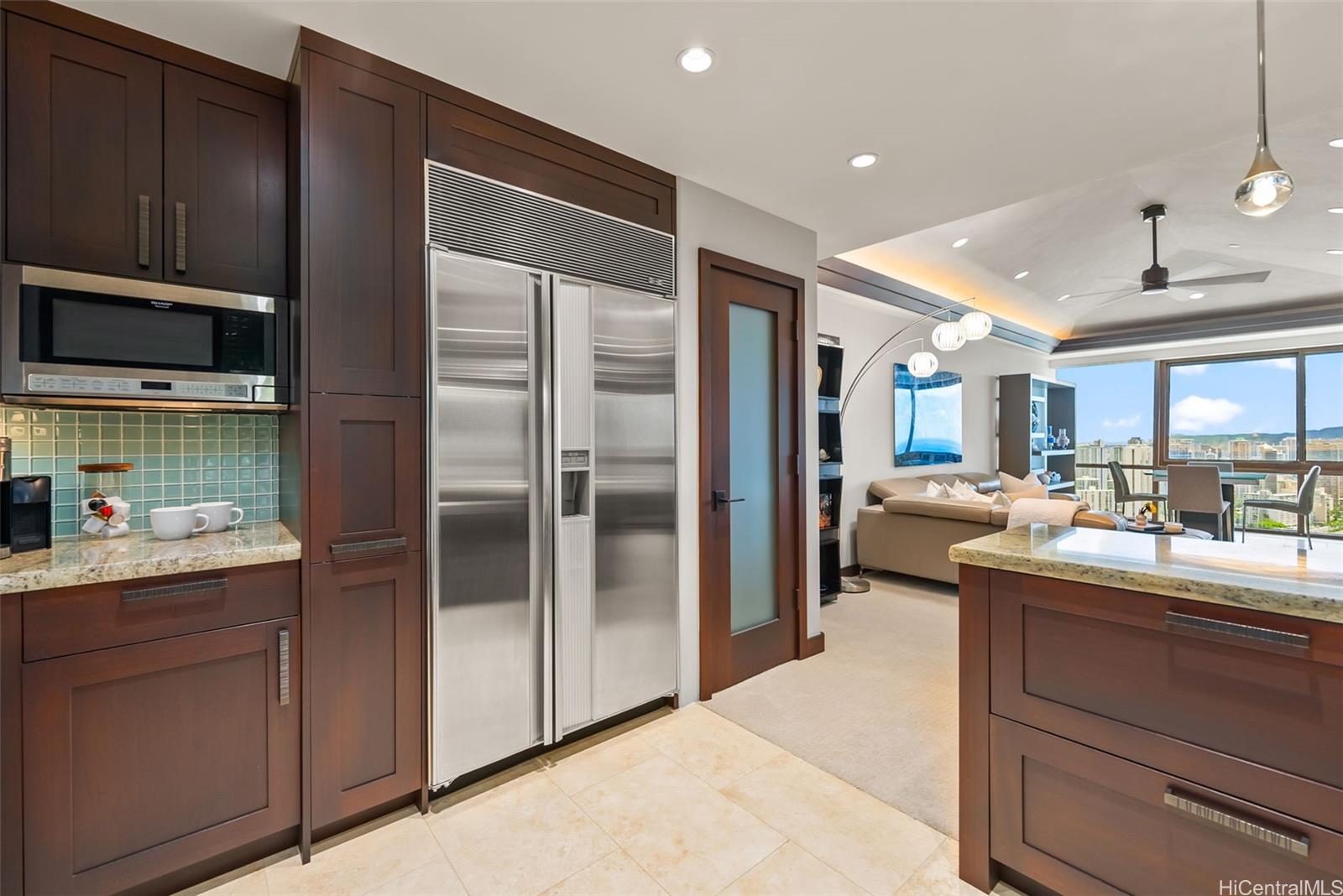 A Rare Opportunity for Elevated Island Living – 44th-Floor Residence in Hawaiki Towers. Experience luxury in this exquisitely renovated 2-bedroom, 2-bathroom residence perched on the 44th floor of the coveted Hawaiki Towers. Expansive floor-to-ceiling windows in living and bedrooms. This stunning home offers panoramic views of Magic Island, Ala Moana Beach Park, sunsets over Diamond Head, and the Koolau slopes. This fully furnished and redesigned (2006/2014) unit offers the perfect blend of luxury, convenience, and breathtaking views. Two secured covered parking stalls and storage, this home provides unbeatable comfort and functionality. Custom high-end finishes, including sapele wood cabinetry, gourmet kitchen, and a primary suite to enhance the refined living experience. Resort-style amenities make this property truly exceptional. The infinity-edge pool & spa offer a perfect place to relax, and the pickleball & tennis courts offer a great way to stay active. Located across from Ala Moana Center and just steps from the beach, this unit provides an unbeatable island lifestyle, where everything you need is right at your doorstep. See Video & 3D Tour Owner is Licensed HI Realtor